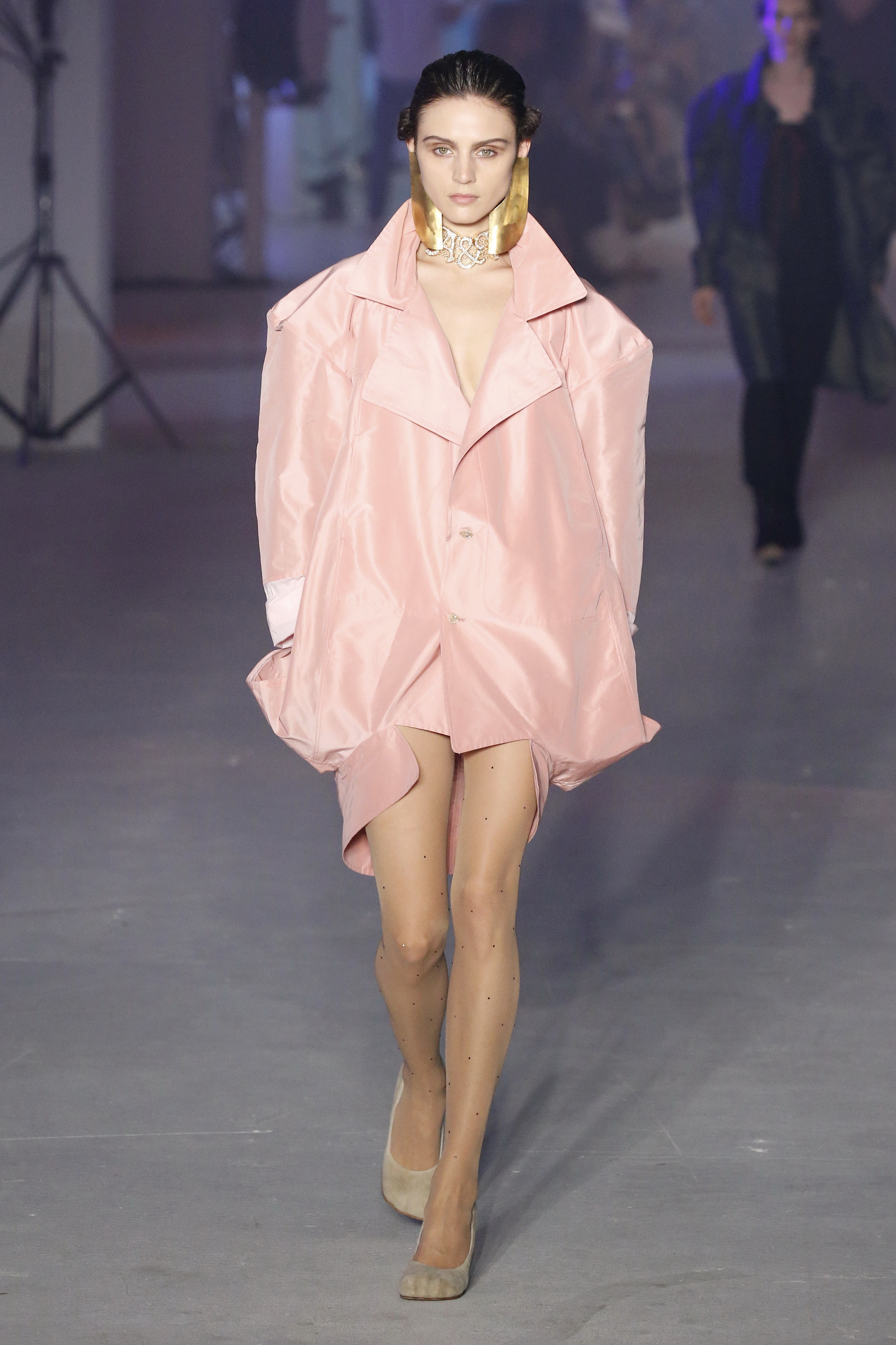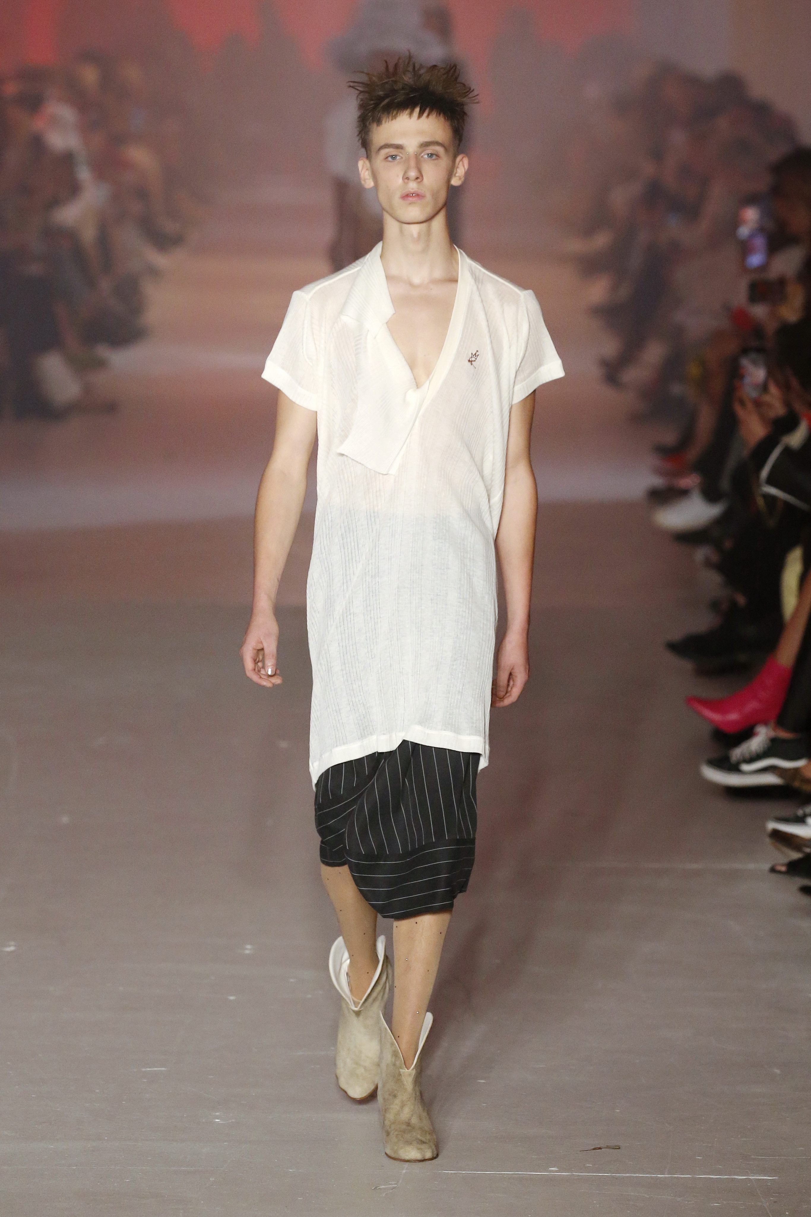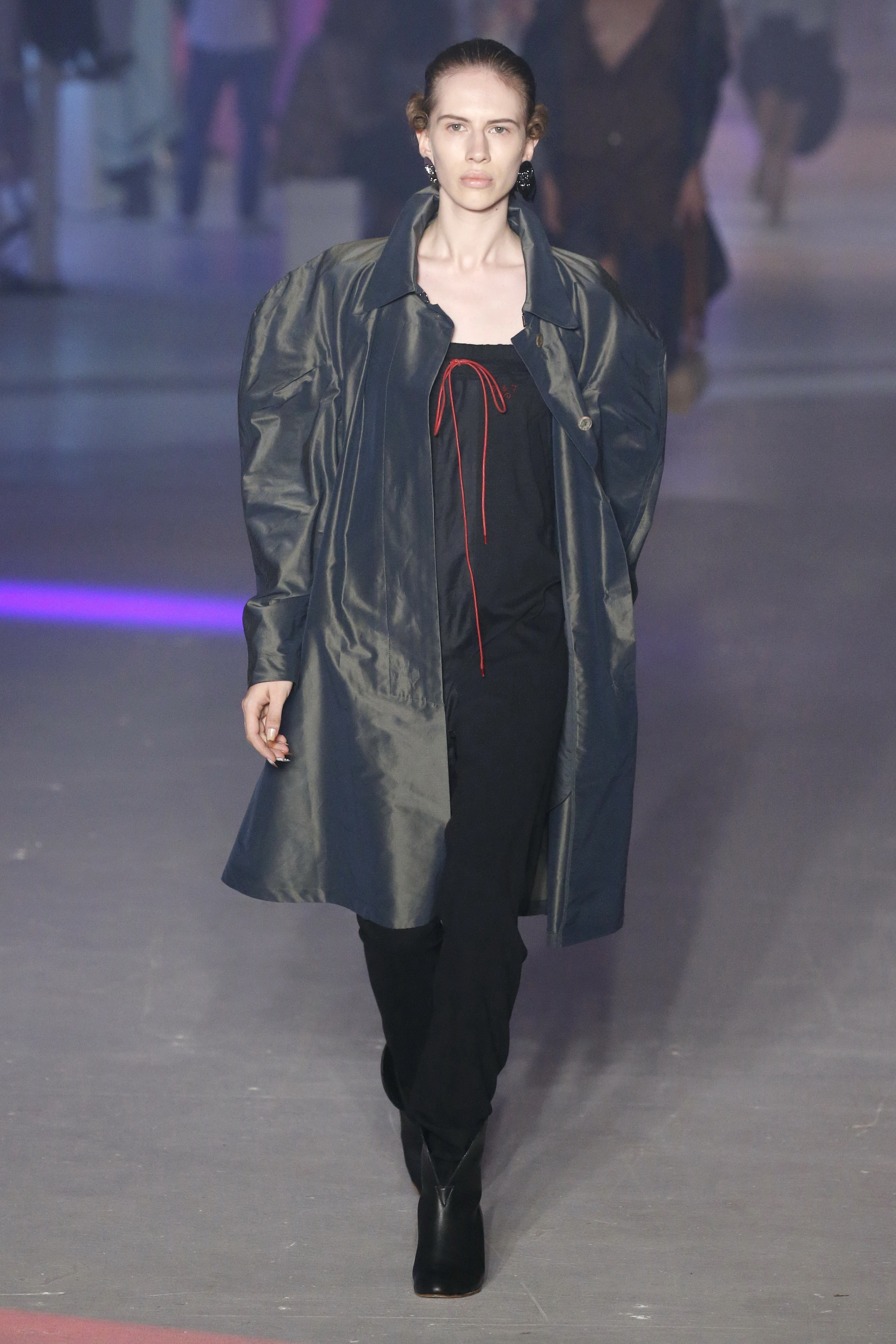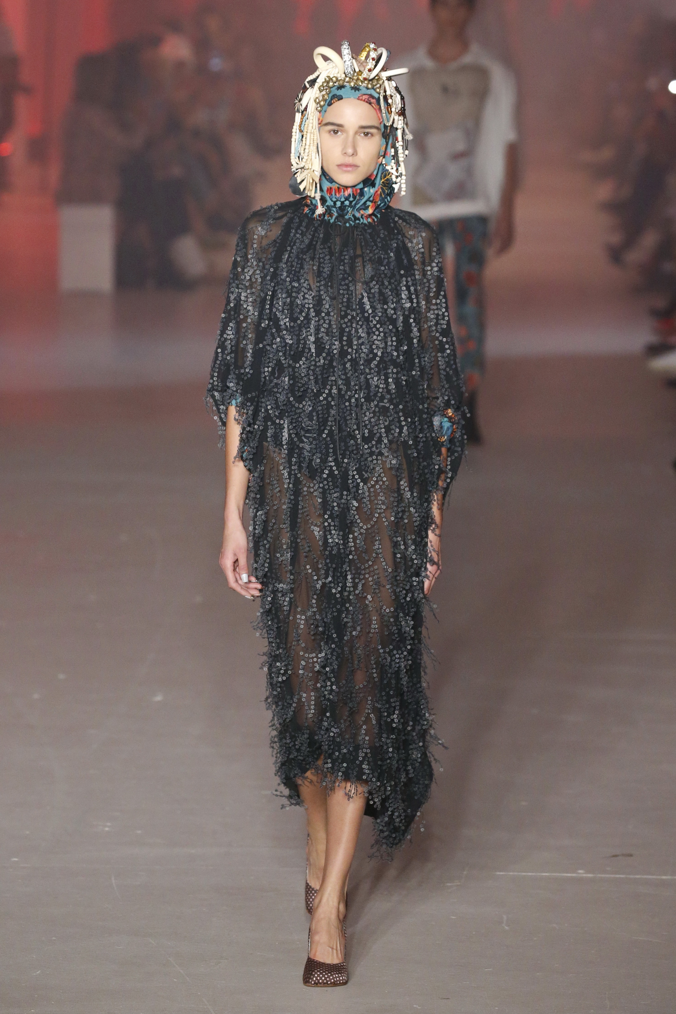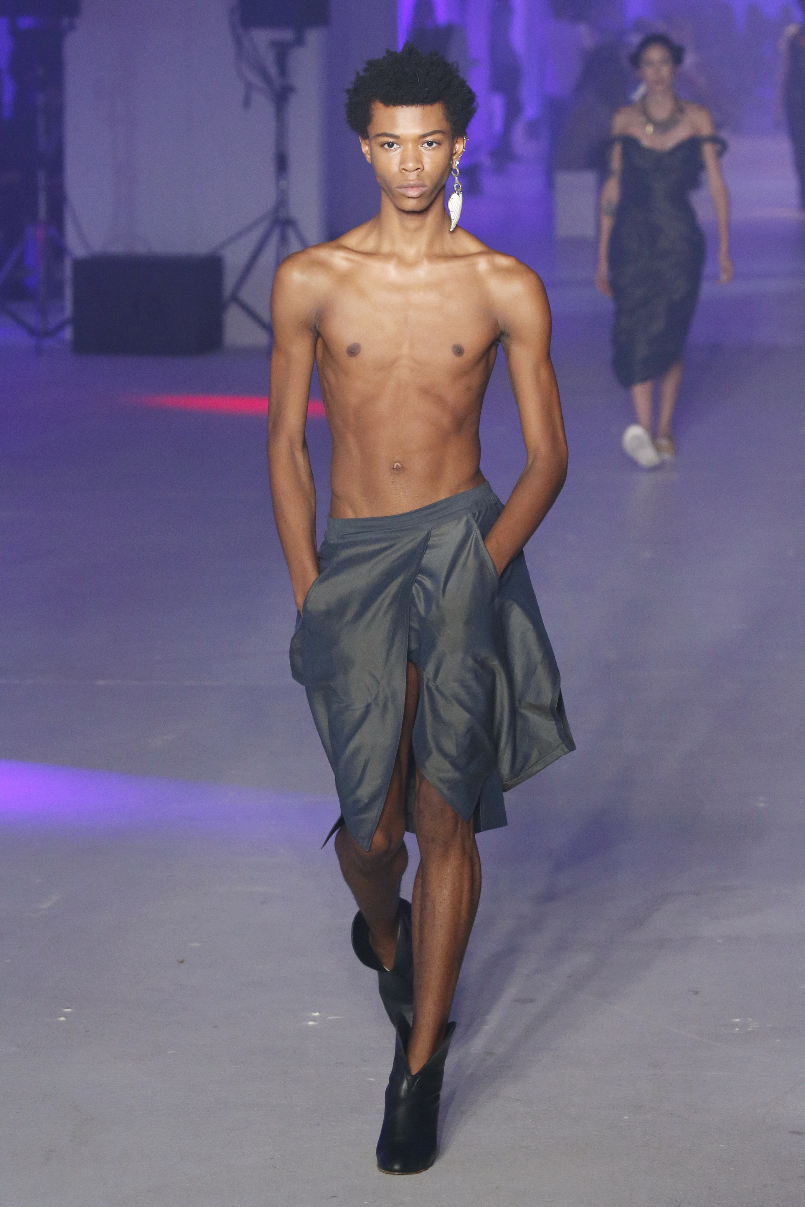 « Tout est connecté, ce qui n’était pas lié est soudainement connecté, c’est l’inspiration, l’intuition, la condition humaine. C’est ce que nous sommes, nous connectons les univers. J’ai épinglé les images sur le mur – J’ai vu l’image de la poignée d’une porte, la tête d’un homme dont les bras frappaient à la porte – l’alchimie. Cela s’est transformé en une boucle venant de l’épaule ou de la hanche qui souffle le vent, parfois longue, parfois courte, tournant autour. Ma première inspiration fut les nuages – les pin-up des années 50, photographiées d’en bas, comme si elles étaient dans le ciel avec des nuages de coton se jetant sur elles. J’aime la forme des nuages qui flottent sur le corps, les vêtements qui glissent du corps, la chemise qui tombe des hanches vers le sol. Les remettre de bas en haut, à l’envers, serrés autour des hanches : fais le toi-même. Nous avons travaillé avec Wastemark pour collecter des chutes de tissus dans les meilleures usines italiennes : réduire, réutiliser, repenser. J’aime le volume ; le colporteur, le vendeur ambulant, son stock transporté dans une cage attachée dans le dos, sa tête entourée de marchandises sur ses épaules – c’est un spectacle ambulant. Forme gonflée dans d’infinies possibilités : épaules, hanches bouffantes, grands chapeaux et parapluies. Armatures fournies par la coque rigide du corset – une base pour les étoffes virevoltantes de la Vénus de Botticelli. Pour la seconde saison nous avons travaillé en collaboration avec le projet ‘Ethical Fashion Initiative’ en utilisant du tissu artisanal provenant du Mali – Bogolan teint naturellement, signifiant « fait de terre », à motif damier. Nous avons réinventé un pied d’animal sur nos nouvelles paires de talon, Mozart aurait adoré. Tigre, tigre brûlant brillant, dans les forêts de la nuit. La coiffure du 18ème siècle, portée par chaque petit apprenti, c’est ingénieux, et quel casting ! Je n’ai jamais vu de telles créatures, elles viennent toutes d’un autre monde. Faisant surgir un conte de fées historique et géographique de l’espèce humaine, du microbe au robot.