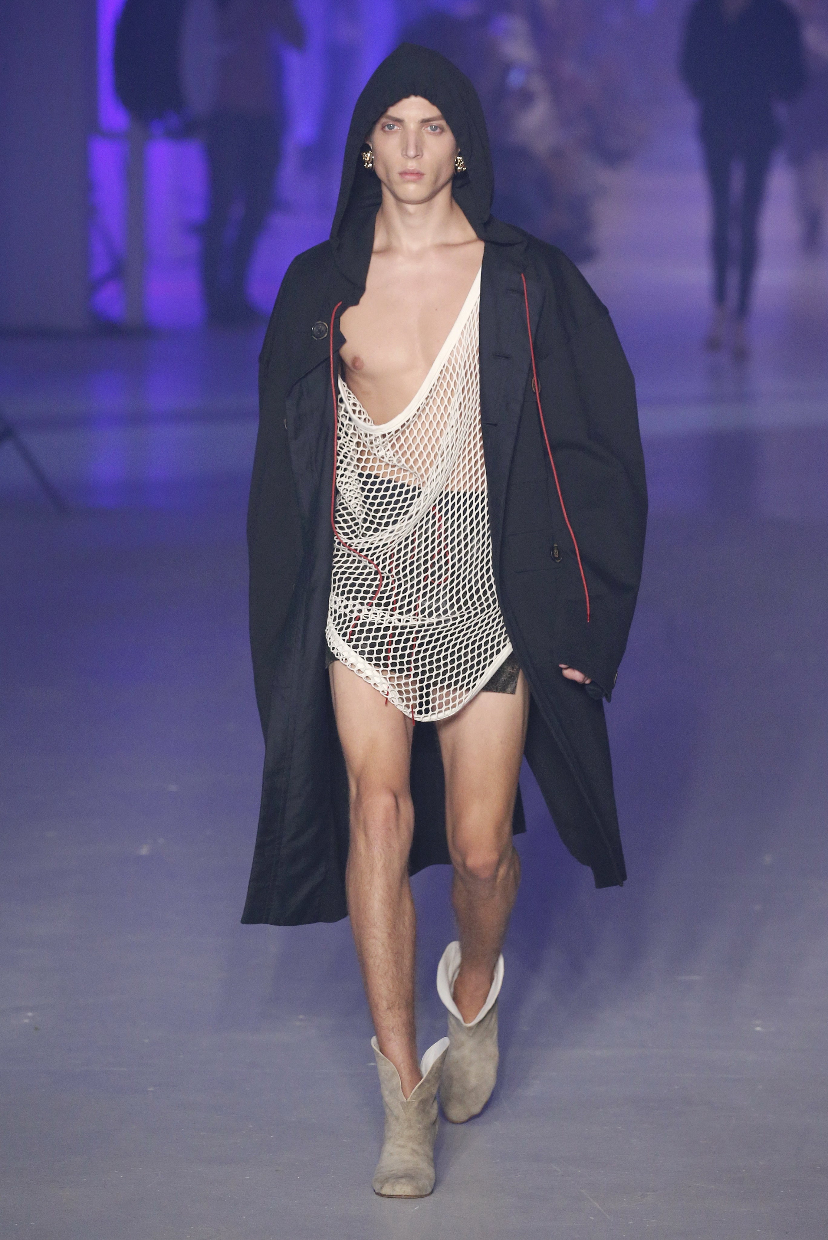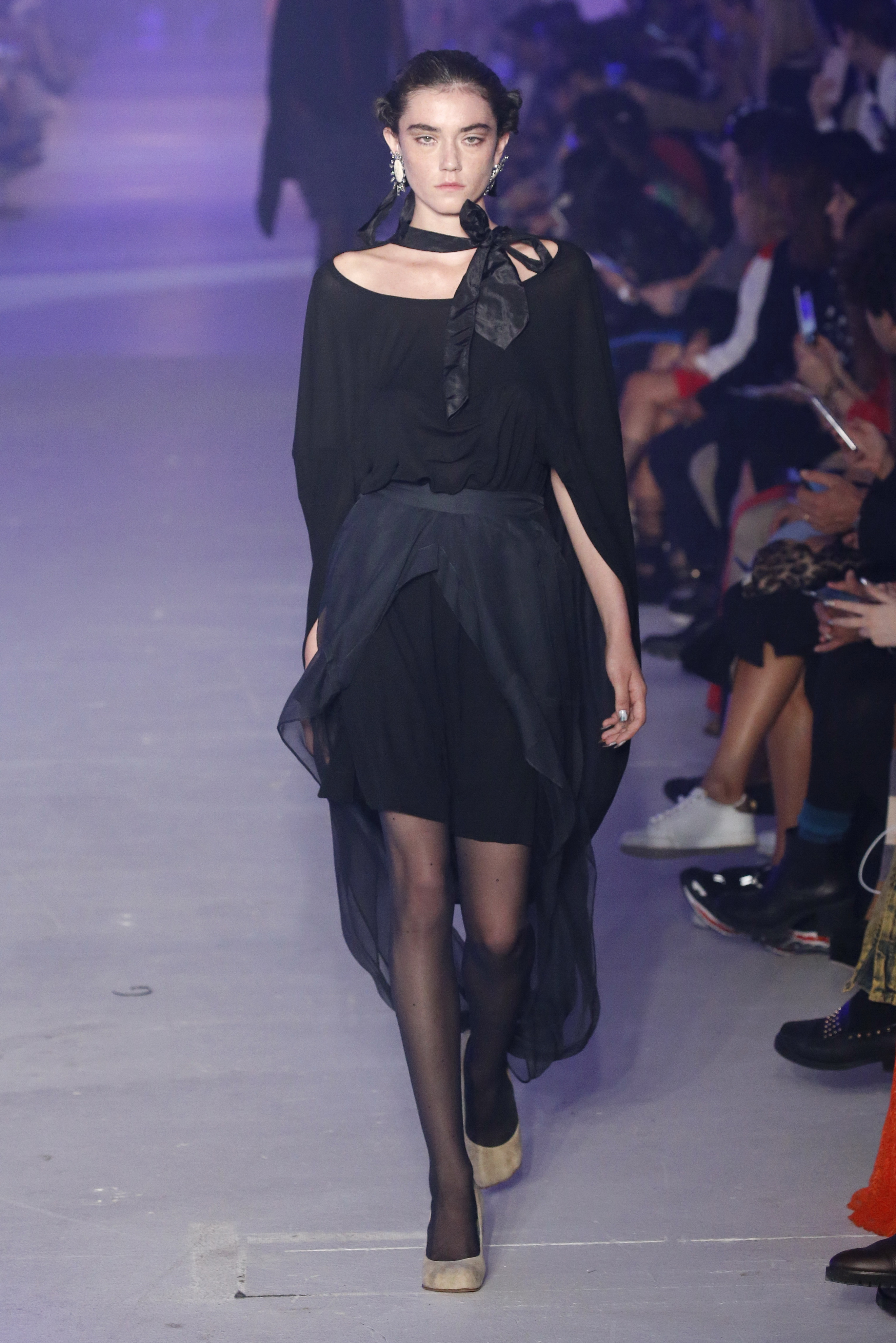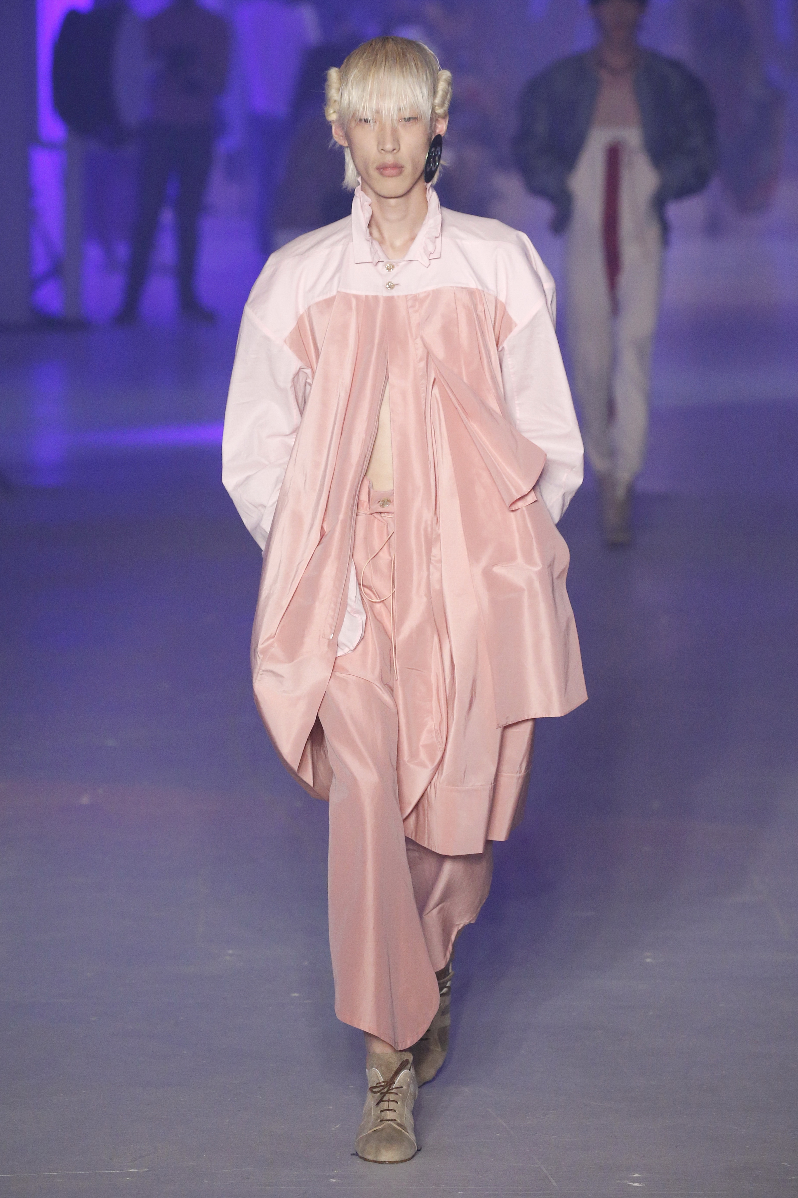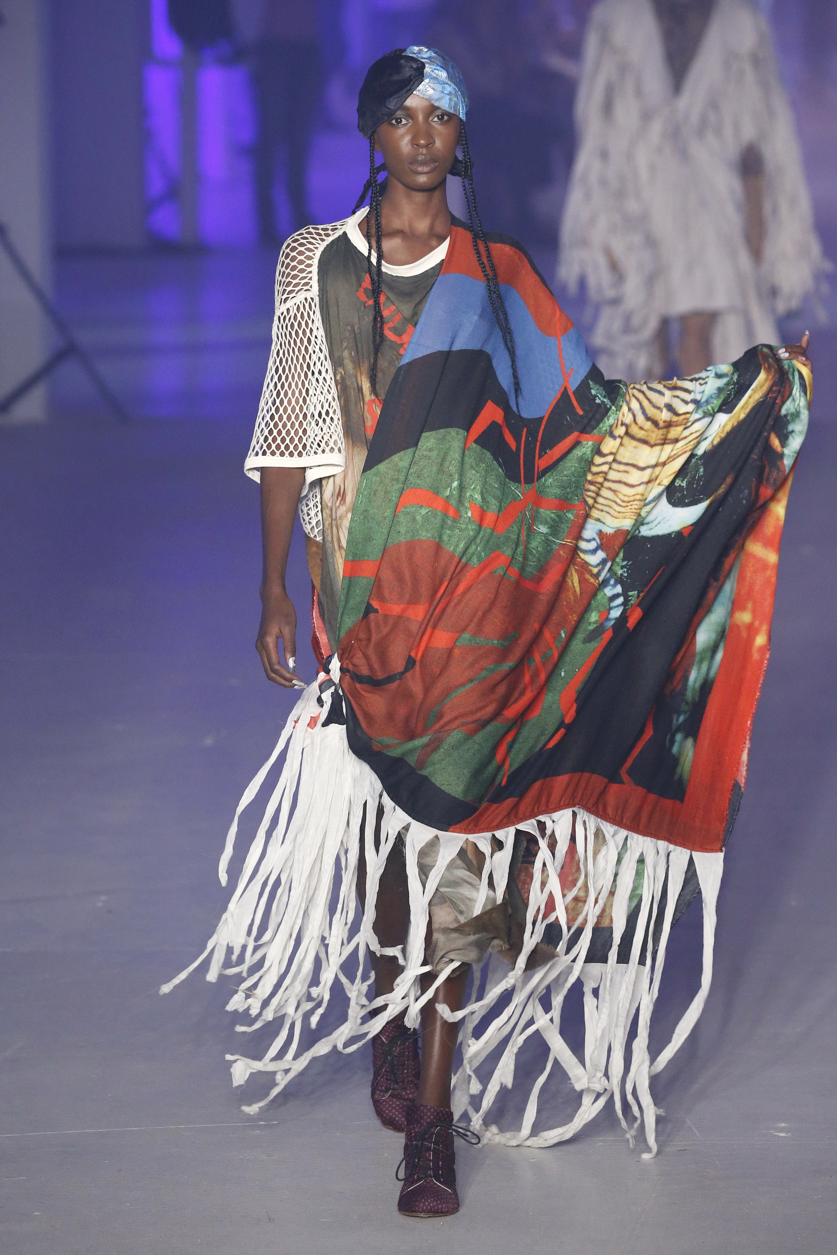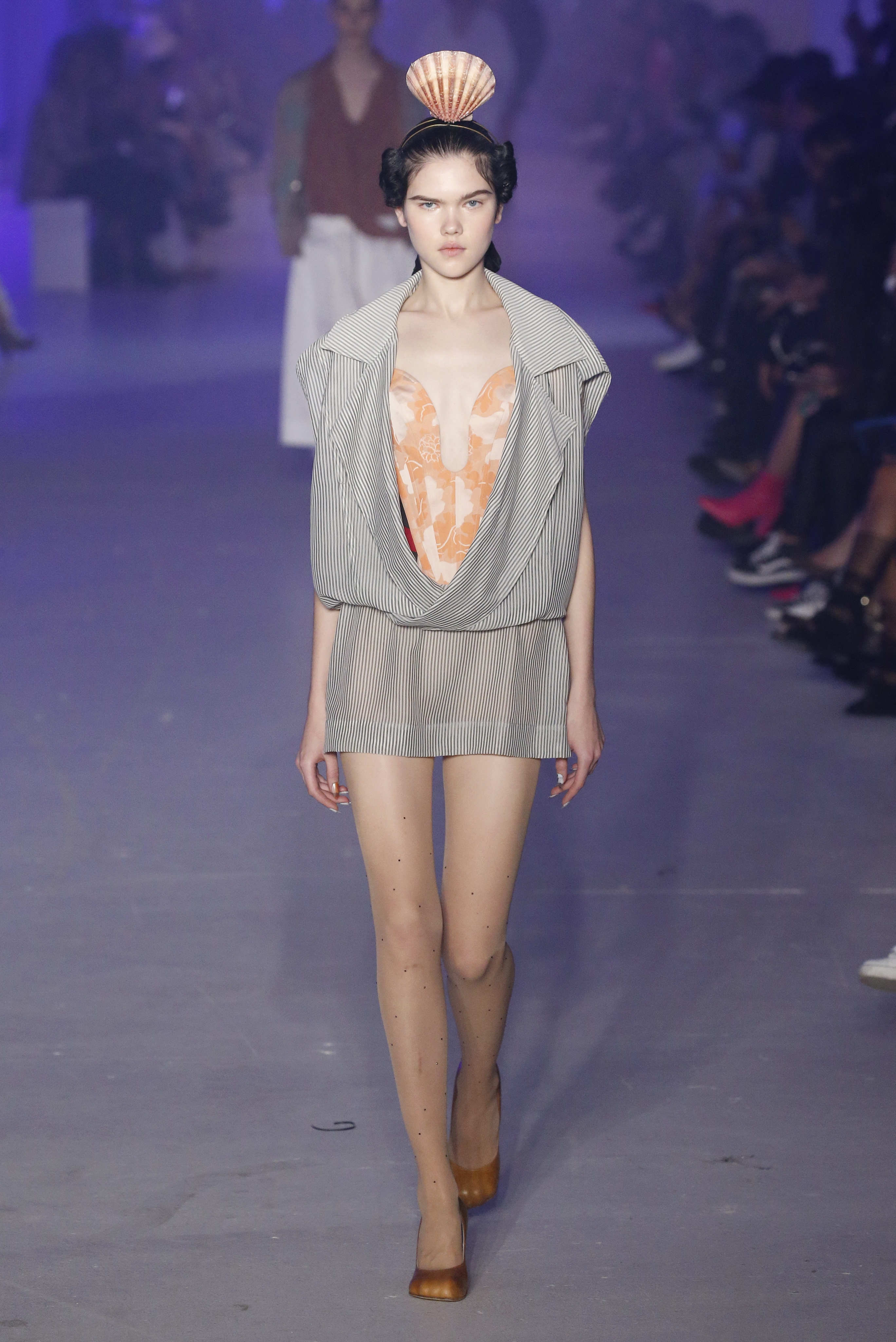 « Tout est connecté, ce qui n’était pas lié est soudainement connecté, c’est l’inspiration, l’intuition, la condition humaine. C’est ce que nous sommes, nous connectons les univers. J’ai épinglé les images sur le mur – J’ai vu l’image de la poignée d’une porte, la tête d’un homme dont les bras frappaient à la porte – l’alchimie. Cela s’est transformé en une boucle venant de l’épaule ou de la hanche qui souffle le vent, parfois longue, parfois courte, tournant autour. Ma première inspiration fut les nuages – les pin-up des années 50, photographiées d’en bas, comme si elles étaient dans le ciel avec des nuages de coton se jetant sur elles. J’aime la forme des nuages qui flottent sur le corps, les vêtements qui glissent du corps, la chemise qui tombe des hanches vers le sol. Les remettre de bas en haut, à l’envers, serrés autour des hanches : fais le toi-même. Nous avons travaillé avec Wastemark pour collecter des chutes de tissus dans les meilleures usines italiennes : réduire, réutiliser, repenser. J’aime le volume ; le colporteur, le vendeur ambulant, son stock transporté dans une cage attachée dans le dos, sa tête entourée de marchandises sur ses épaules – c’est un spectacle ambulant. Forme gonflée dans d’infinies possibilités : épaules, hanches bouffantes, grands chapeaux et parapluies. Armatures fournies par la coque rigide du corset – une base pour les étoffes virevoltantes de la Vénus de Botticelli. Pour la seconde saison nous avons travaillé en collaboration avec le projet ‘Ethical Fashion Initiative’ en utilisant du tissu artisanal provenant du Mali – Bogolan teint naturellement, signifiant « fait de terre », à motif damier. Nous avons réinventé un pied d’animal sur nos nouvelles paires de talon, Mozart aurait adoré. Tigre, tigre brûlant brillant, dans les forêts de la nuit. La coiffure du 18ème siècle, portée par chaque petit apprenti, c’est ingénieux, et quel casting ! Je n’ai jamais vu de telles créatures, elles viennent toutes d’un autre monde. Faisant surgir un conte de fées historique et géographique de l’espèce humaine, du microbe au robot.