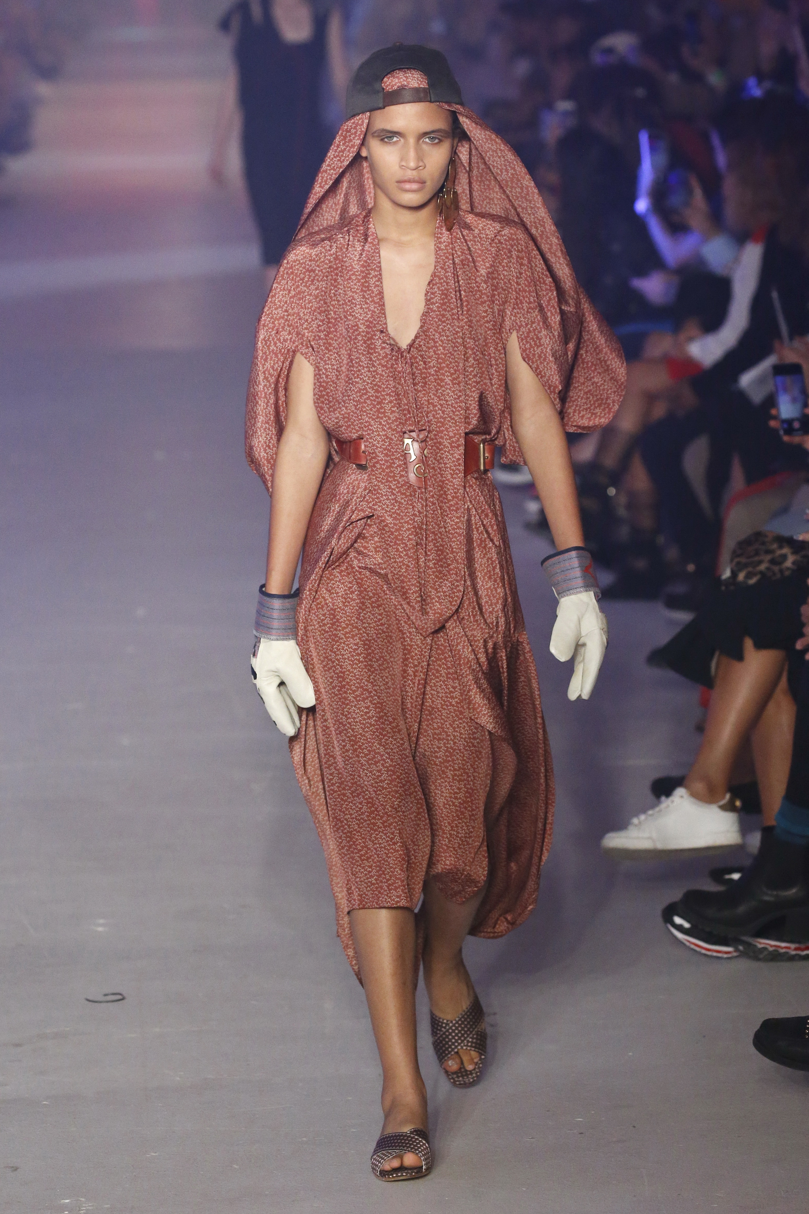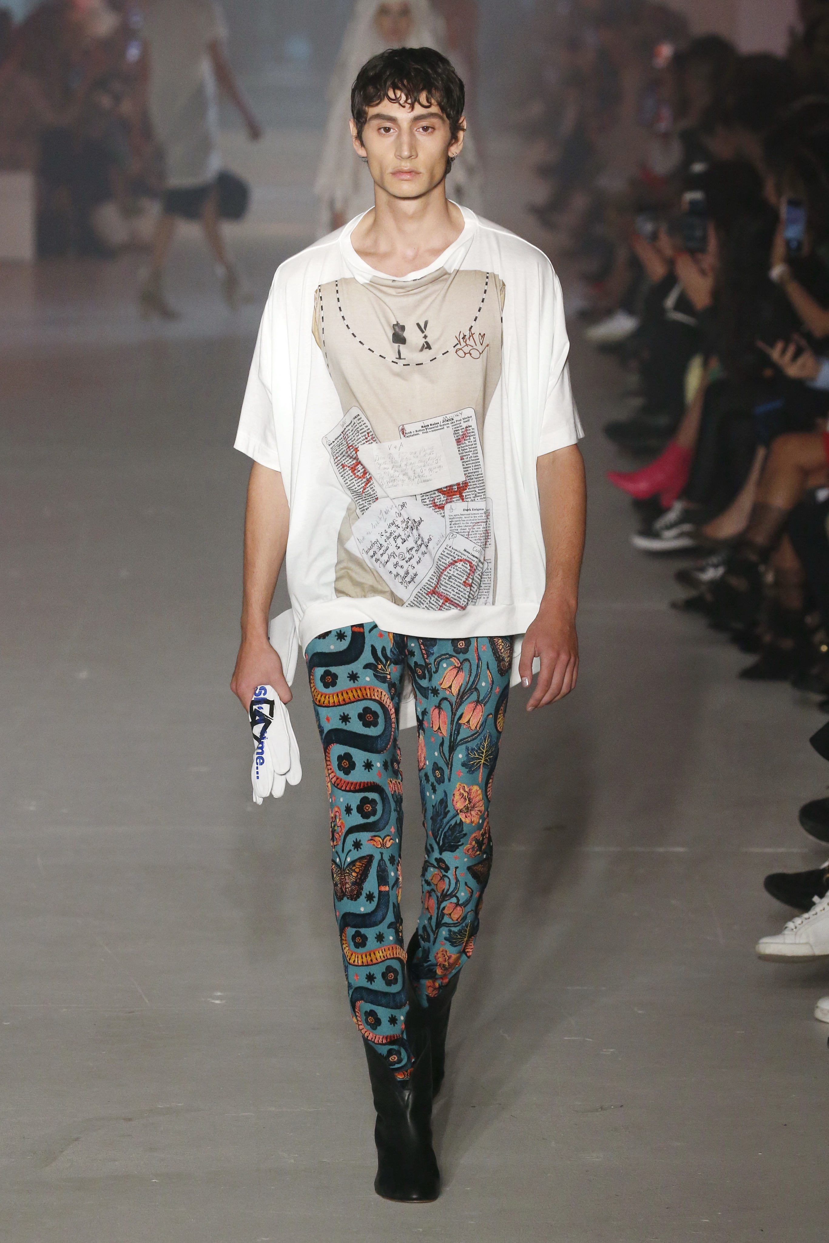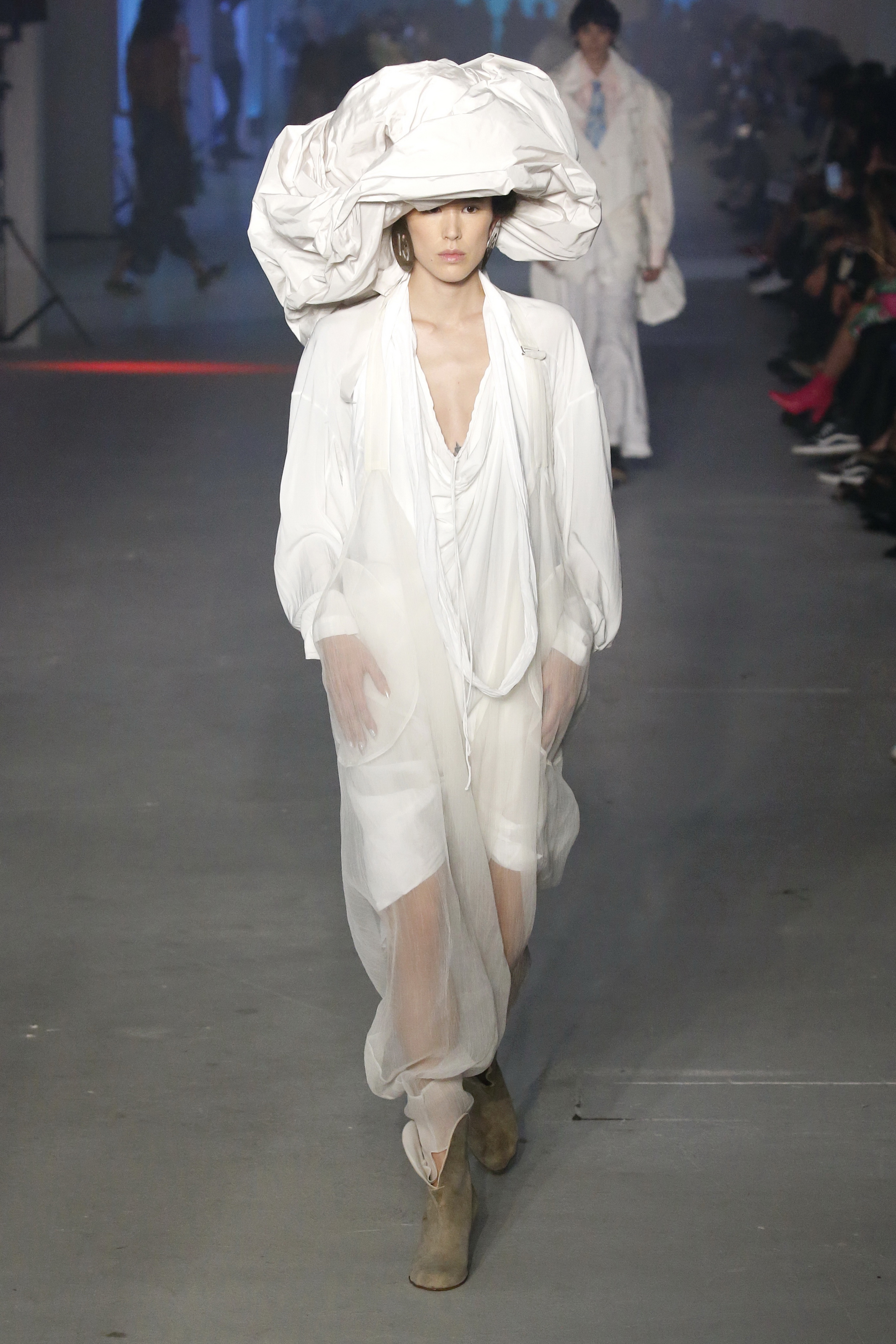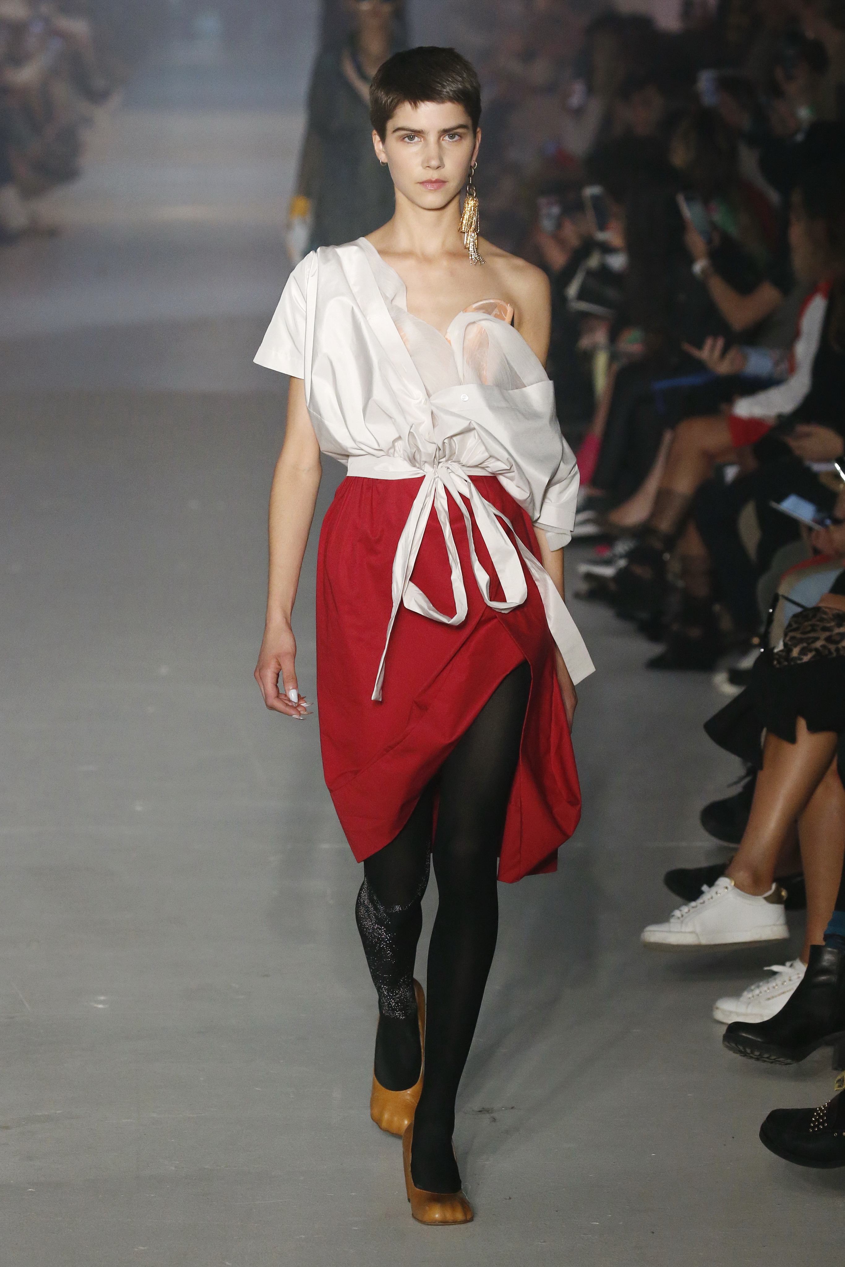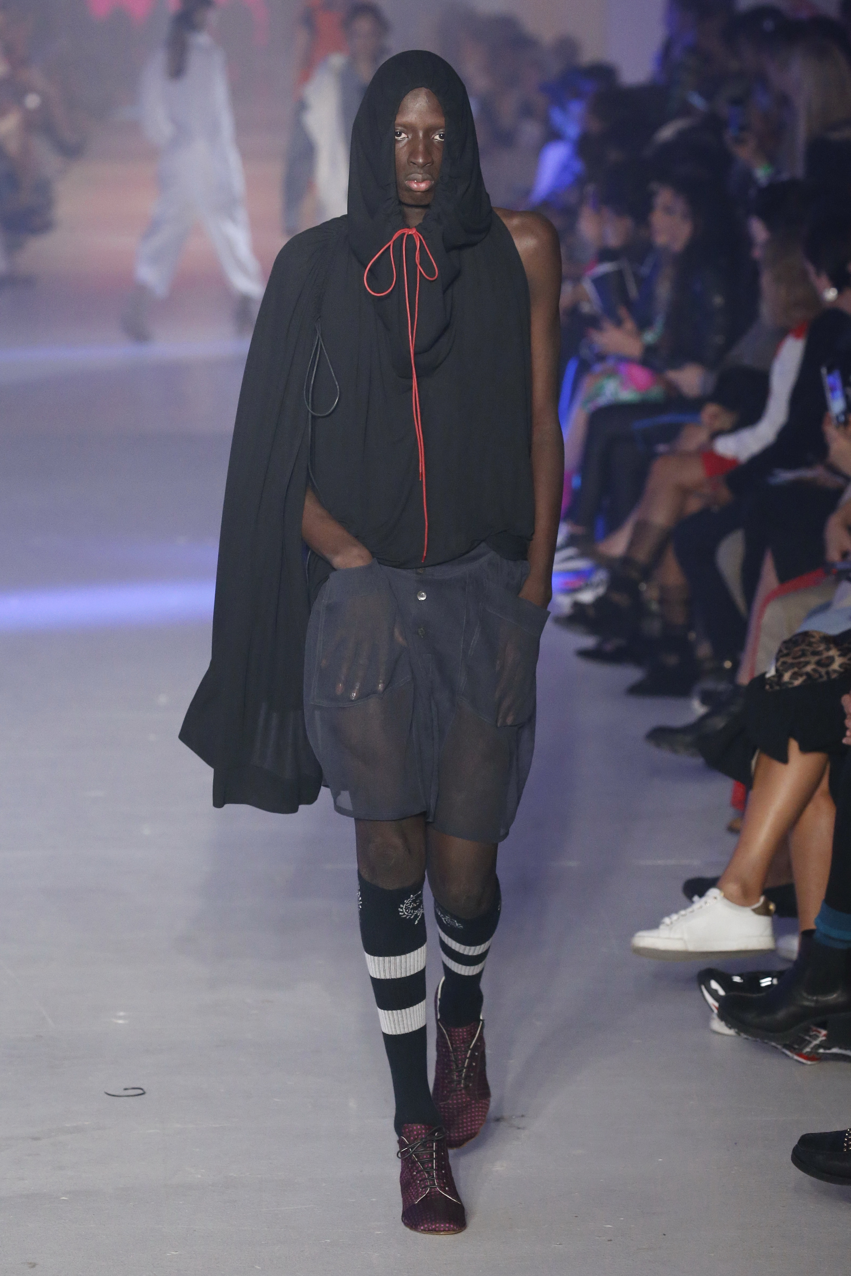 « Tout est connecté, ce qui n’était pas lié est soudainement connecté, c’est l’inspiration, l’intuition, la condition humaine. C’est ce que nous sommes, nous connectons les univers. J’ai épinglé les images sur le mur – J’ai vu l’image de la poignée d’une porte, la tête d’un homme dont les bras frappaient à la porte – l’alchimie. Cela s’est transformé en une boucle venant de l’épaule ou de la hanche qui souffle le vent, parfois longue, parfois courte, tournant autour. Ma première inspiration fut les nuages – les pin-up des années 50, photographiées d’en bas, comme si elles étaient dans le ciel avec des nuages de coton se jetant sur elles. J’aime la forme des nuages qui flottent sur le corps, les vêtements qui glissent du corps, la chemise qui tombe des hanches vers le sol. Les remettre de bas en haut, à l’envers, serrés autour des hanches : fais le toi-même. Nous avons travaillé avec Wastemark pour collecter des chutes de tissus dans les meilleures usines italiennes : réduire, réutiliser, repenser. J’aime le volume ; le colporteur, le vendeur ambulant, son stock transporté dans une cage attachée dans le dos, sa tête entourée de marchandises sur ses épaules – c’est un spectacle ambulant. Forme gonflée dans d’infinies possibilités : épaules, hanches bouffantes, grands chapeaux et parapluies. Armatures fournies par la coque rigide du corset – une base pour les étoffes virevoltantes de la Vénus de Botticelli. Pour la seconde saison nous avons travaillé en collaboration avec le projet ‘Ethical Fashion Initiative’ en utilisant du tissu artisanal provenant du Mali – Bogolan teint naturellement, signifiant « fait de terre », à motif damier. Nous avons réinventé un pied d’animal sur nos nouvelles paires de talon, Mozart aurait adoré. Tigre, tigre brûlant brillant, dans les forêts de la nuit. La coiffure du 18ème siècle, portée par chaque petit apprenti, c’est ingénieux, et quel casting ! Je n’ai jamais vu de telles créatures, elles viennent toutes d’un autre monde. Faisant surgir un conte de fées historique et géographique de l’espèce humaine, du microbe au robot.