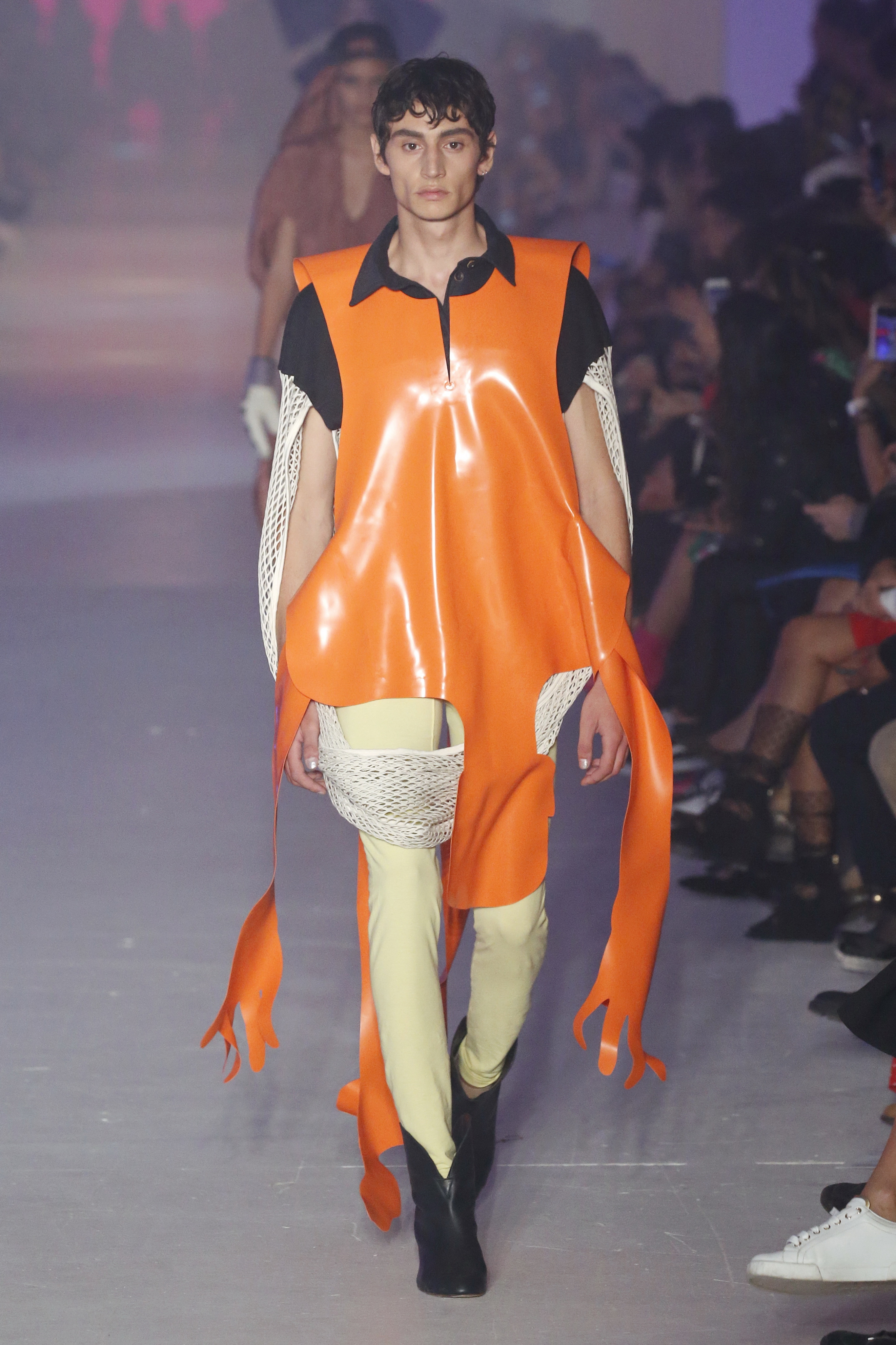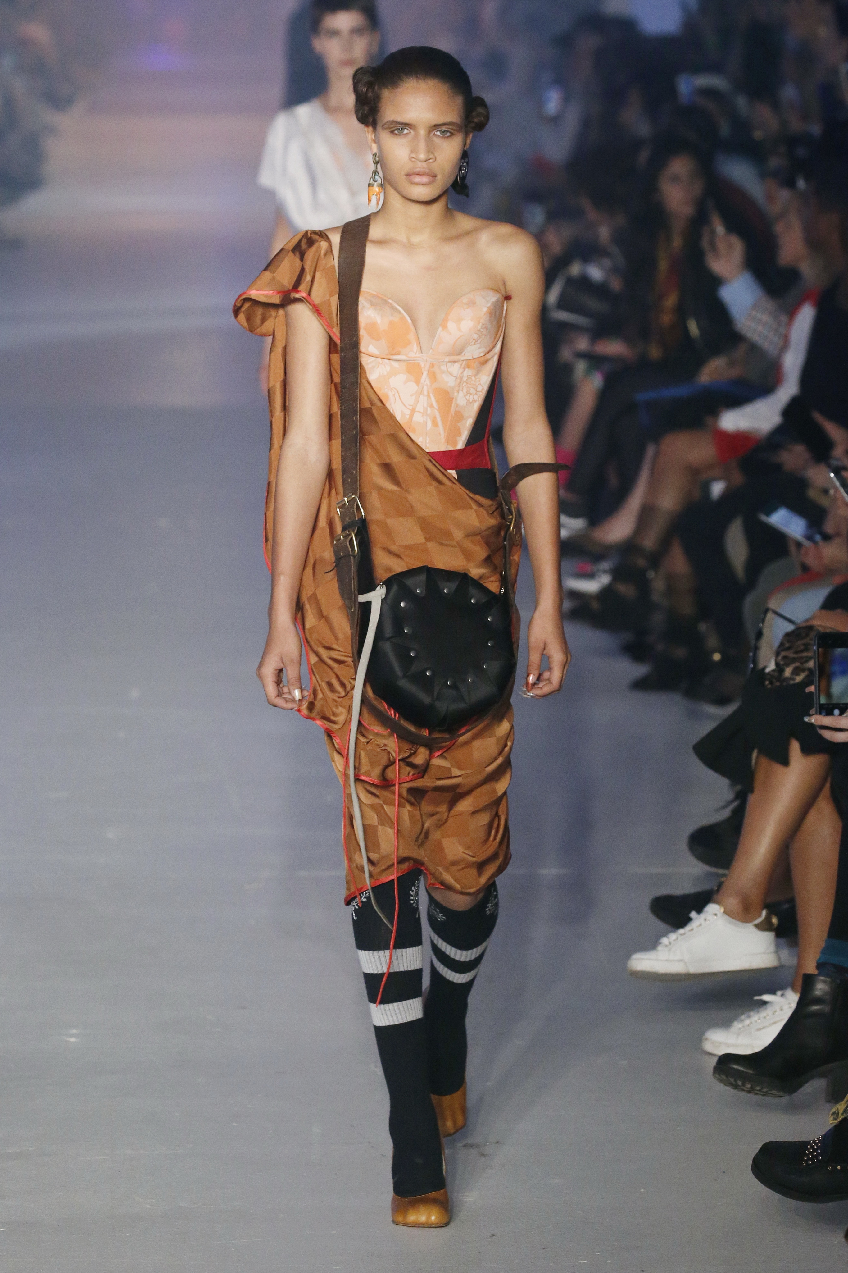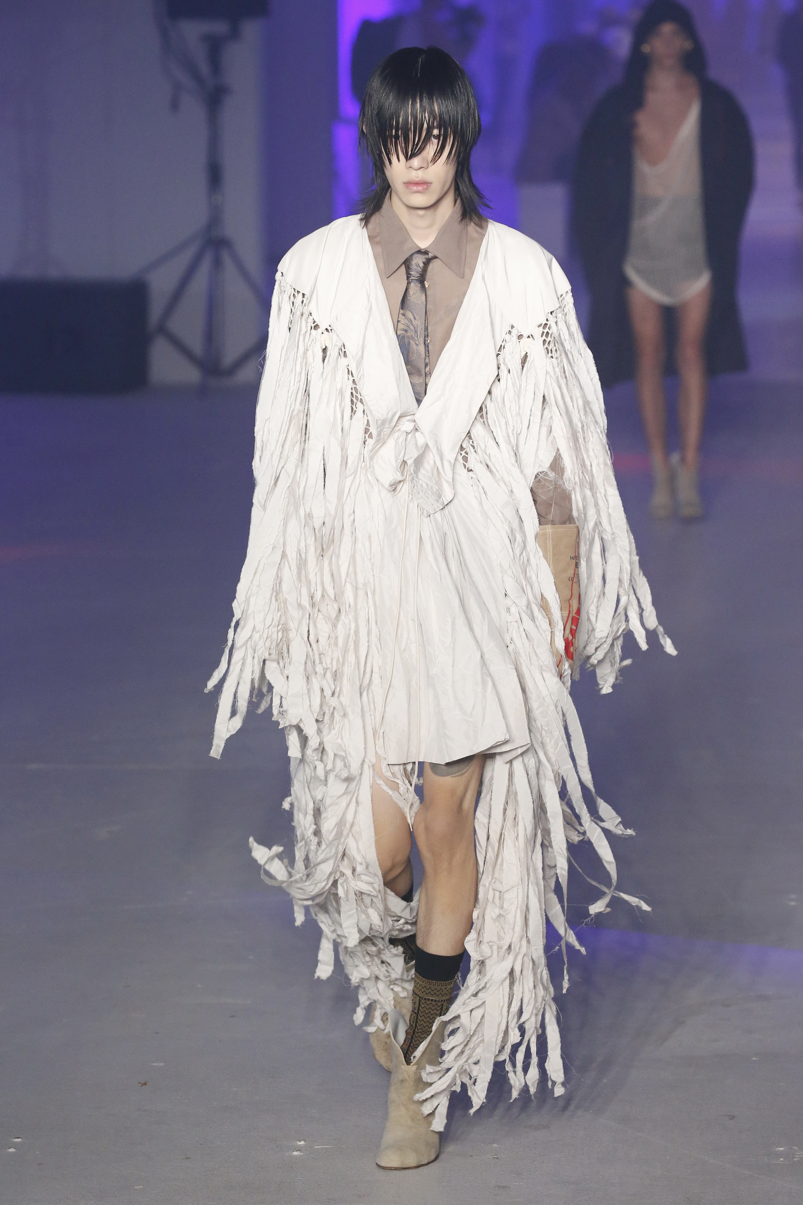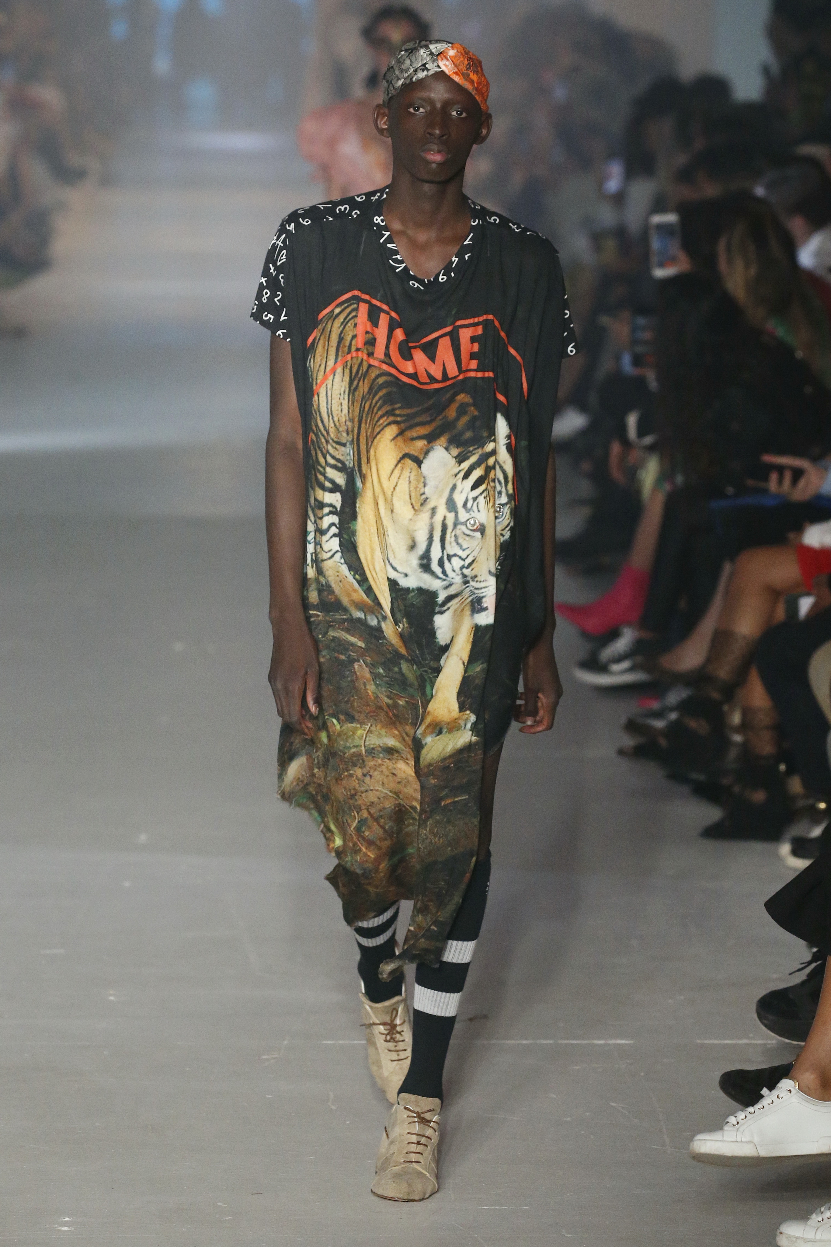 « Tout est connecté, ce qui n’était pas lié est soudainement connecté, c’est l’inspiration, l’intuition, la condition humaine. C’est ce que nous sommes, nous connectons les univers. J’ai épinglé les images sur le mur – J’ai vu l’image de la poignée d’une porte, la tête d’un homme dont les bras frappaient à la porte – l’alchimie. Cela s’est transformé en une boucle venant de l’épaule ou de la hanche qui souffle le vent, parfois longue, parfois courte, tournant autour. Ma première inspiration fut les nuages – les pin-up des années 50, photographiées d’en bas, comme si elles étaient dans le ciel avec des nuages de coton se jetant sur elles. J’aime la forme des nuages qui flottent sur le corps, les vêtements qui glissent du corps, la chemise qui tombe des hanches vers le sol. Les remettre de bas en haut, à l’envers, serrés autour des hanches : fais le toi-même. Nous avons travaillé avec Wastemark pour collecter des chutes de tissus dans les meilleures usines italiennes : réduire, réutiliser, repenser. J’aime le volume ; le colporteur, le vendeur ambulant, son stock transporté dans une cage attachée dans le dos, sa tête entourée de marchandises sur ses épaules – c’est un spectacle ambulant. Forme gonflée dans d’infinies possibilités : épaules, hanches bouffantes, grands chapeaux et parapluies. Armatures fournies par la coque rigide du corset – une base pour les étoffes virevoltantes de la Vénus de Botticelli. Pour la seconde saison nous avons travaillé en collaboration avec le projet ‘Ethical Fashion Initiative’ en utilisant du tissu artisanal provenant du Mali – Bogolan teint naturellement, signifiant « fait de terre », à motif damier. Nous avons réinventé un pied d’animal sur nos nouvelles paires de talon, Mozart aurait adoré. Tigre, tigre brûlant brillant, dans les forêts de la nuit. La coiffure du 18ème siècle, portée par chaque petit apprenti, c’est ingénieux, et quel casting ! Je n’ai jamais vu de telles créatures, elles viennent toutes d’un autre monde. Faisant surgir un conte de fées historique et géographique de l’espèce humaine, du microbe au robot.