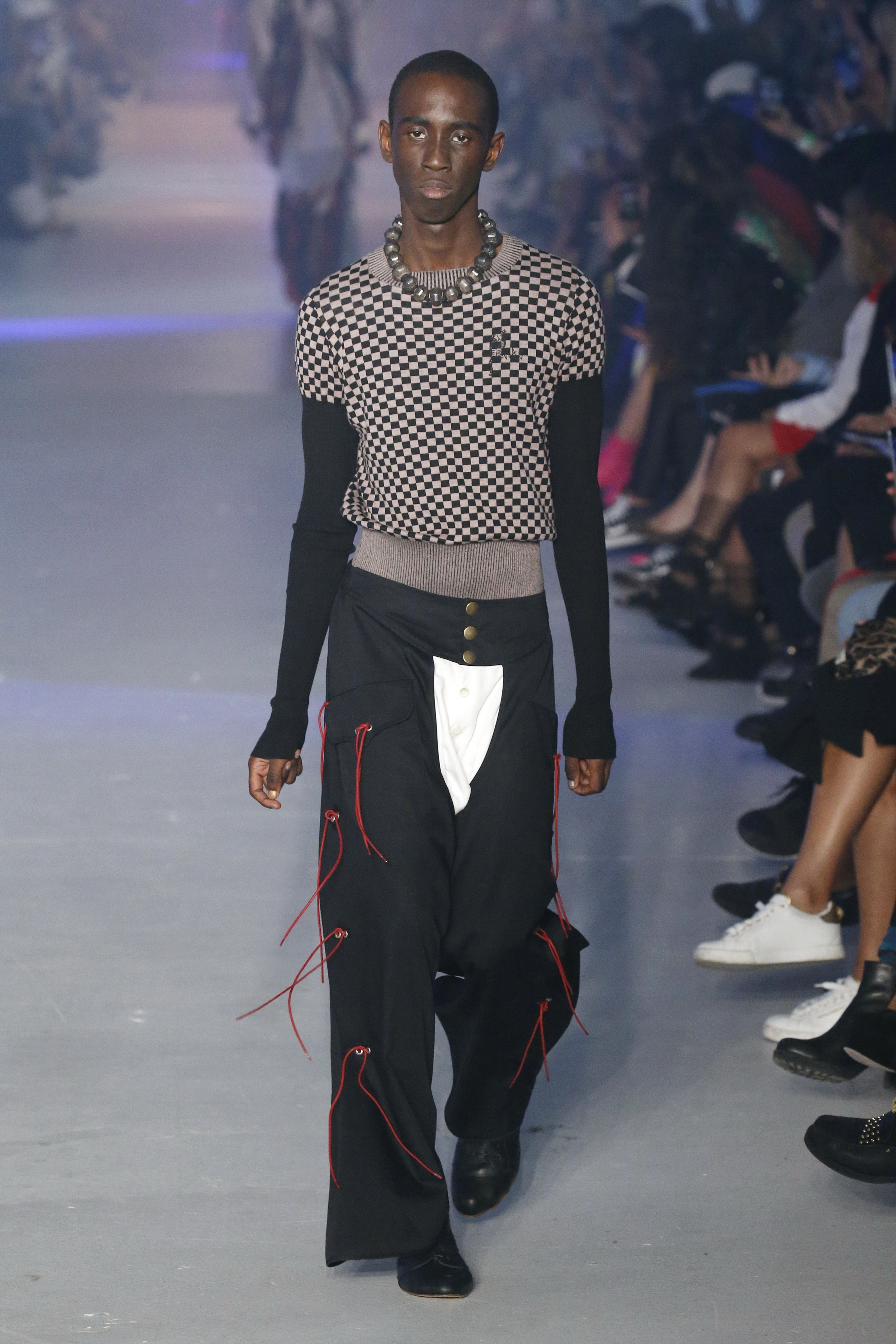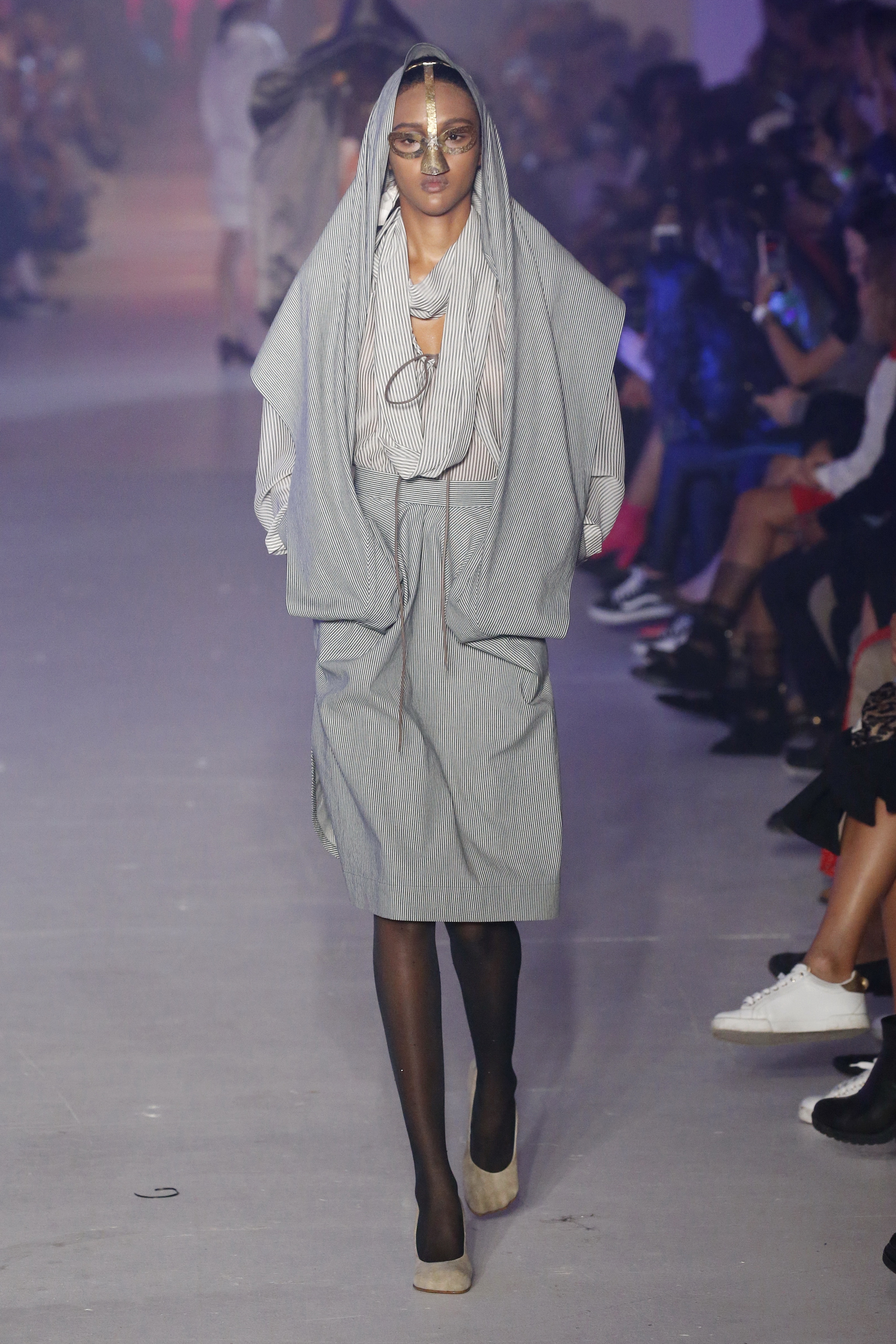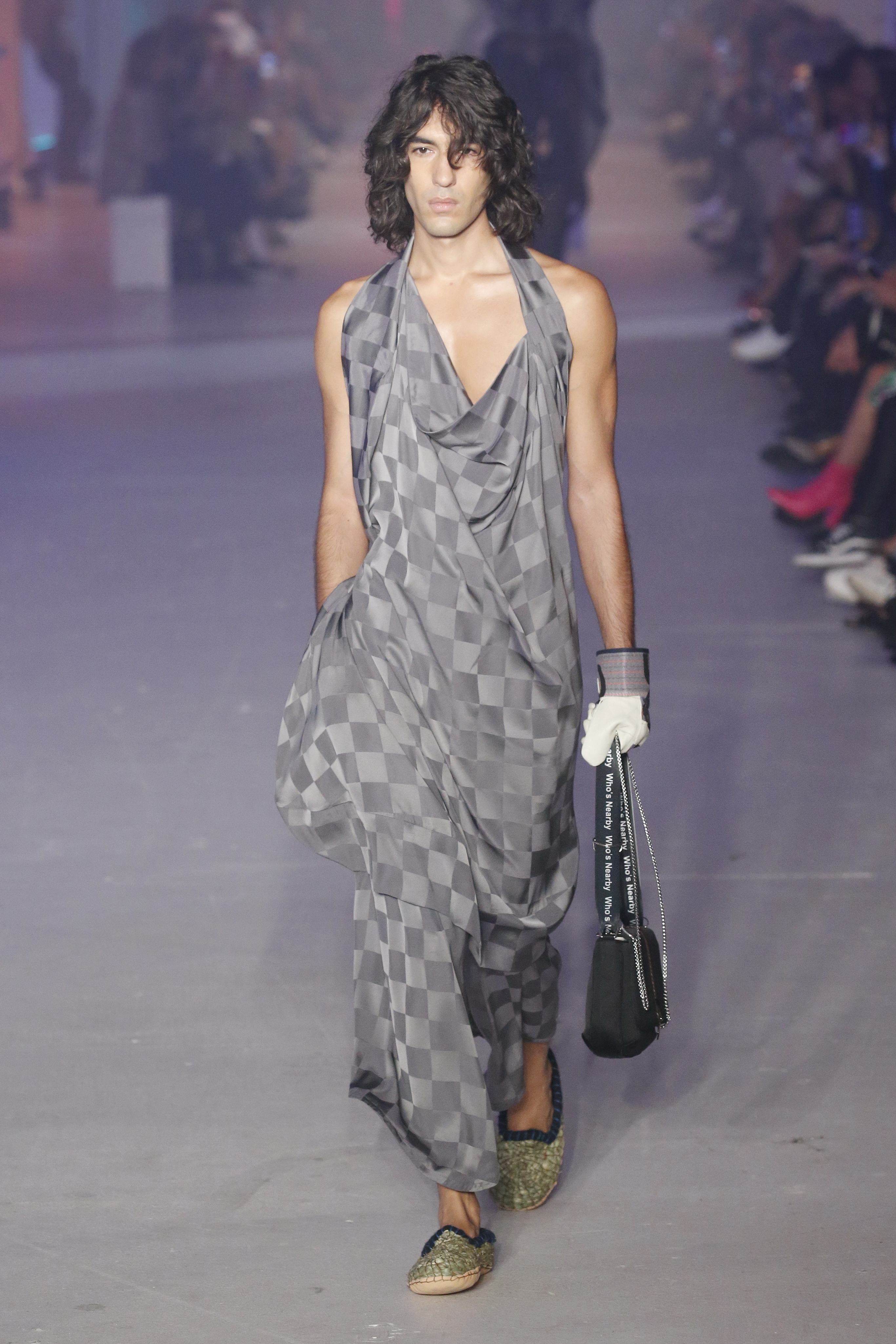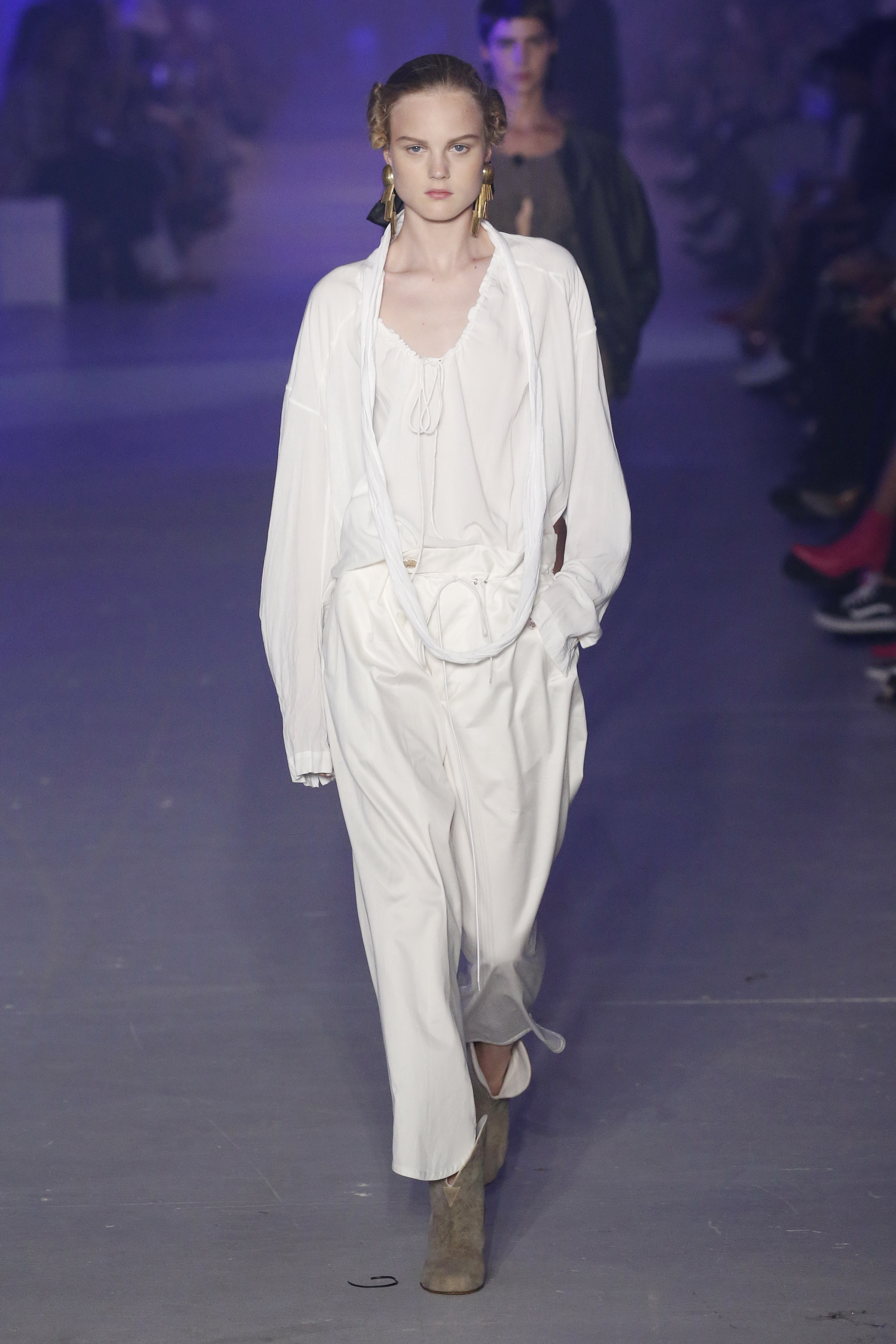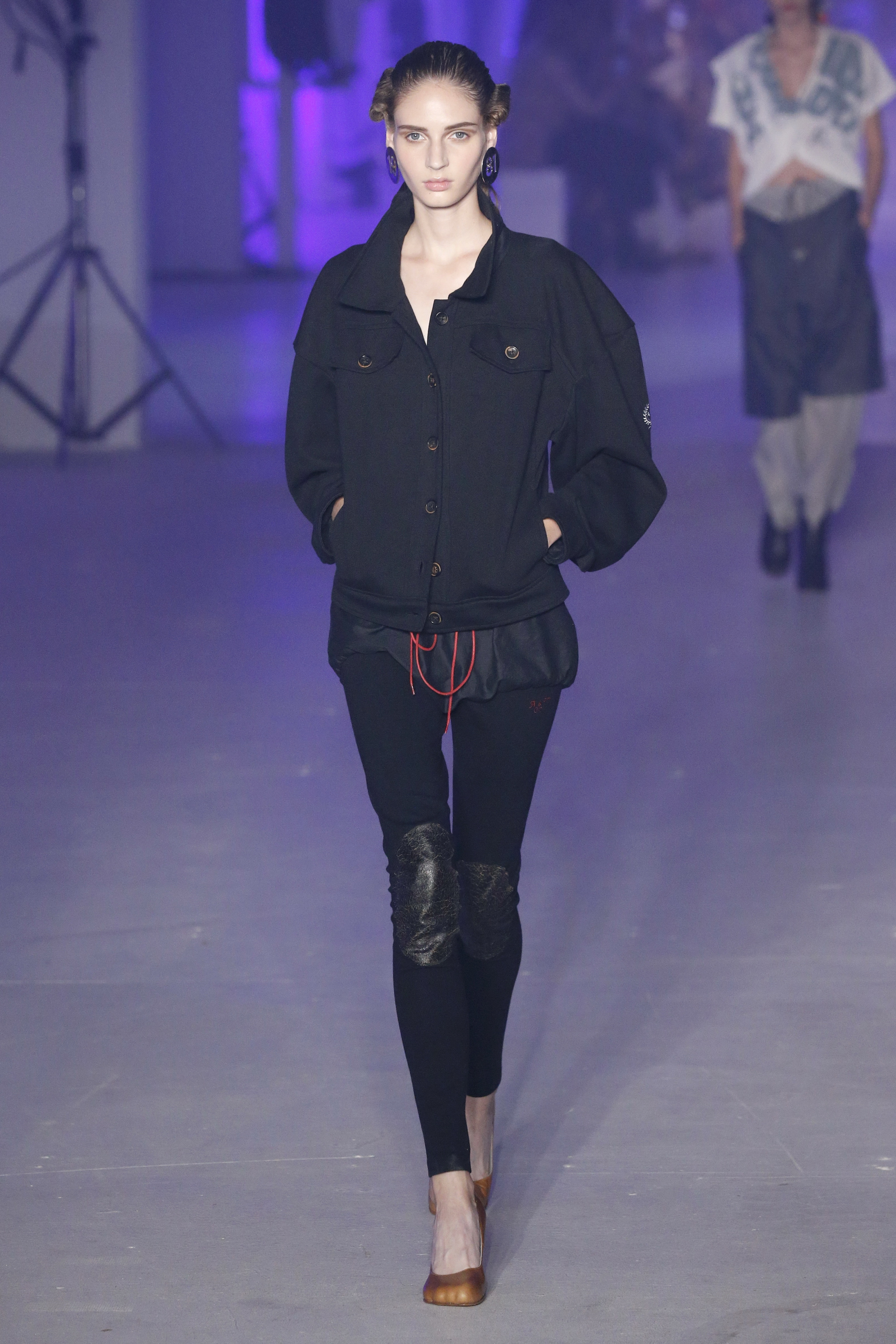 « Tout est connecté, ce qui n’était pas lié est soudainement connecté, c’est l’inspiration, l’intuition, la condition humaine. C’est ce que nous sommes, nous connectons les univers. J’ai épinglé les images sur le mur – J’ai vu l’image de la poignée d’une porte, la tête d’un homme dont les bras frappaient à la porte – l’alchimie. Cela s’est transformé en une boucle venant de l’épaule ou de la hanche qui souffle le vent, parfois longue, parfois courte, tournant autour. Ma première inspiration fut les nuages – les pin-up des années 50, photographiées d’en bas, comme si elles étaient dans le ciel avec des nuages de coton se jetant sur elles. J’aime la forme des nuages qui flottent sur le corps, les vêtements qui glissent du corps, la chemise qui tombe des hanches vers le sol. Les remettre de bas en haut, à l’envers, serrés autour des hanches : fais le toi-même. Nous avons travaillé avec Wastemark pour collecter des chutes de tissus dans les meilleures usines italiennes : réduire, réutiliser, repenser. J’aime le volume ; le colporteur, le vendeur ambulant, son stock transporté dans une cage attachée dans le dos, sa tête entourée de marchandises sur ses épaules – c’est un spectacle ambulant. Forme gonflée dans d’infinies possibilités : épaules, hanches bouffantes, grands chapeaux et parapluies. Armatures fournies par la coque rigide du corset – une base pour les étoffes virevoltantes de la Vénus de Botticelli. Pour la seconde saison nous avons travaillé en collaboration avec le projet ‘Ethical Fashion Initiative’ en utilisant du tissu artisanal provenant du Mali – Bogolan teint naturellement, signifiant « fait de terre », à motif damier. Nous avons réinventé un pied d’animal sur nos nouvelles paires de talon, Mozart aurait adoré. Tigre, tigre brûlant brillant, dans les forêts de la nuit. La coiffure du 18ème siècle, portée par chaque petit apprenti, c’est ingénieux, et quel casting ! Je n’ai jamais vu de telles créatures, elles viennent toutes d’un autre monde. Faisant surgir un conte de fées historique et géographique de l’espèce humaine, du microbe au robot.