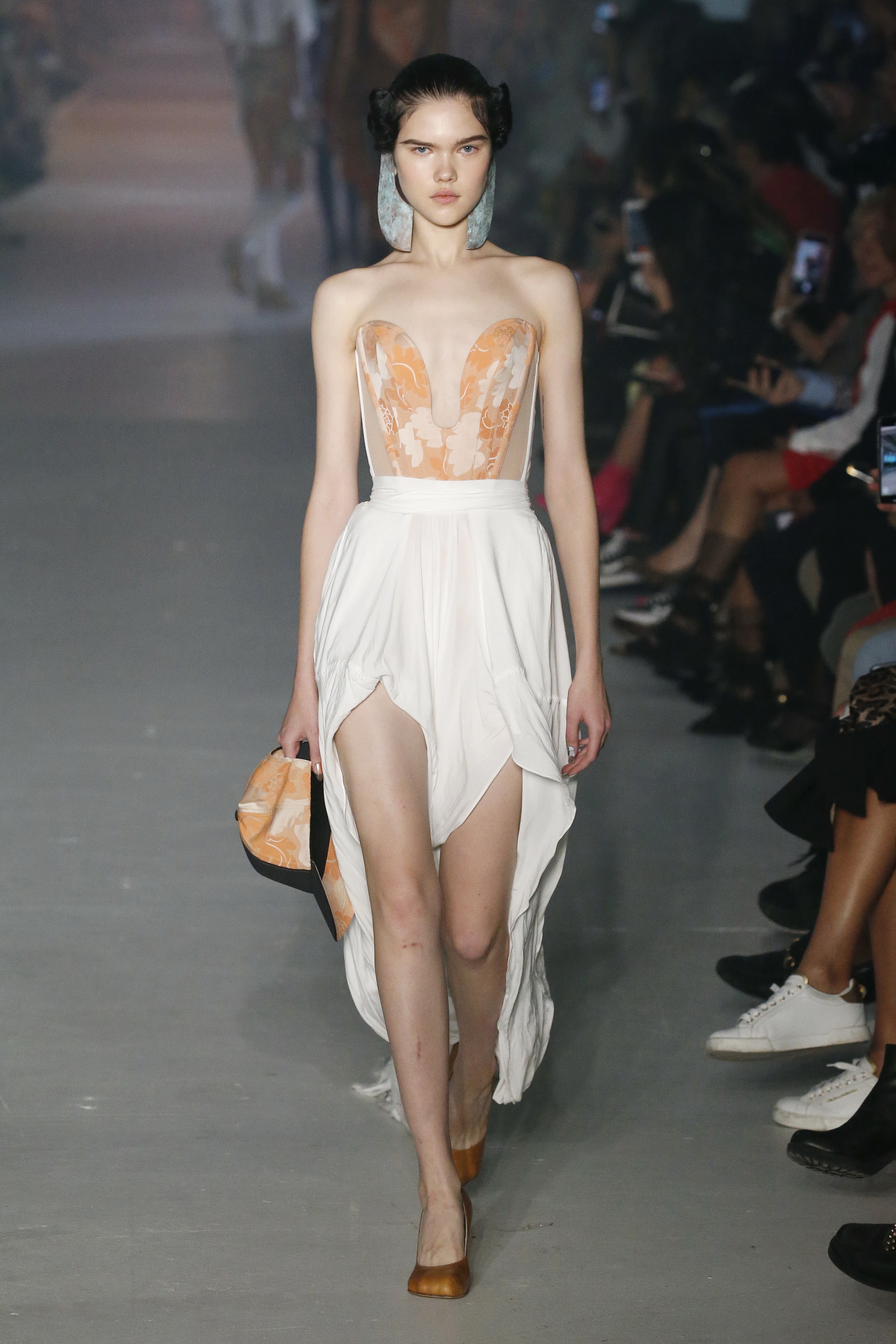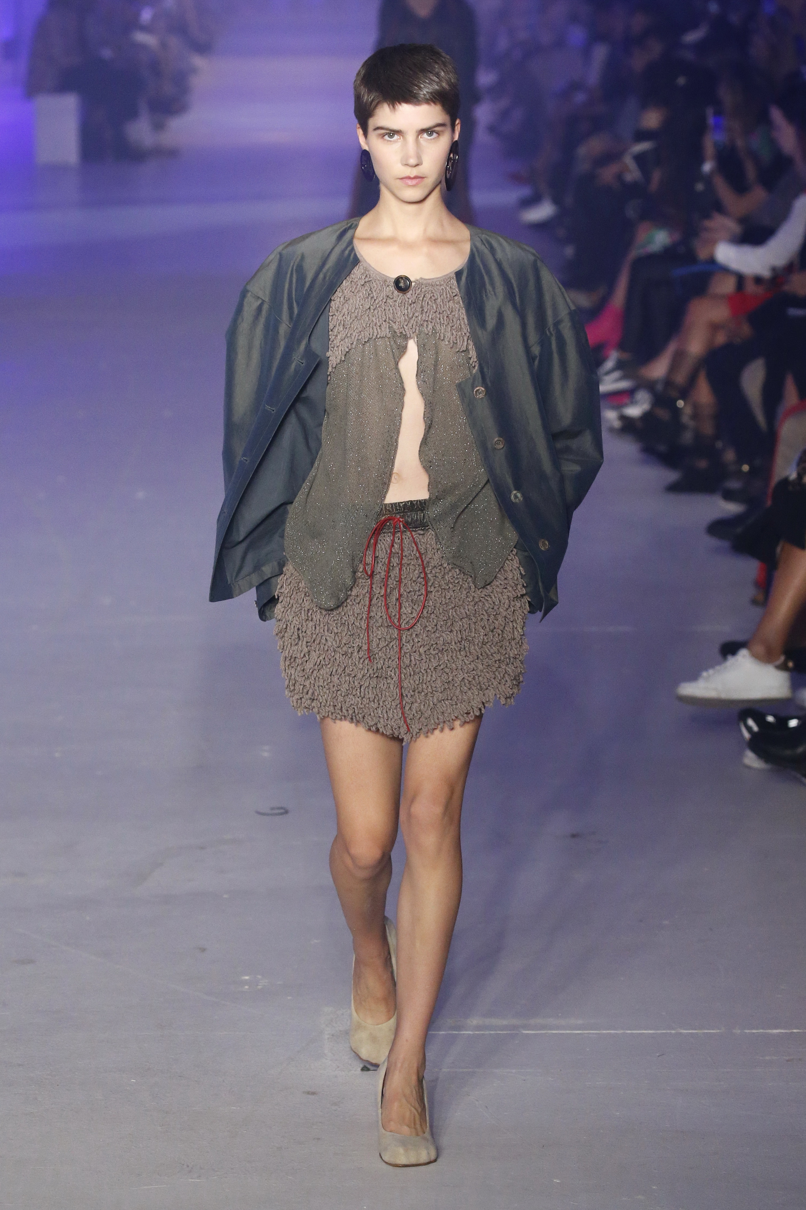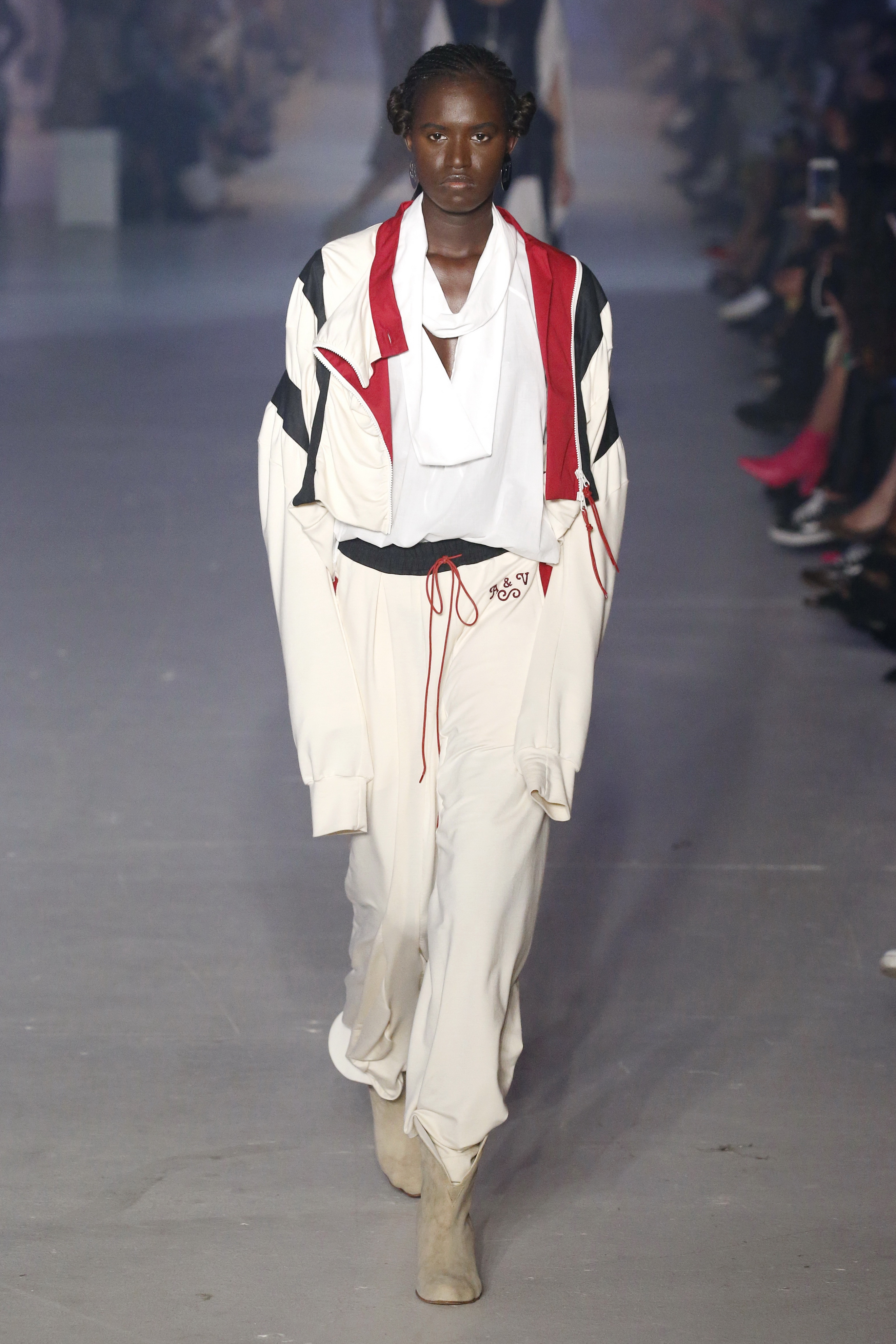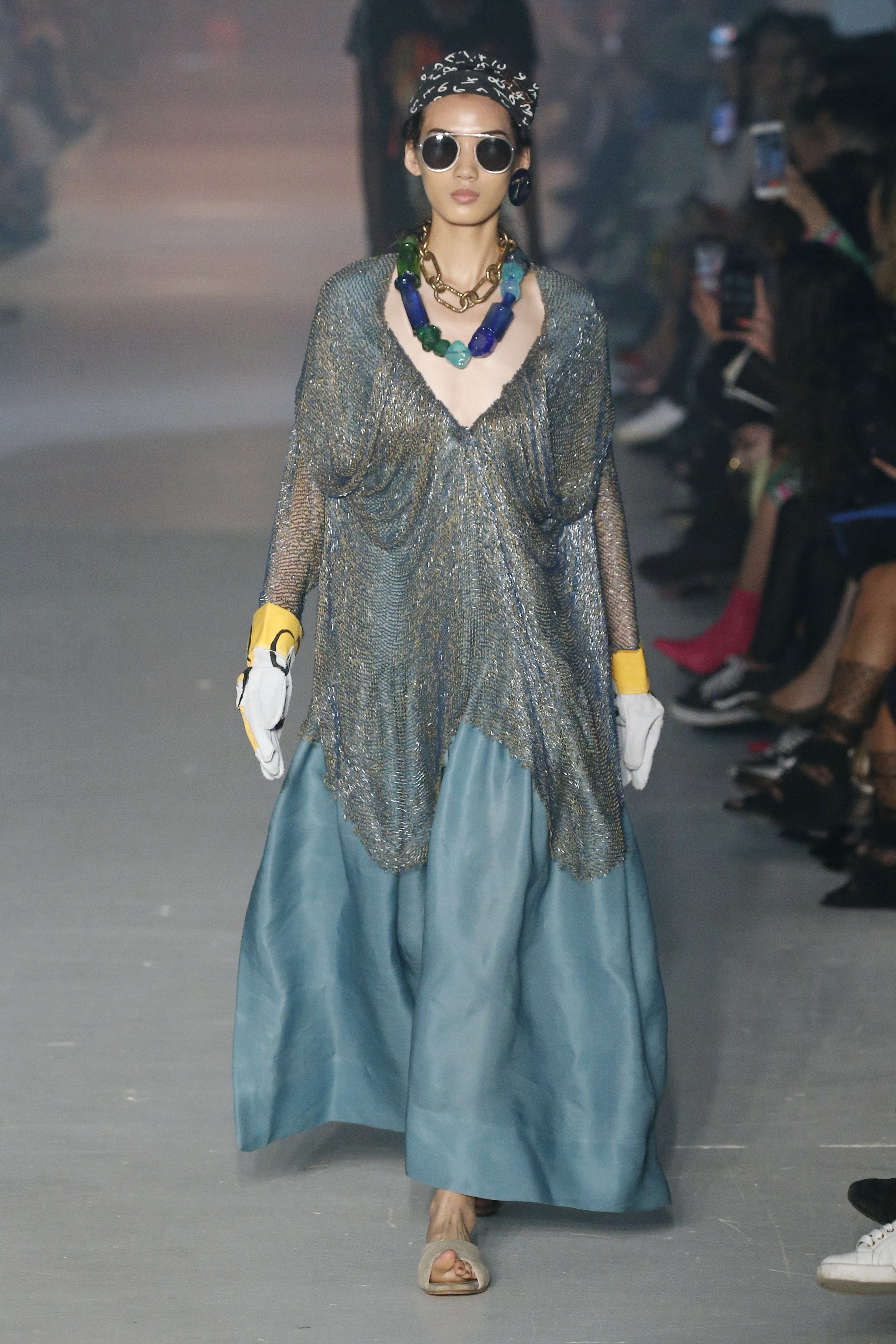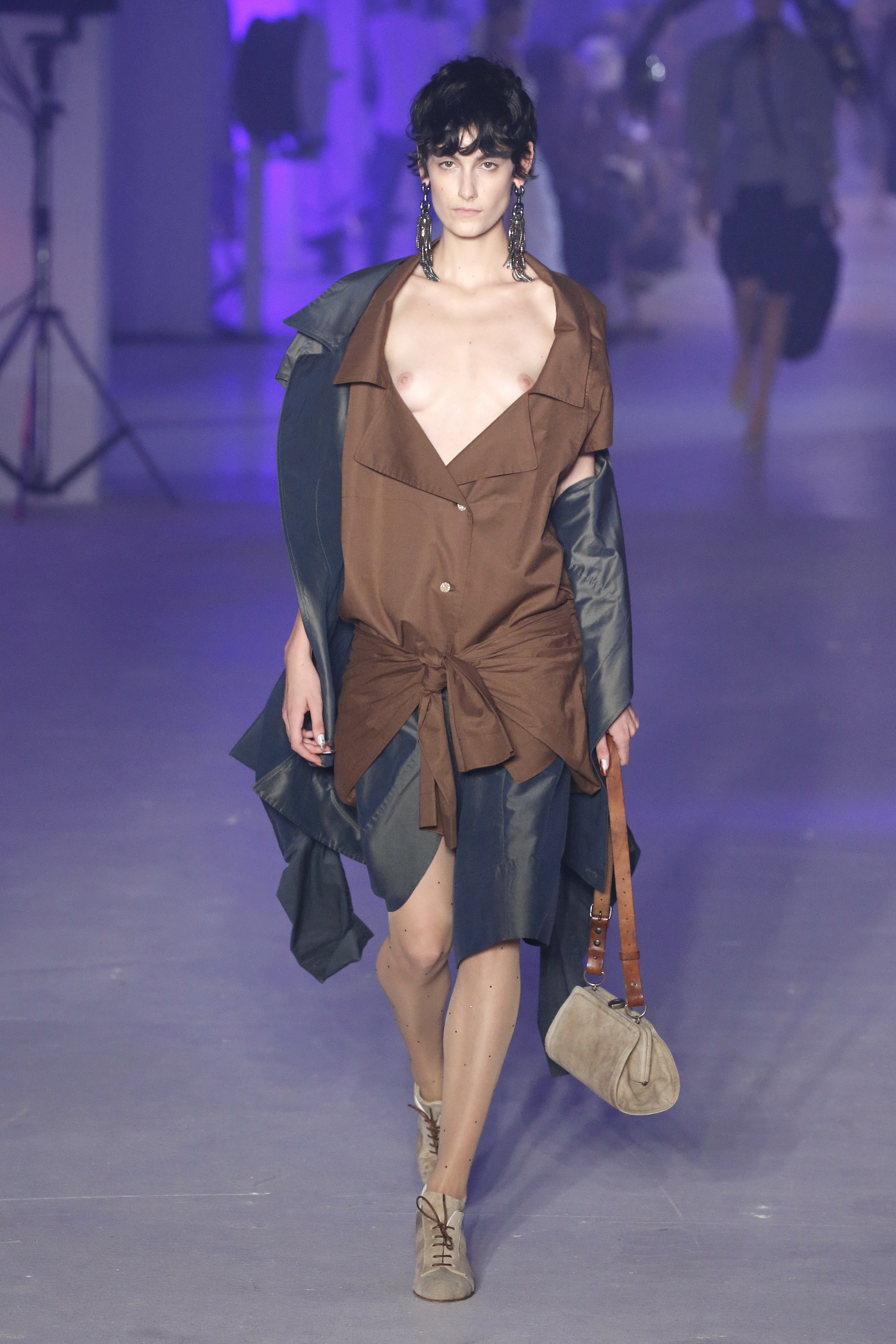 « Tout est connecté, ce qui n’était pas lié est soudainement connecté, c’est l’inspiration, l’intuition, la condition humaine. C’est ce que nous sommes, nous connectons les univers. J’ai épinglé les images sur le mur – J’ai vu l’image de la poignée d’une porte, la tête d’un homme dont les bras frappaient à la porte – l’alchimie. Cela s’est transformé en une boucle venant de l’épaule ou de la hanche qui souffle le vent, parfois longue, parfois courte, tournant autour. Ma première inspiration fut les nuages – les pin-up des années 50, photographiées d’en bas, comme si elles étaient dans le ciel avec des nuages de coton se jetant sur elles. J’aime la forme des nuages qui flottent sur le corps, les vêtements qui glissent du corps, la chemise qui tombe des hanches vers le sol. Les remettre de bas en haut, à l’envers, serrés autour des hanches : fais le toi-même. Nous avons travaillé avec Wastemark pour collecter des chutes de tissus dans les meilleures usines italiennes : réduire, réutiliser, repenser. J’aime le volume ; le colporteur, le vendeur ambulant, son stock transporté dans une cage attachée dans le dos, sa tête entourée de marchandises sur ses épaules – c’est un spectacle ambulant. Forme gonflée dans d’infinies possibilités : épaules, hanches bouffantes, grands chapeaux et parapluies. Armatures fournies par la coque rigide du corset – une base pour les étoffes virevoltantes de la Vénus de Botticelli. Pour la seconde saison nous avons travaillé en collaboration avec le projet ‘Ethical Fashion Initiative’ en utilisant du tissu artisanal provenant du Mali – Bogolan teint naturellement, signifiant « fait de terre », à motif damier. Nous avons réinventé un pied d’animal sur nos nouvelles paires de talon, Mozart aurait adoré. Tigre, tigre brûlant brillant, dans les forêts de la nuit. La coiffure du 18ème siècle, portée par chaque petit apprenti, c’est ingénieux, et quel casting ! Je n’ai jamais vu de telles créatures, elles viennent toutes d’un autre monde. Faisant surgir un conte de fées historique et géographique de l’espèce humaine, du microbe au robot.