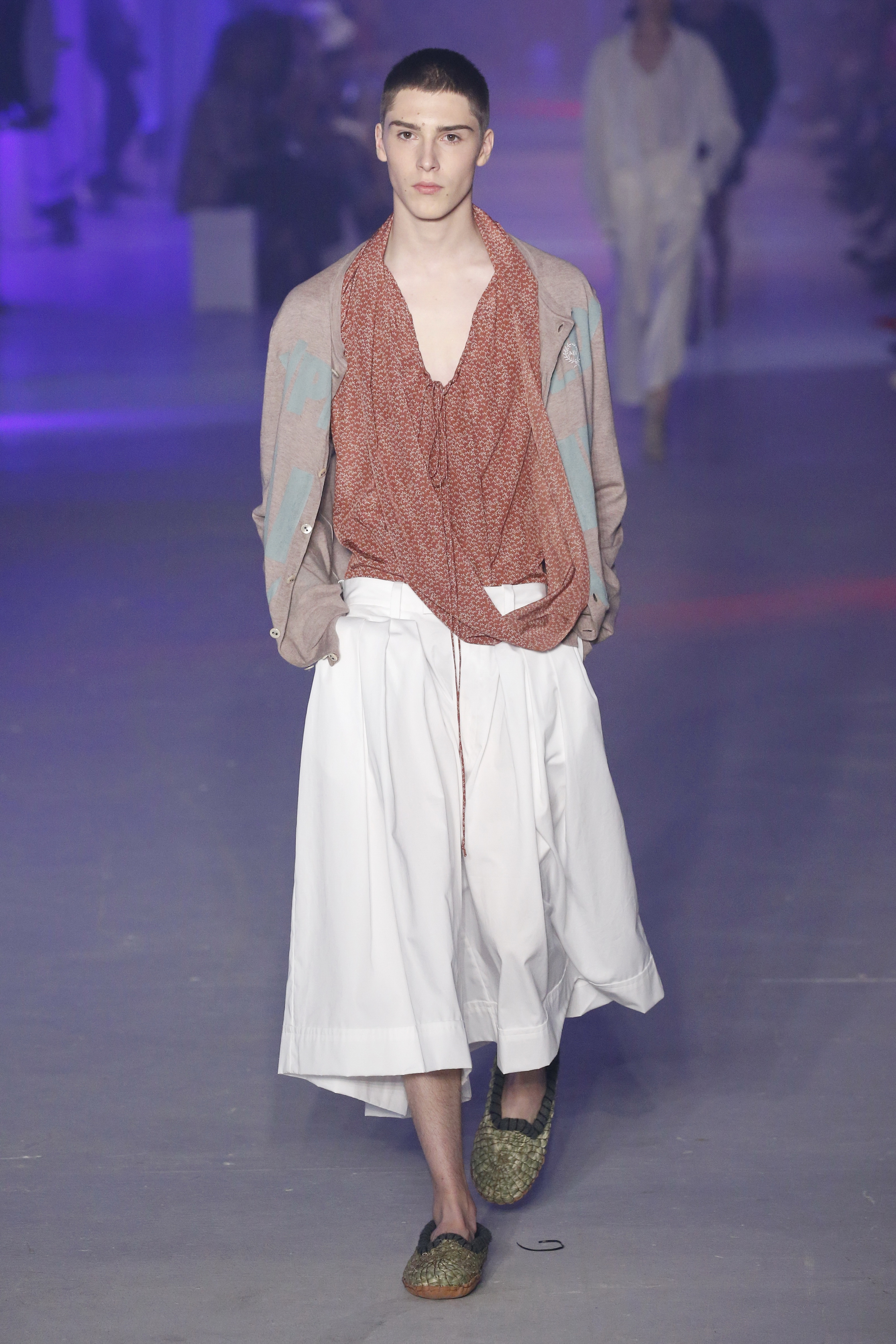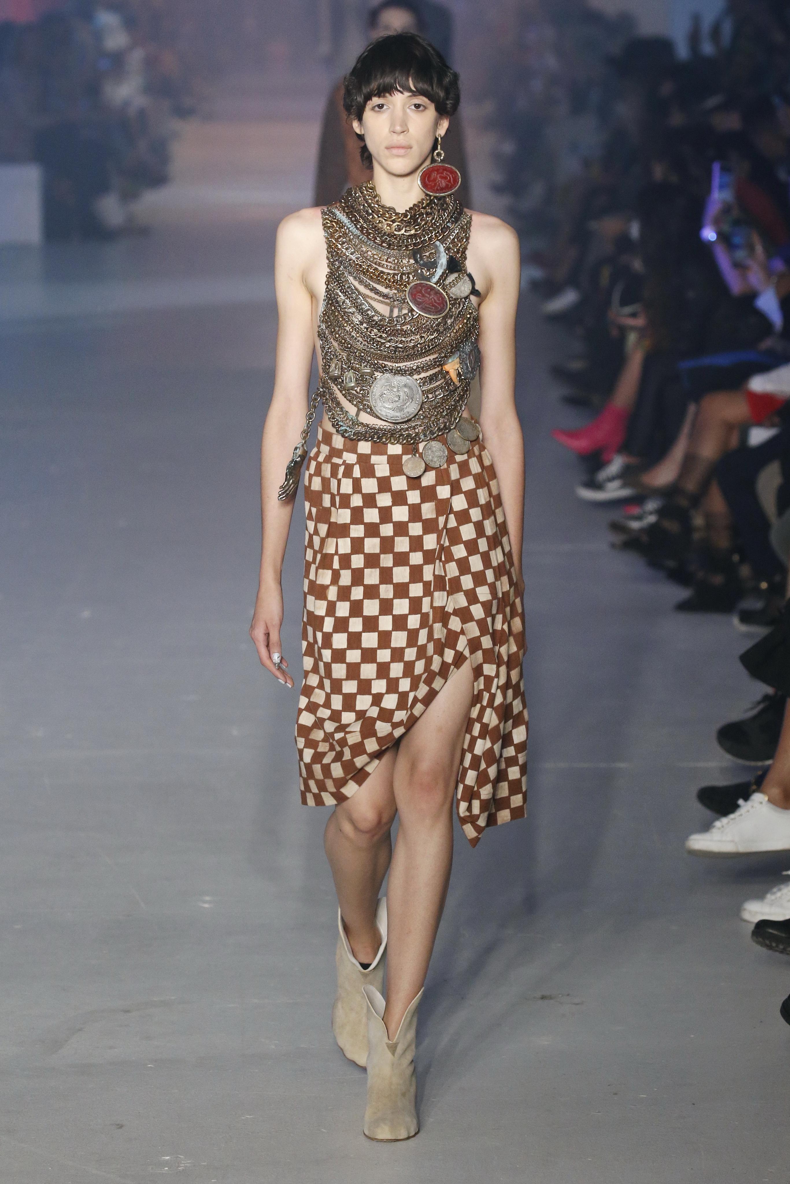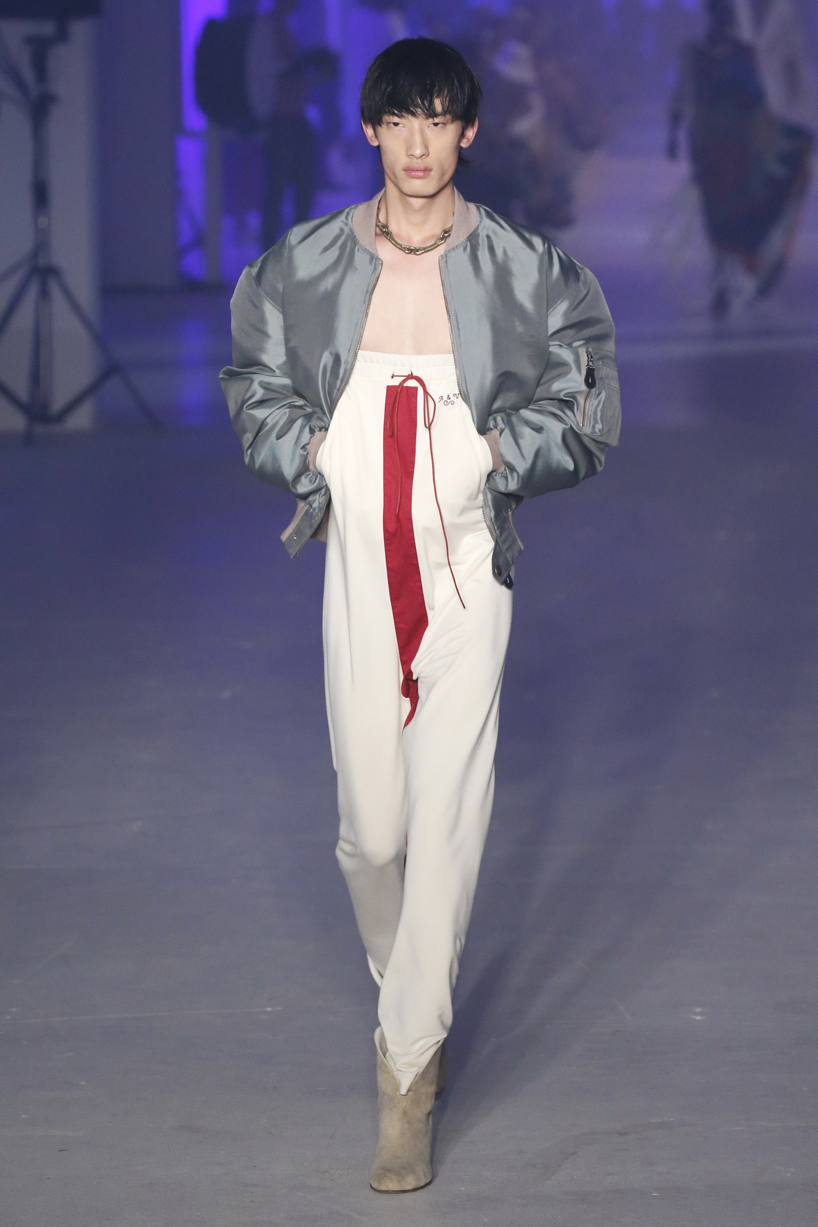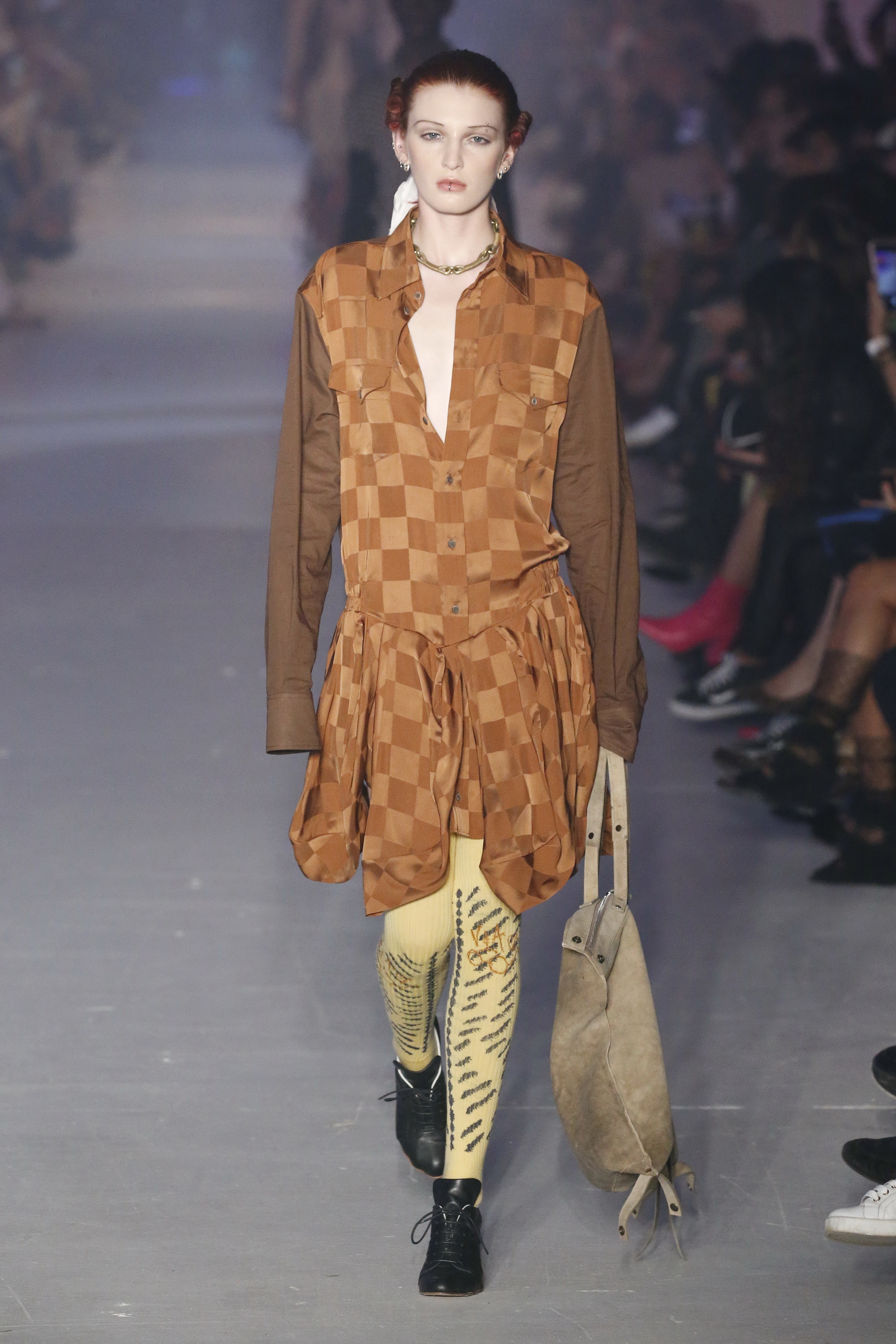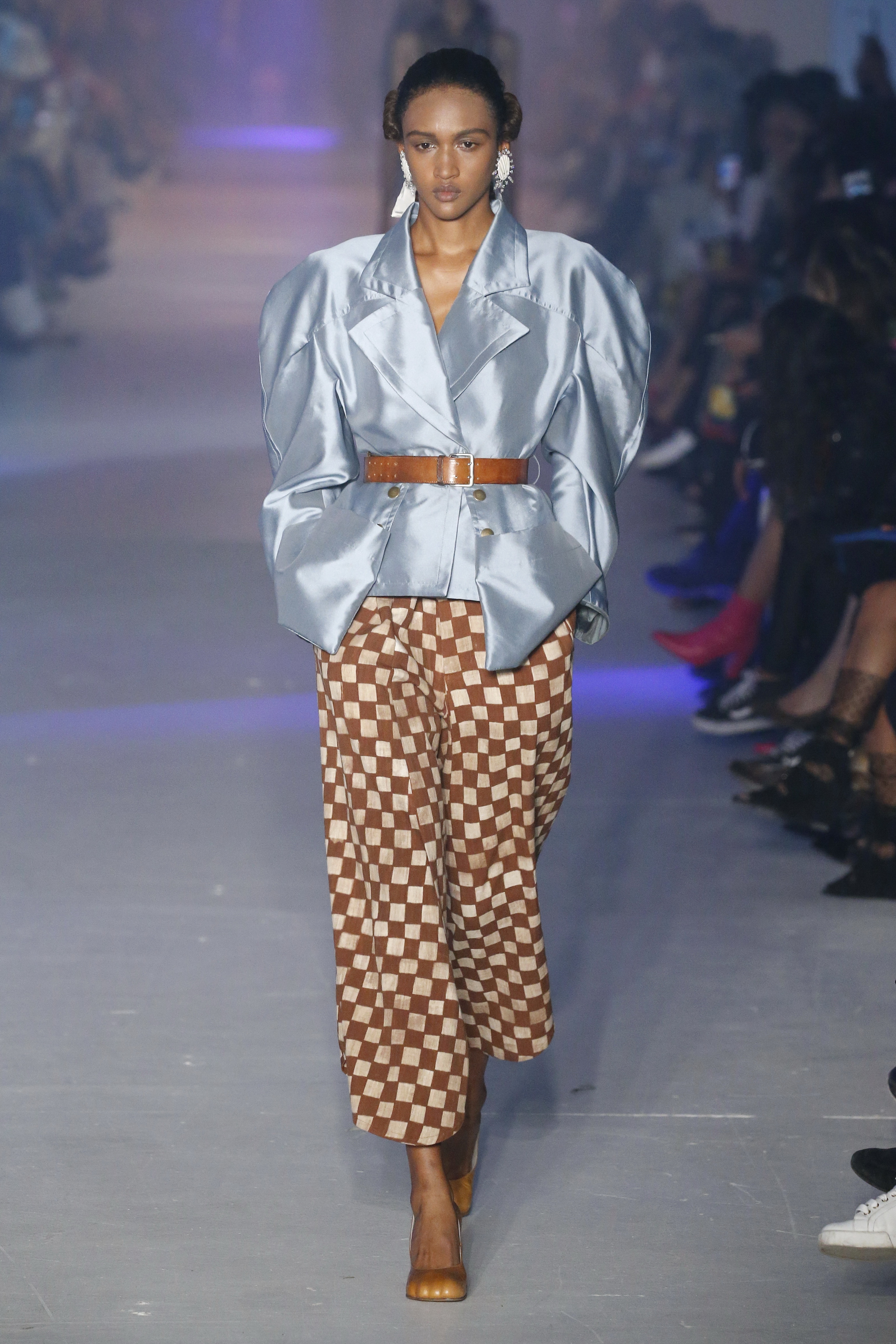 « Tout est connecté, ce qui n’était pas lié est soudainement connecté, c’est l’inspiration, l’intuition, la condition humaine. C’est ce que nous sommes, nous connectons les univers. J’ai épinglé les images sur le mur – J’ai vu l’image de la poignée d’une porte, la tête d’un homme dont les bras frappaient à la porte – l’alchimie. Cela s’est transformé en une boucle venant de l’épaule ou de la hanche qui souffle le vent, parfois longue, parfois courte, tournant autour. Ma première inspiration fut les nuages – les pin-up des années 50, photographiées d’en bas, comme si elles étaient dans le ciel avec des nuages de coton se jetant sur elles. J’aime la forme des nuages qui flottent sur le corps, les vêtements qui glissent du corps, la chemise qui tombe des hanches vers le sol. Les remettre de bas en haut, à l’envers, serrés autour des hanches : fais le toi-même. Nous avons travaillé avec Wastemark pour collecter des chutes de tissus dans les meilleures usines italiennes : réduire, réutiliser, repenser. J’aime le volume ; le colporteur, le vendeur ambulant, son stock transporté dans une cage attachée dans le dos, sa tête entourée de marchandises sur ses épaules – c’est un spectacle ambulant. Forme gonflée dans d’infinies possibilités : épaules, hanches bouffantes, grands chapeaux et parapluies. Armatures fournies par la coque rigide du corset – une base pour les étoffes virevoltantes de la Vénus de Botticelli. Pour la seconde saison nous avons travaillé en collaboration avec le projet ‘Ethical Fashion Initiative’ en utilisant du tissu artisanal provenant du Mali – Bogolan teint naturellement, signifiant « fait de terre », à motif damier. Nous avons réinventé un pied d’animal sur nos nouvelles paires de talon, Mozart aurait adoré. Tigre, tigre brûlant brillant, dans les forêts de la nuit. La coiffure du 18ème siècle, portée par chaque petit apprenti, c’est ingénieux, et quel casting ! Je n’ai jamais vu de telles créatures, elles viennent toutes d’un autre monde. Faisant surgir un conte de fées historique et géographique de l’espèce humaine, du microbe au robot.
