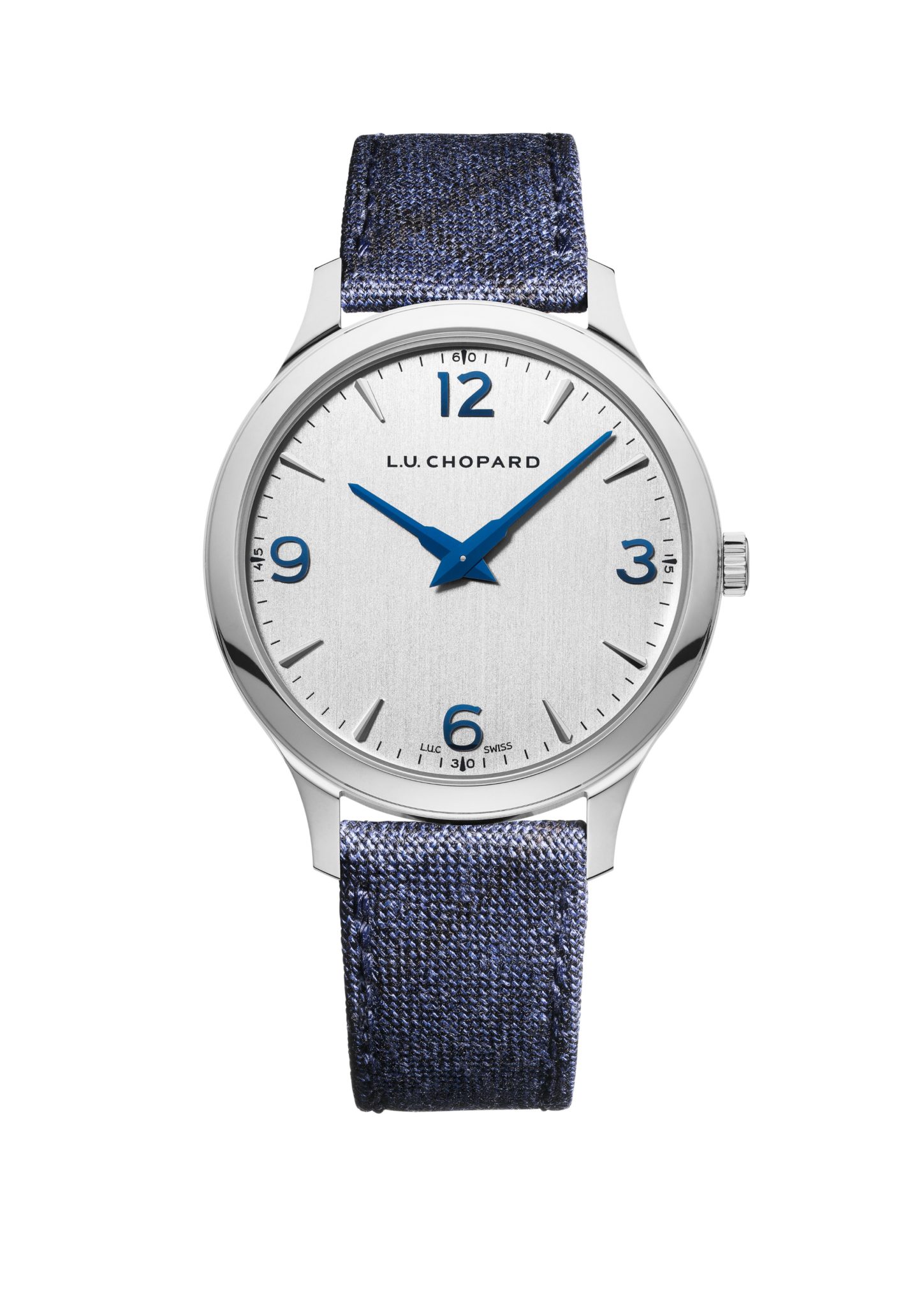 Roy Wang avait sélectionné une montre L.U.C XP en acier inoxydable avec un cadran argenté et des aiguilles bleues.