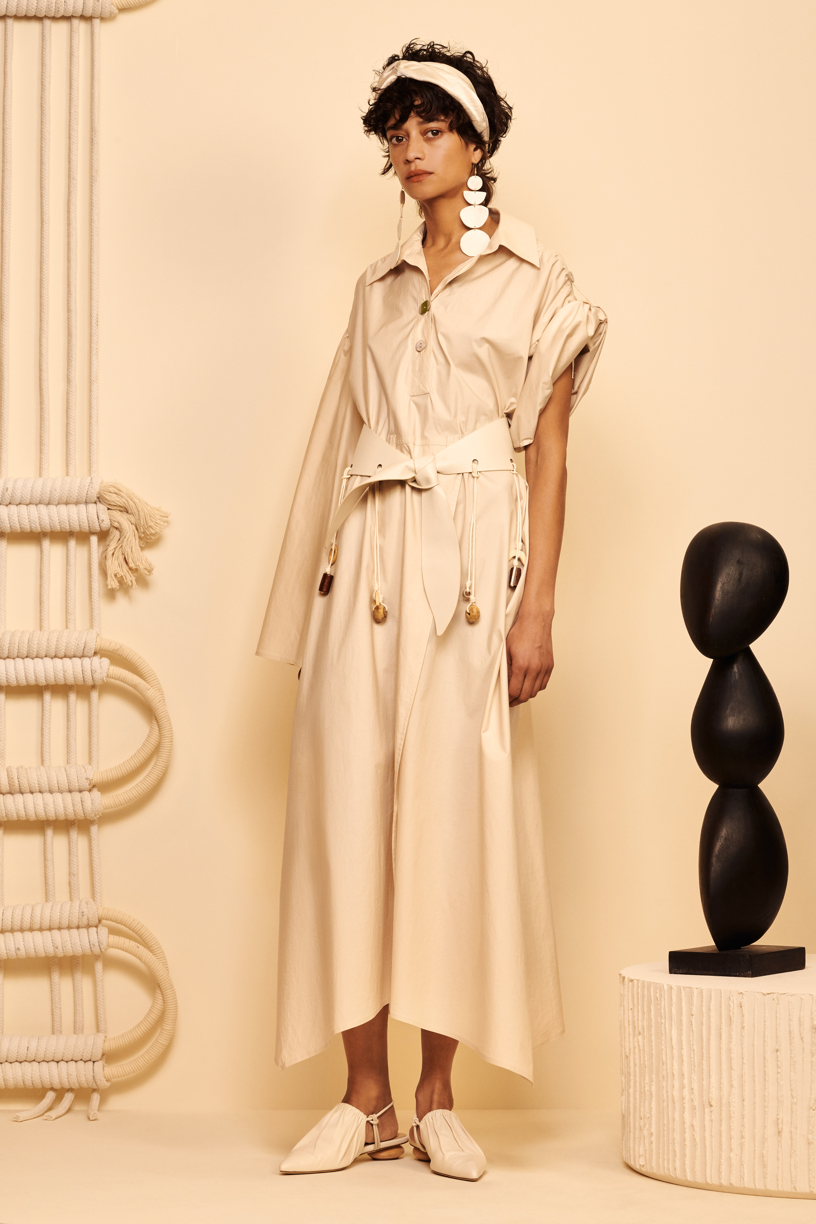 Nanushka’s Spring Summer 2020 Womenswear collection commemorates a nostalgic manifestation of summertime memories. Tribal elements are mixed with Riviera-inspired styles; owing shapes and cinched accentuations melt together to create a warm-weather wardrobe for the modern woman. “Faded By The Sun” focuses on summer silhouettes and natural coloration to create a rich collective of draped garments mixed with Mediterranean elements in a tribute to Loulou de la Falaise’s summer of 1972 spent in Patmos.