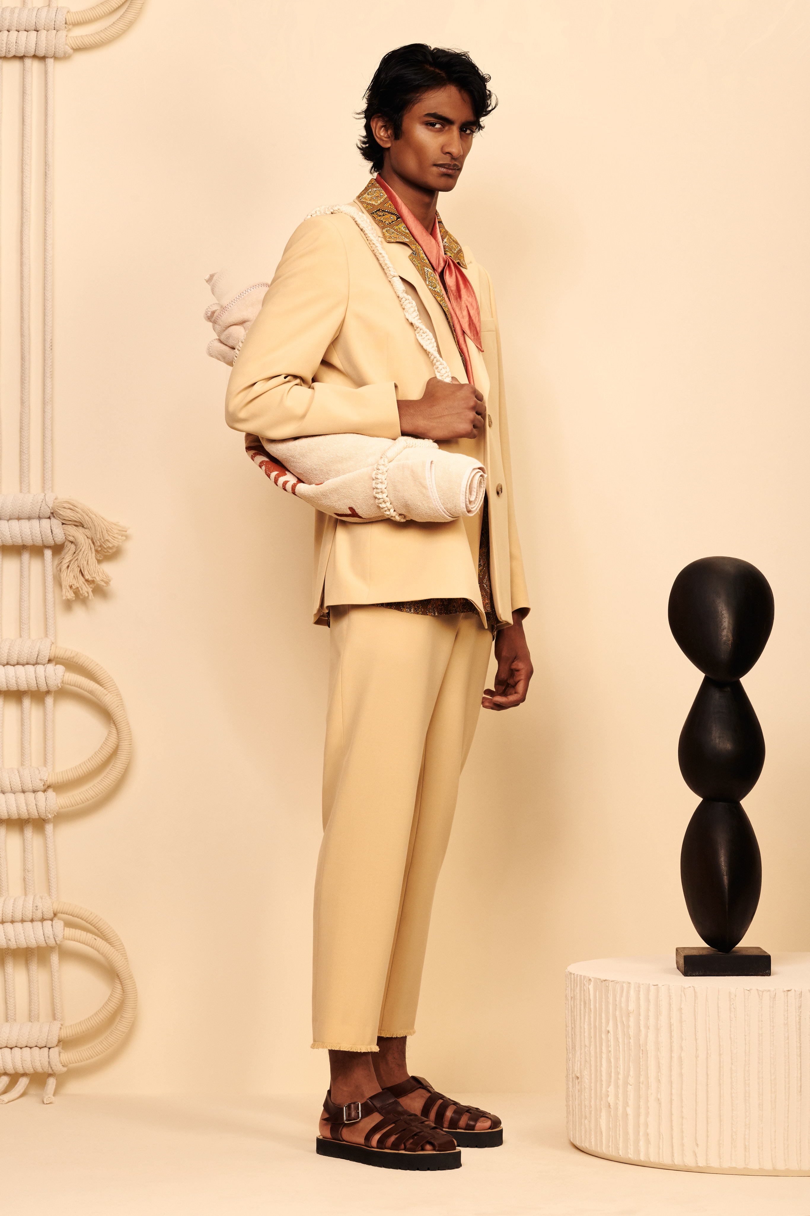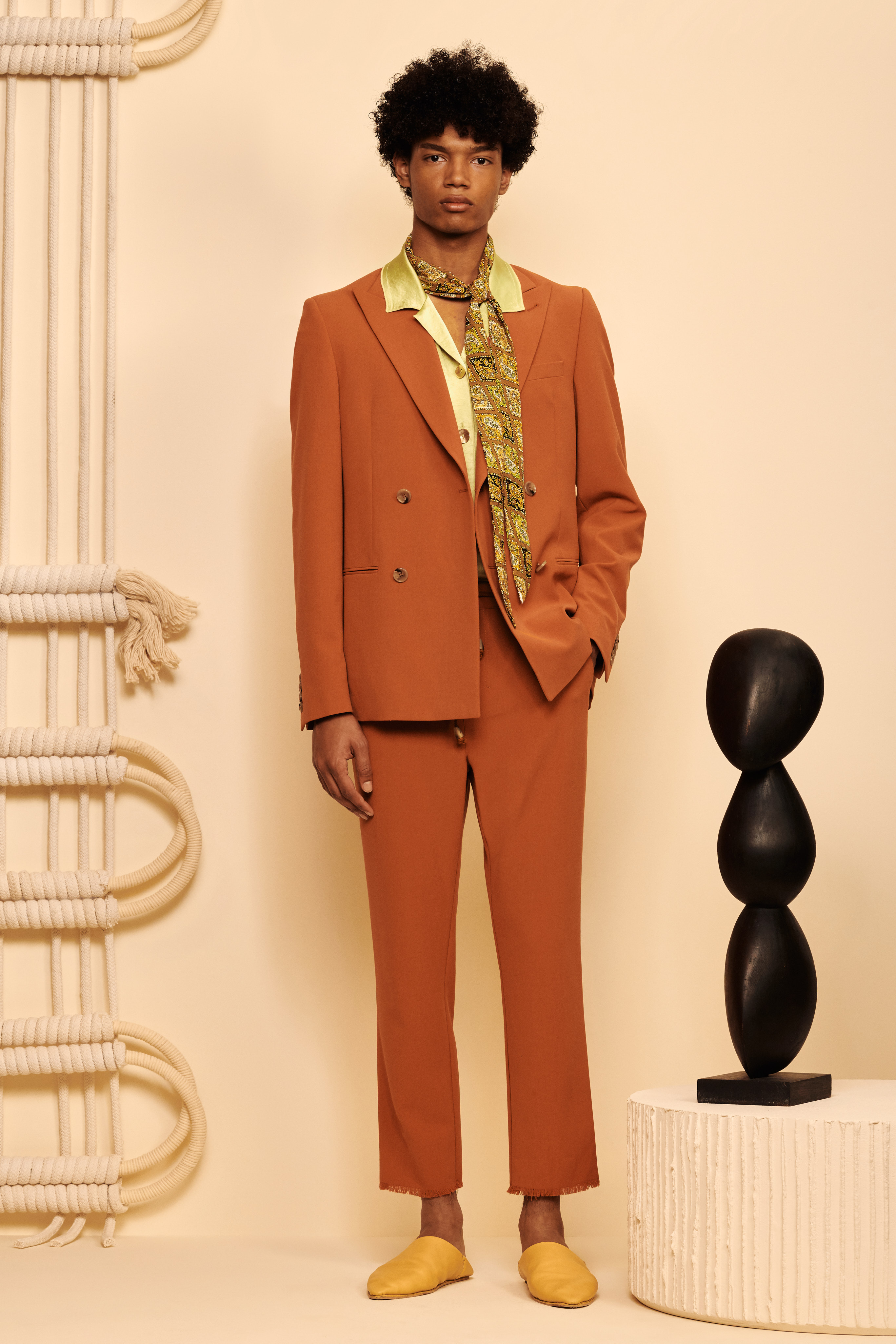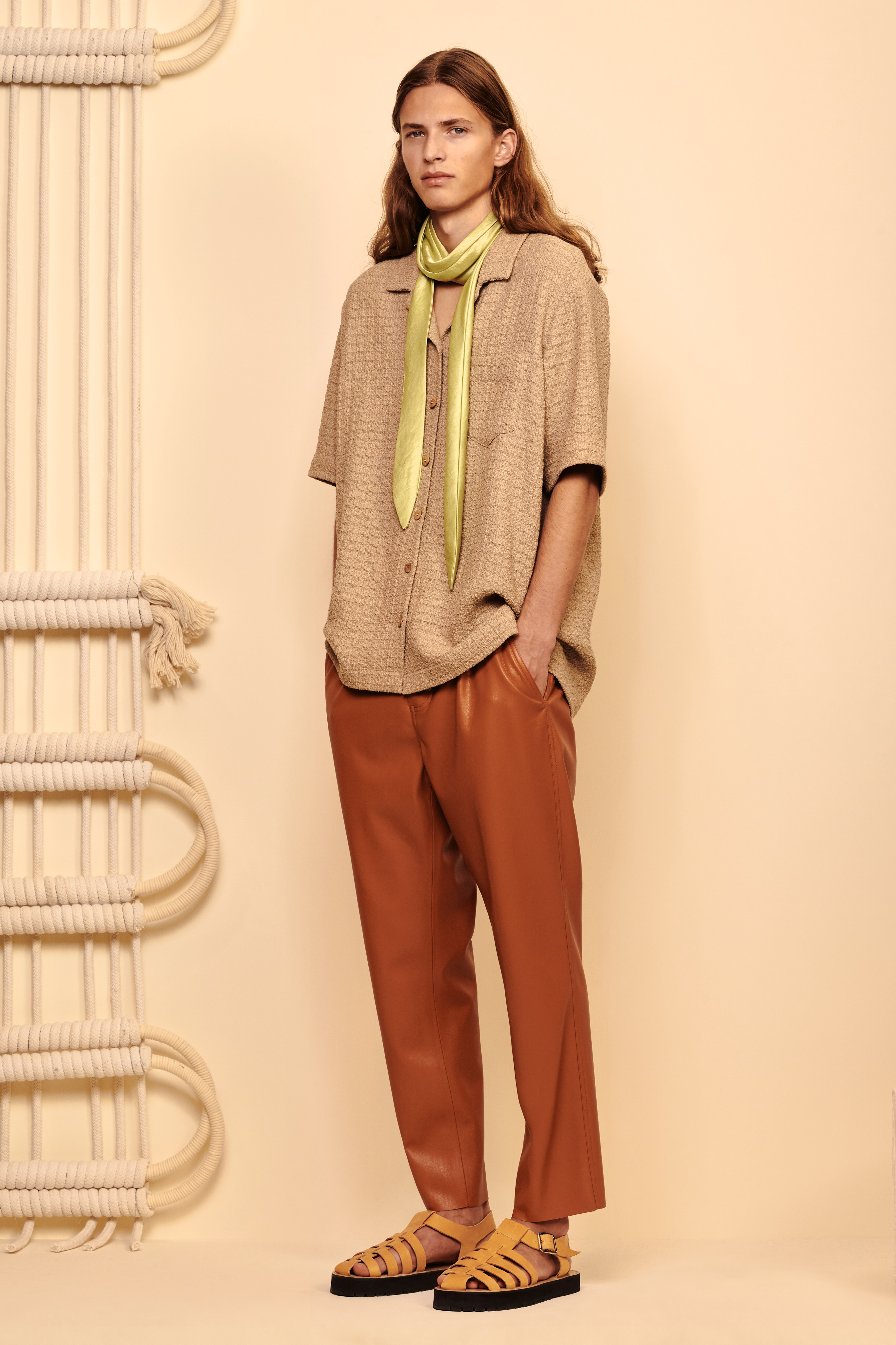 With different eras of culture and tradition being explored, classic tailoring is displayed in column silhouettes in a tted and owy way for a breezy feel. An antique greek aesthetic is channeled by draping, layering and tieing, all built within one piece of fabric. Volumes of clothes are featured in extra-large proportions that revisit masculine dressing styles while a modern take on Roaring Twenties winded silhouettes and necklines make a comeback. Signature vegan leather is rethought with draping and overlock stitching on Bermuda shorts, harem style pants and cropped camp shirts in shades of black, off white, and washed khaki.