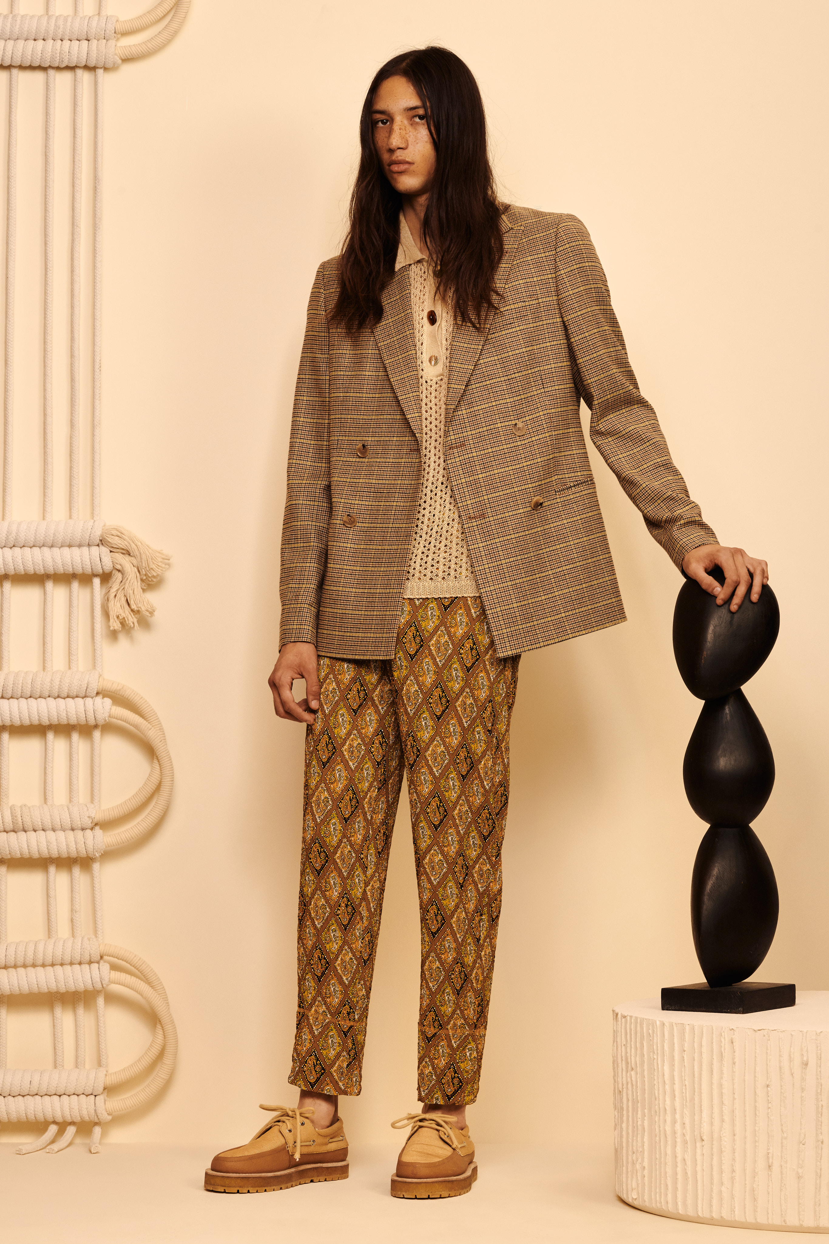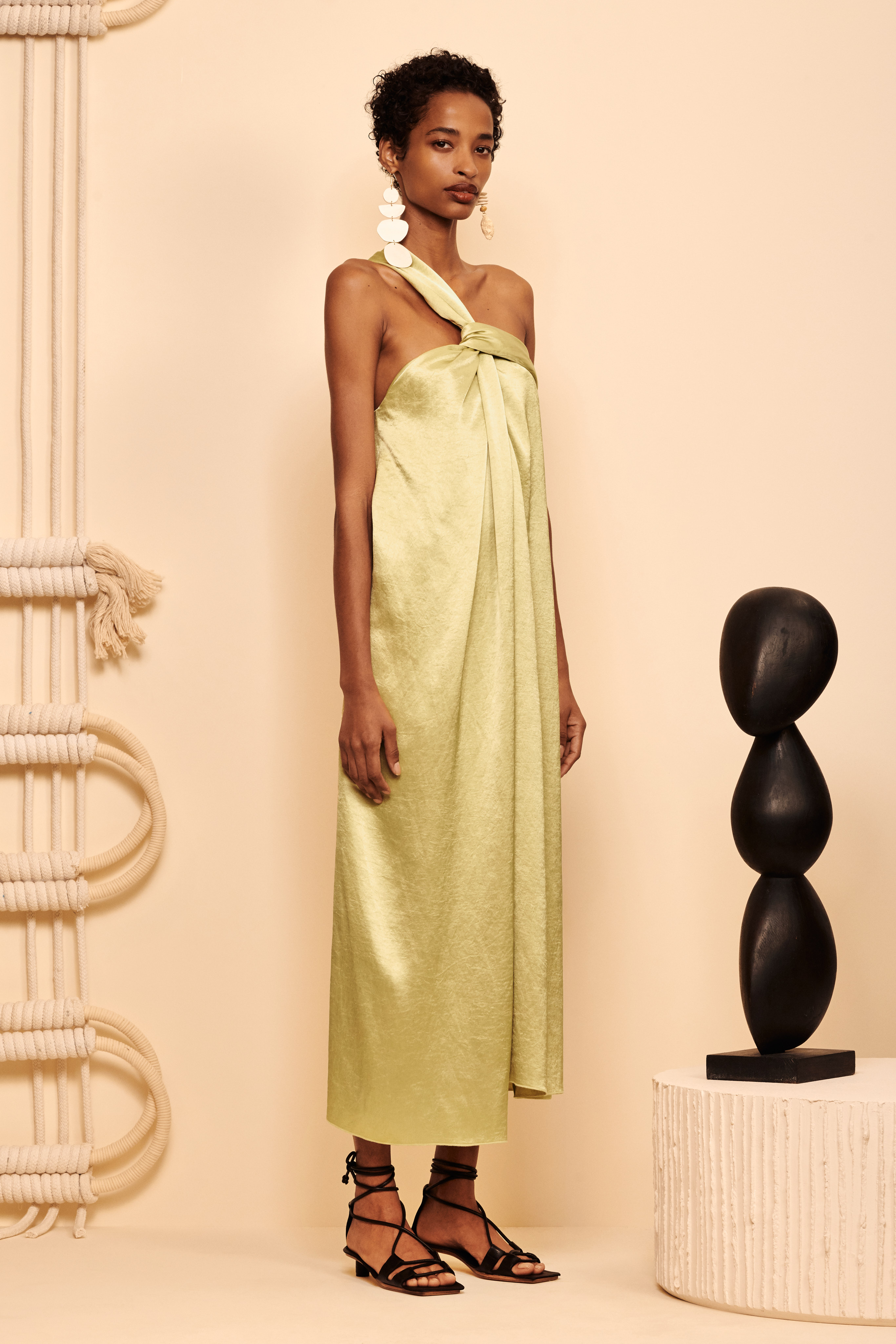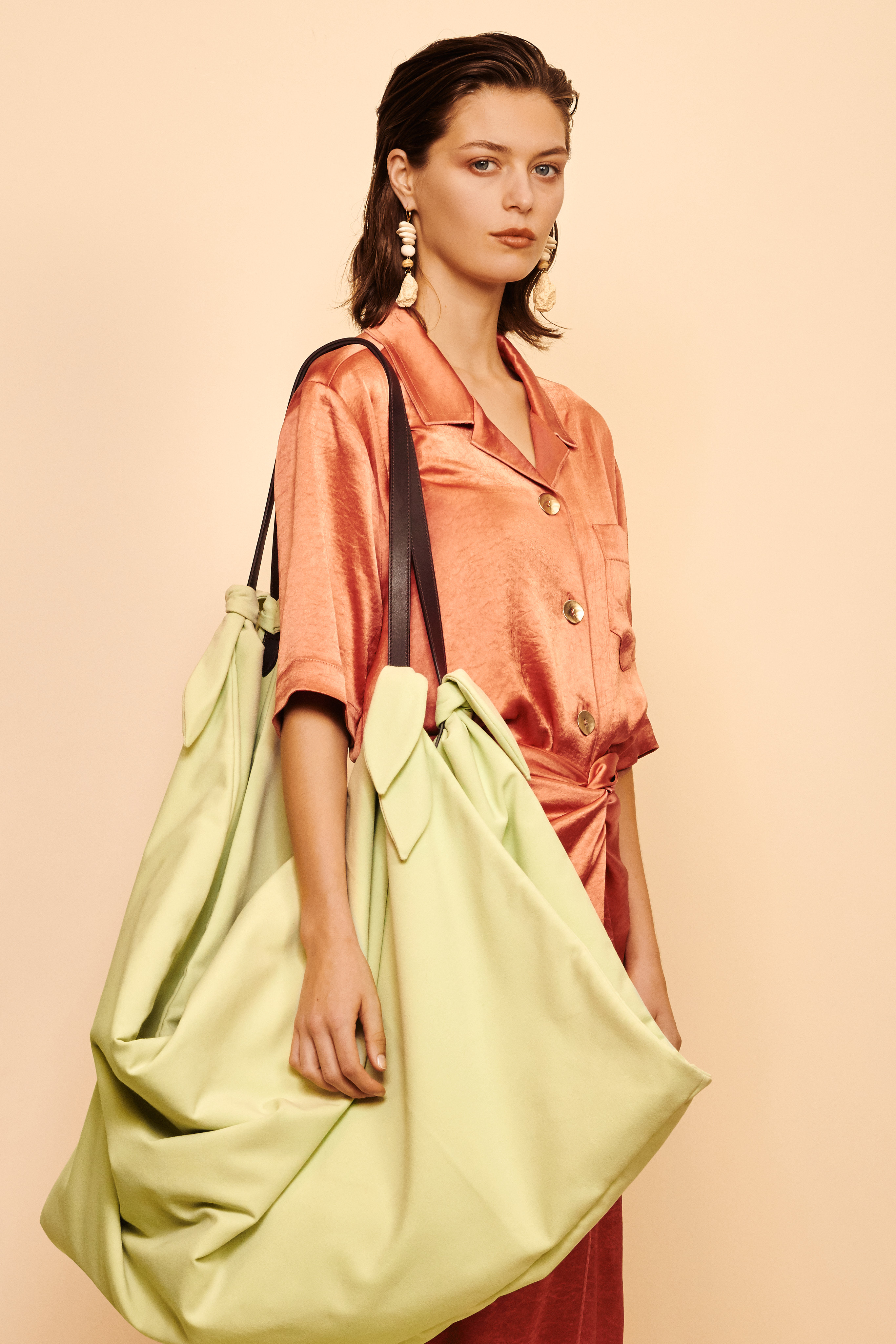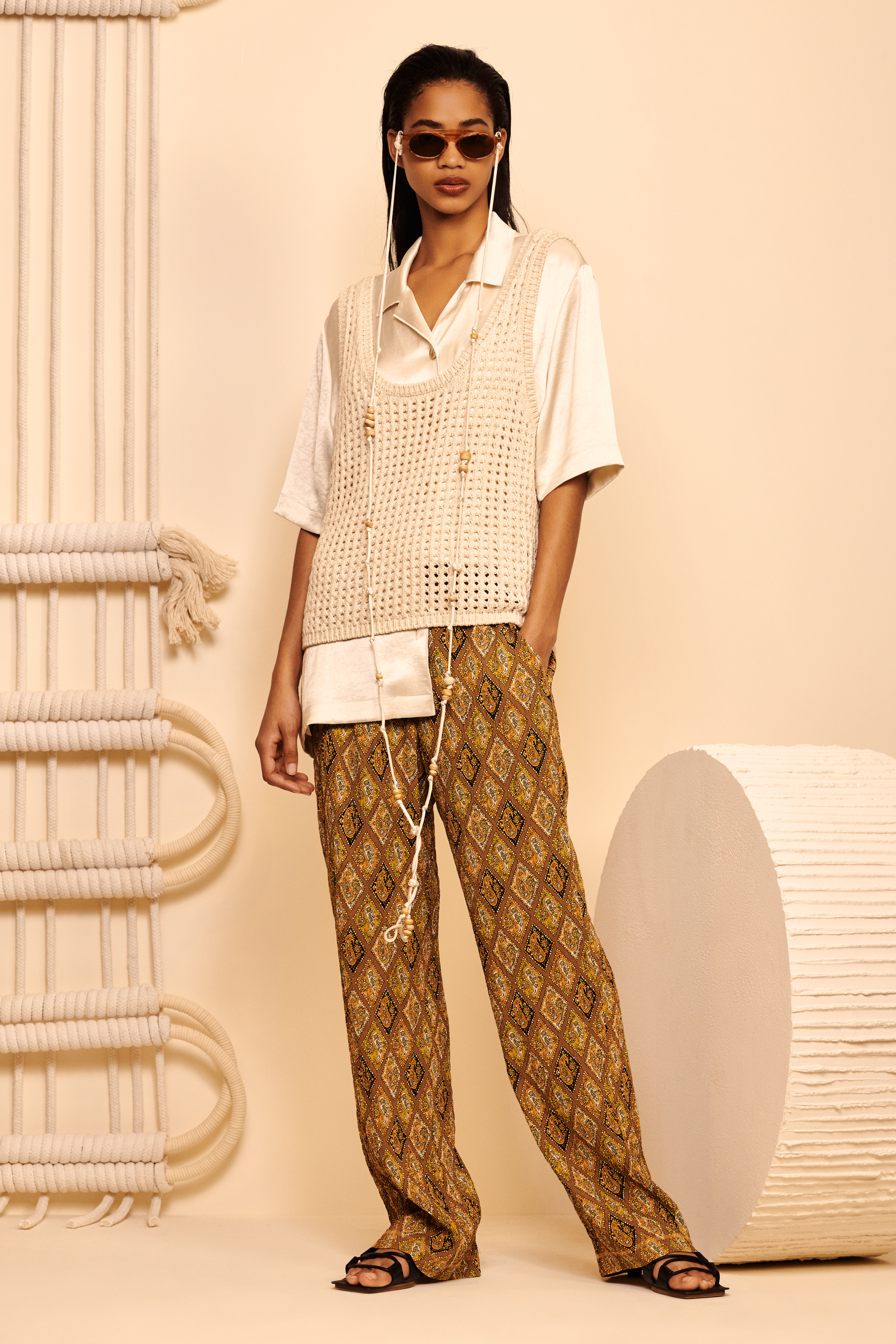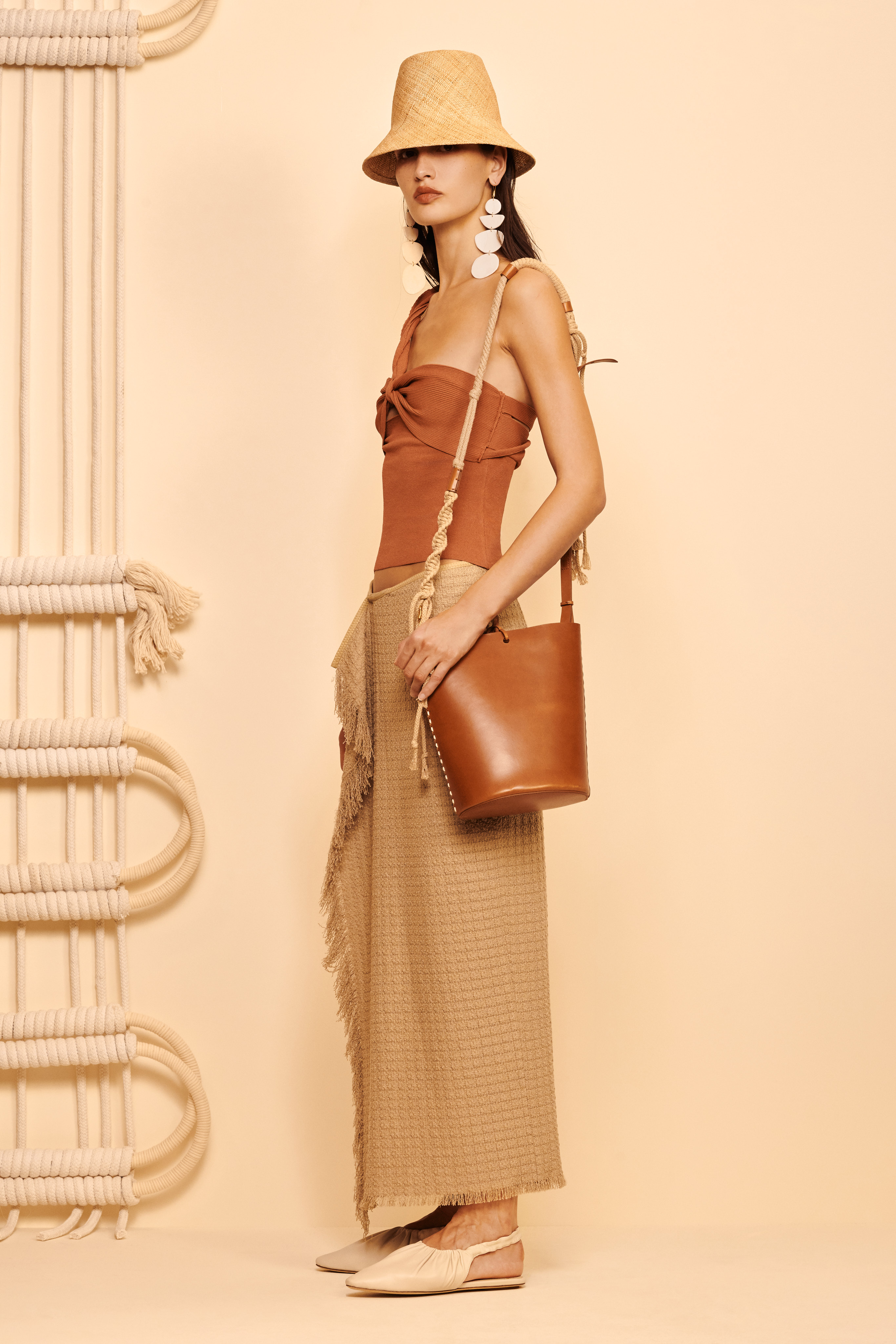 Organic cotton and jersey have been transformed with fresh pops of lime and orange that are all smoothly tied together with splashes of creme and taupe. Conceptual Nanushka prints add elegance and ease with new shades of hand-dyed indigo transfused into organic cotton in relaxed styles. While handmade macrame drips down tech linen, new gures of rib knit, crochet knit and linen knit have been elevated with exaggerated fringe details that provide casual coverage for a cool summer evening breeze. Modernized blazers, vest dresses, boiler suits, and elongated skirts add a delicate edge while washed satin mini skirts and draped halter tops offer a sensual signature that’s balanced out with rustic woven skirts and trousers. A textured canvas trench coat with alternative leather woven details mimics a straw baskets’ weave, giving it a warm impression that acts as a statement due to the unconventional pairing.