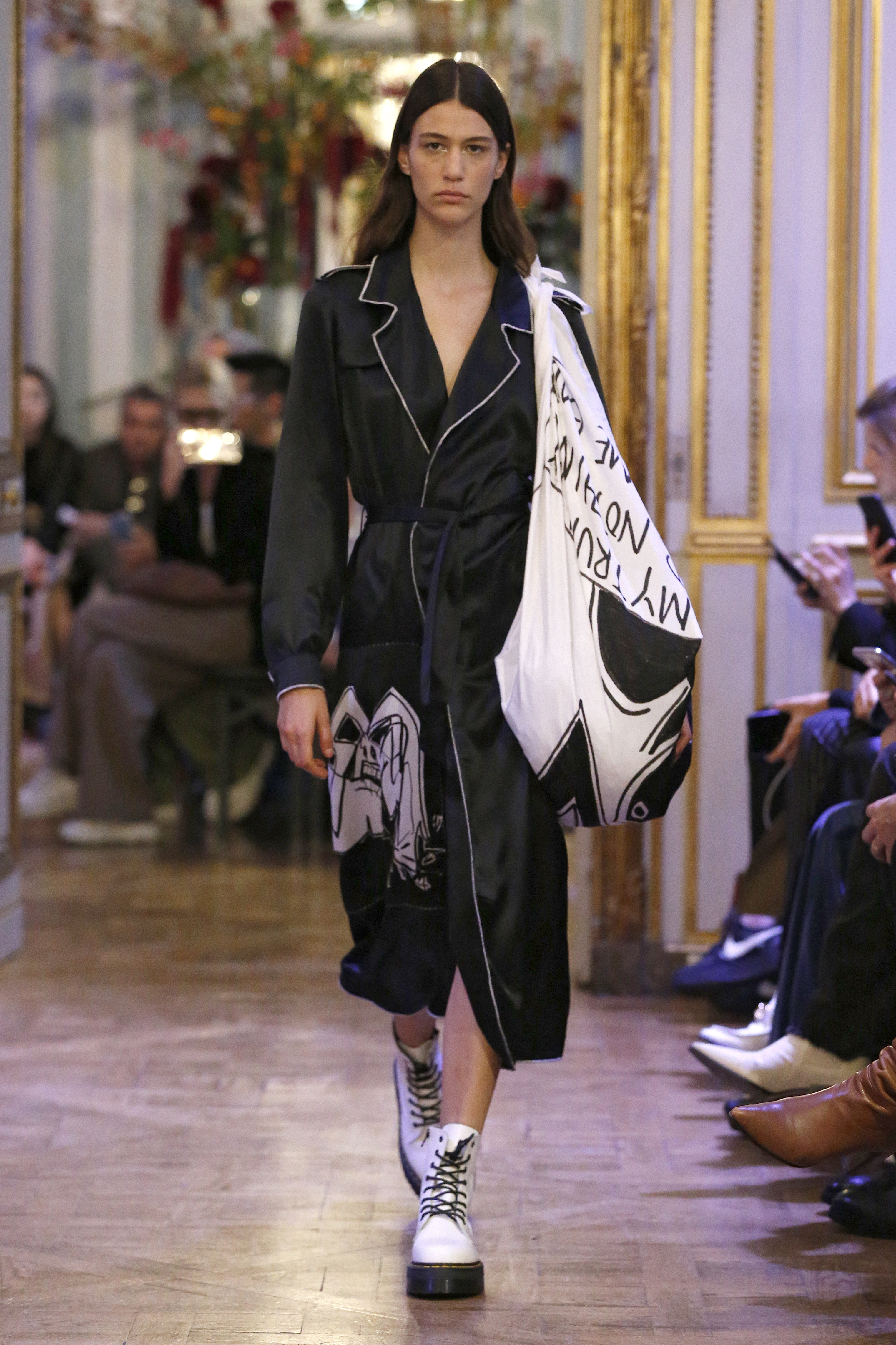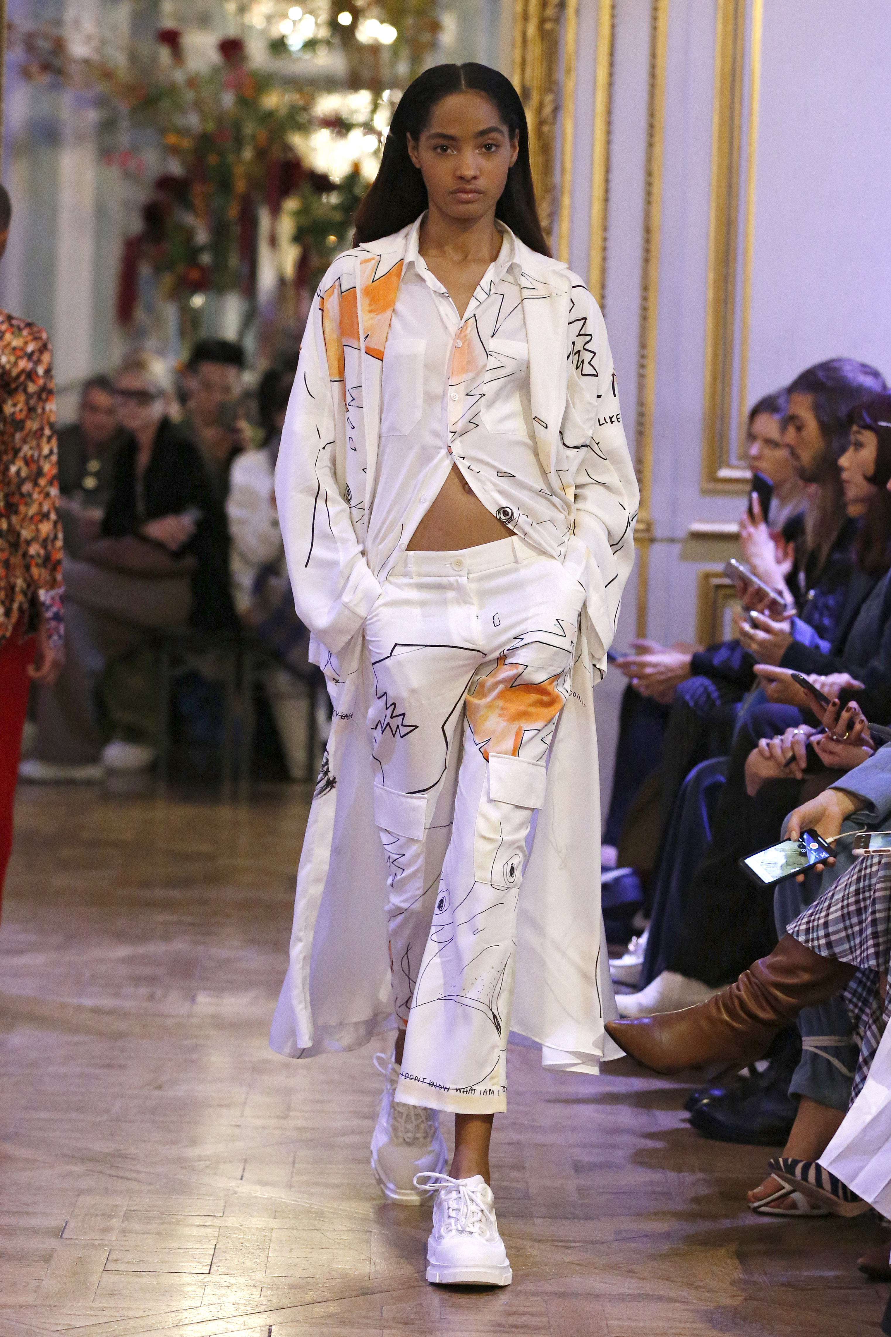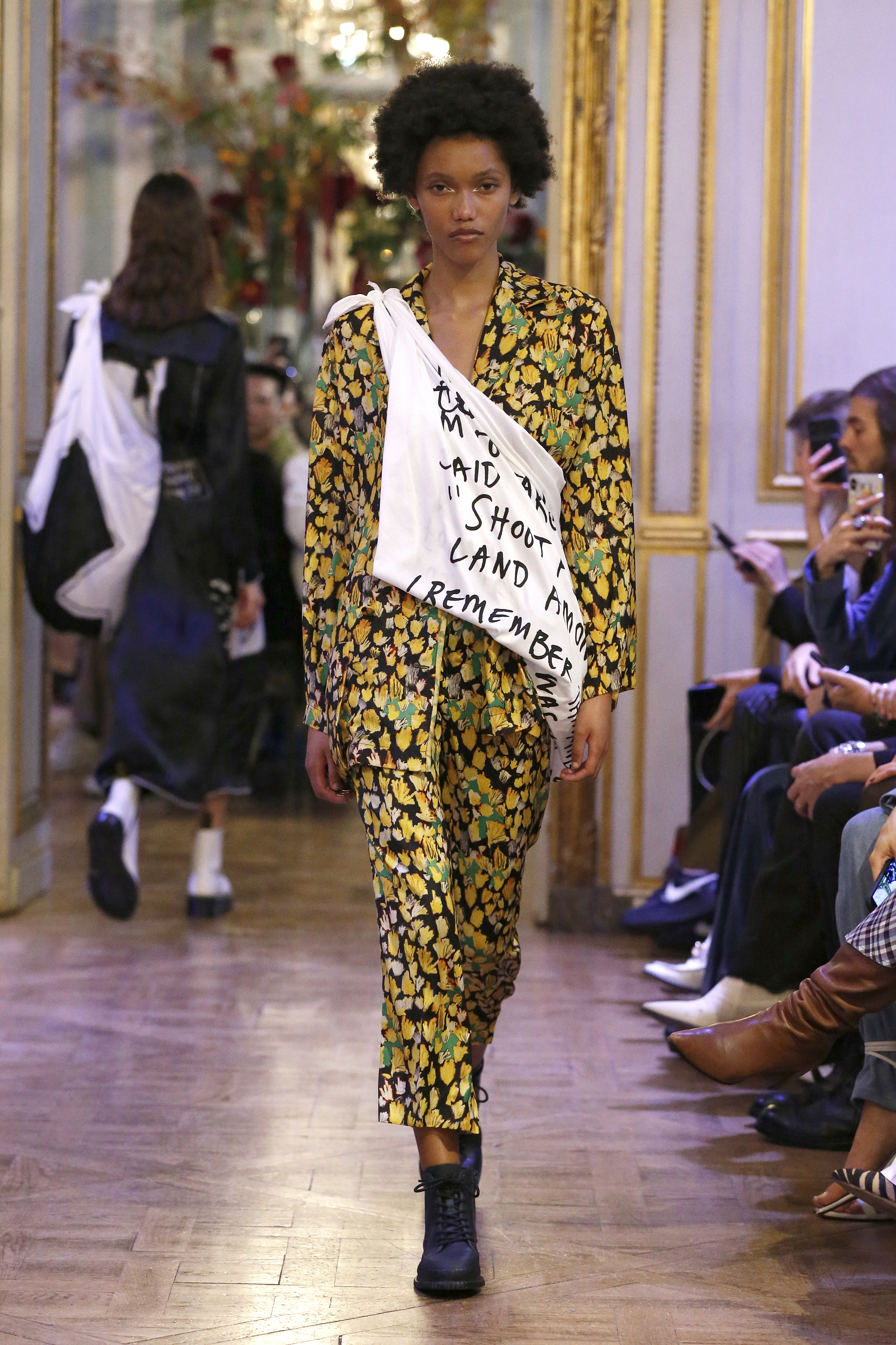 “To me, this collection is about being fearlessly yourself. It is about embracing the idea of an identity, of a uniform, and feeling safe inside of who you really are. The textiles in the collaboration are flowers turned to bombs, journal entries from moments of clarity and also moments of vulnerability, along with black and white crayon drawings.” – Austyn Weiner (Vogue, 2019)