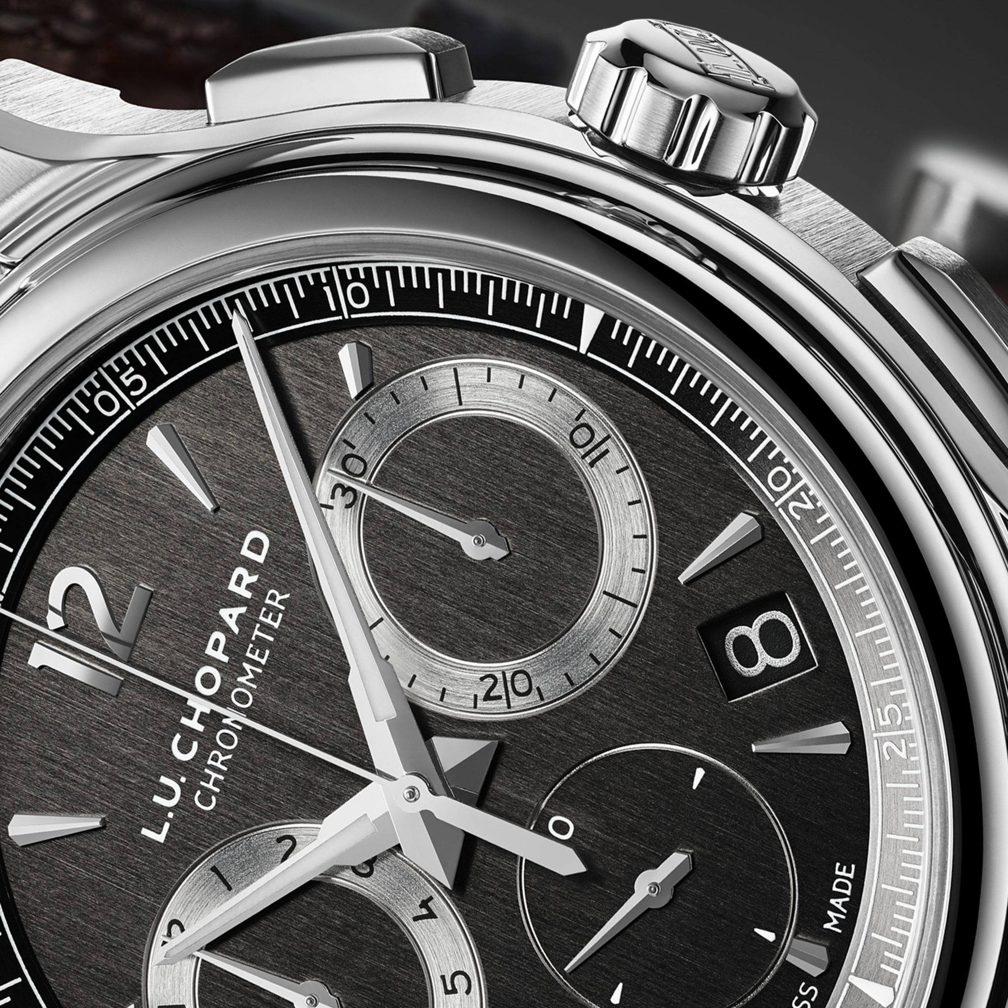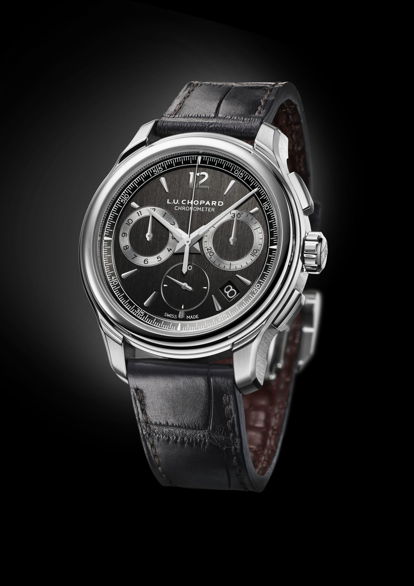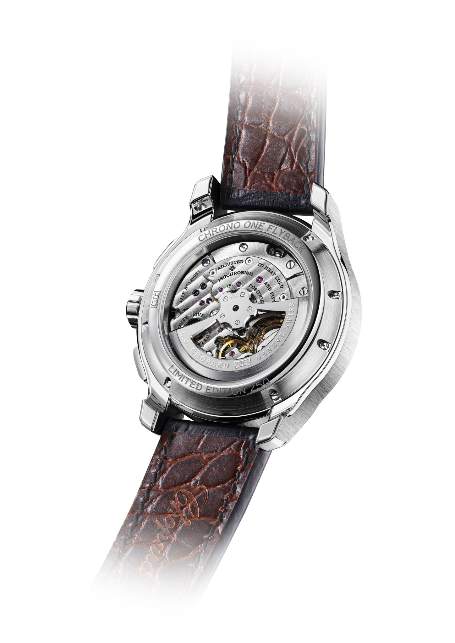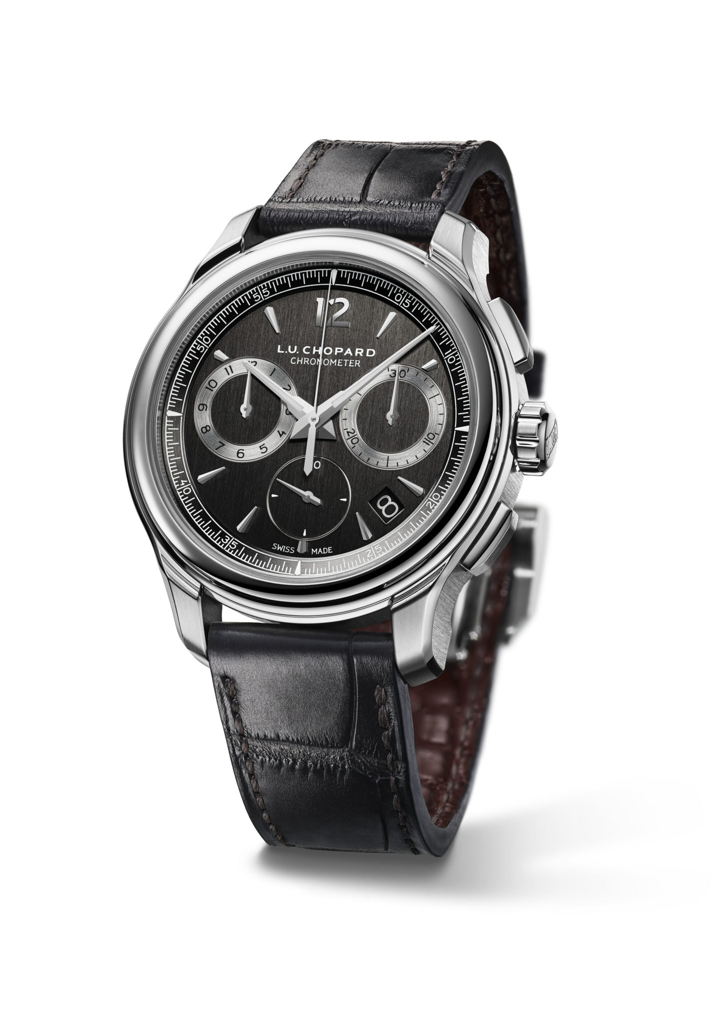 Avec le chic de son camaïeu de gris, le garde-temps L.U.C Chrono One Flyback est imprégné de l’élégance décontractée, contemporaine et maîtrisée qui est la signature unique des créations L.U.C. Limité à 250 exemplaires en acier, il est équipé d’un calibre certifié chronomètre, conçu et assemblé au sein de Chopard Manufacture. Le mouvement L.U.C 03.03-L, d’une durée de marche de 60 heures, est de type retour en vol, ce qui permet au L.U.C Chrono One Flyback de mesurer des temps courts à la volée. En effet, la fonction flyback permet de remettre les compteurs à zéro et de relancer un chronométrage d’une seule pression. Le calibre est également équipé d’un stop seconde, qui autorise une mise à l’heure de grande précision. Enfin, il est doté d’un rotor ajouré en or 22 carats. Toutes ces technologies mises au point par les équipes de recherche et développement de Chopard font l’objet de 4 brevets.