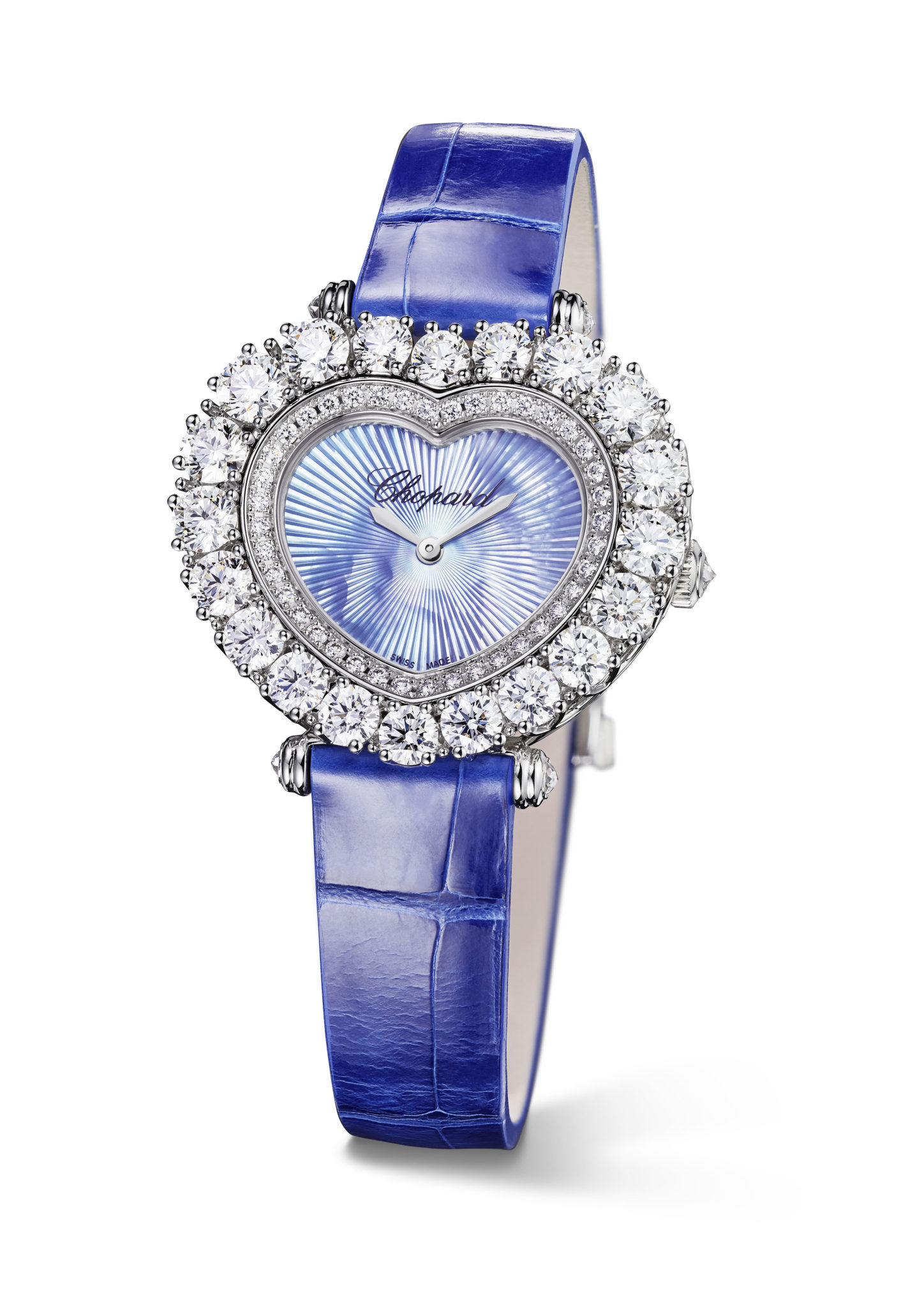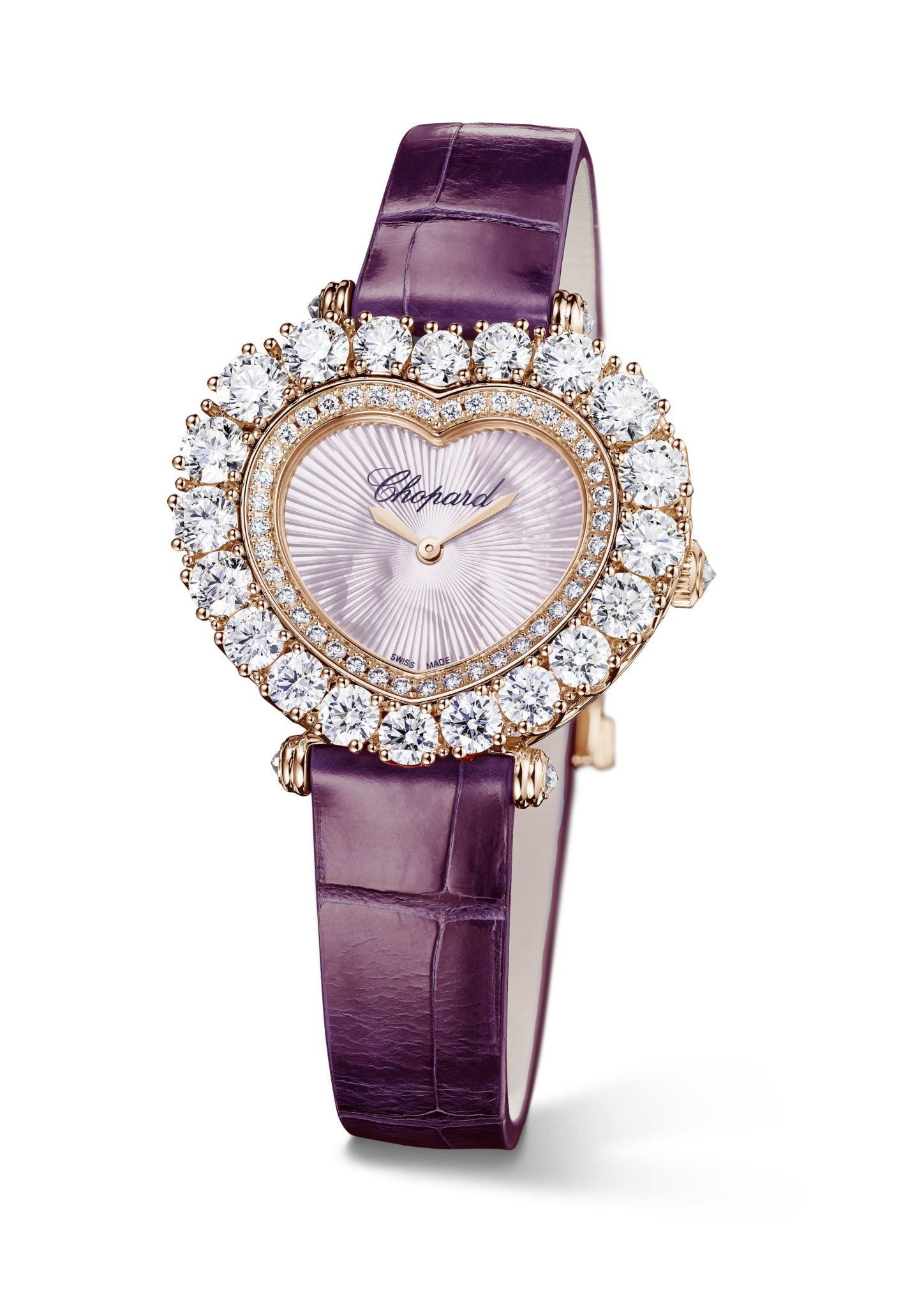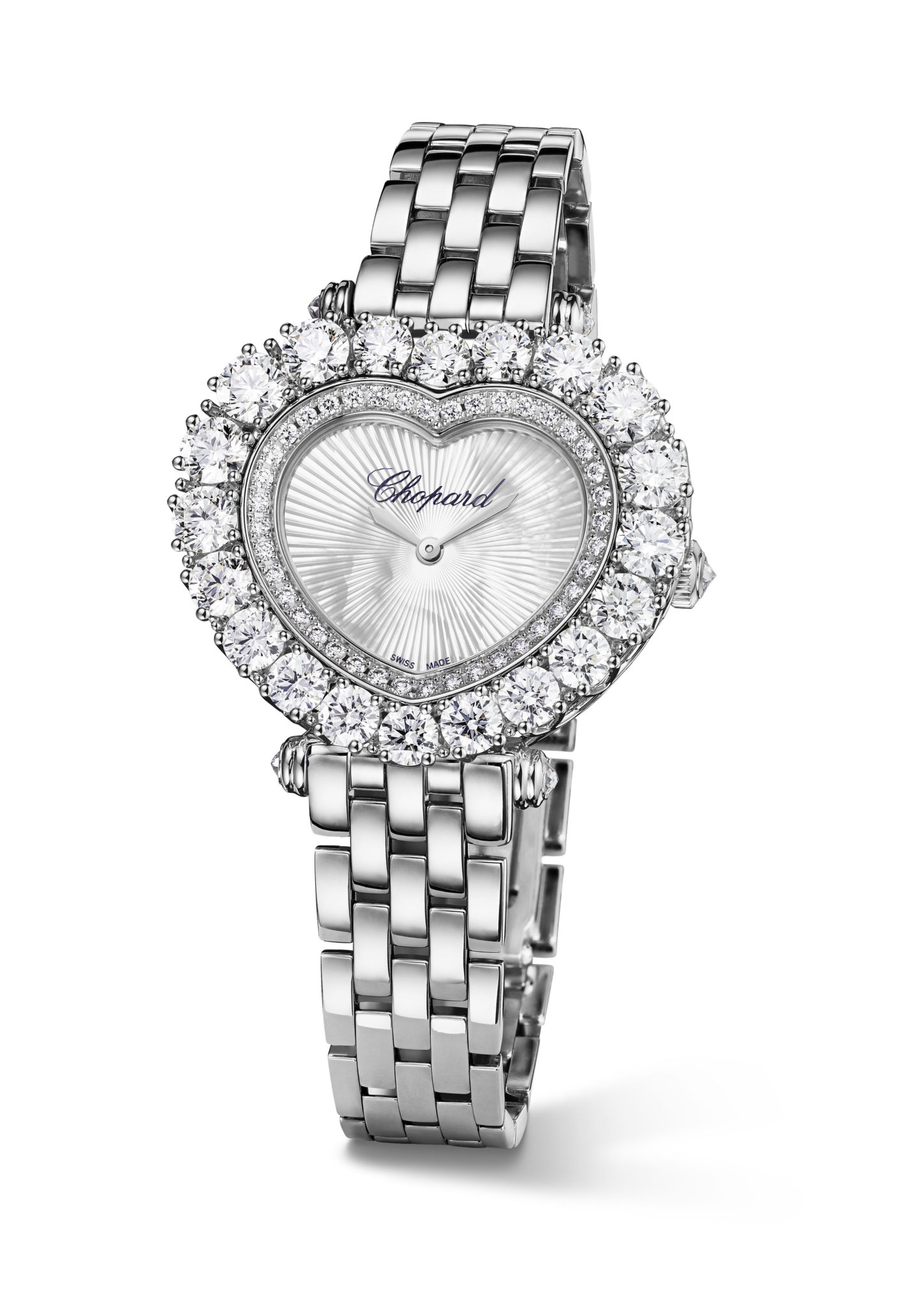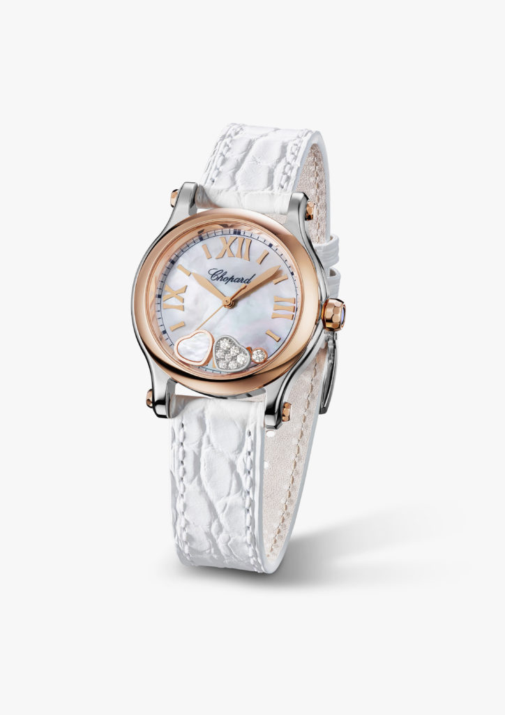 Après une première montre déjà présentée en 2019, la collection Happy Hearts accueille à nouveau un modèle de garde-temps laissant danser sur son cadran des cœurs en liberté. Au cœur de son boîtier de 30 millimètres, en acier et or rose 18 carats, le cadran composé d’un délicieux lit de nacre accueille la danse d’un diamant mobile et de deux cœurs mobiles, l’un en or rose 18 carats et en nacre, l’autre en or blanc 18 carats serti de diamants.