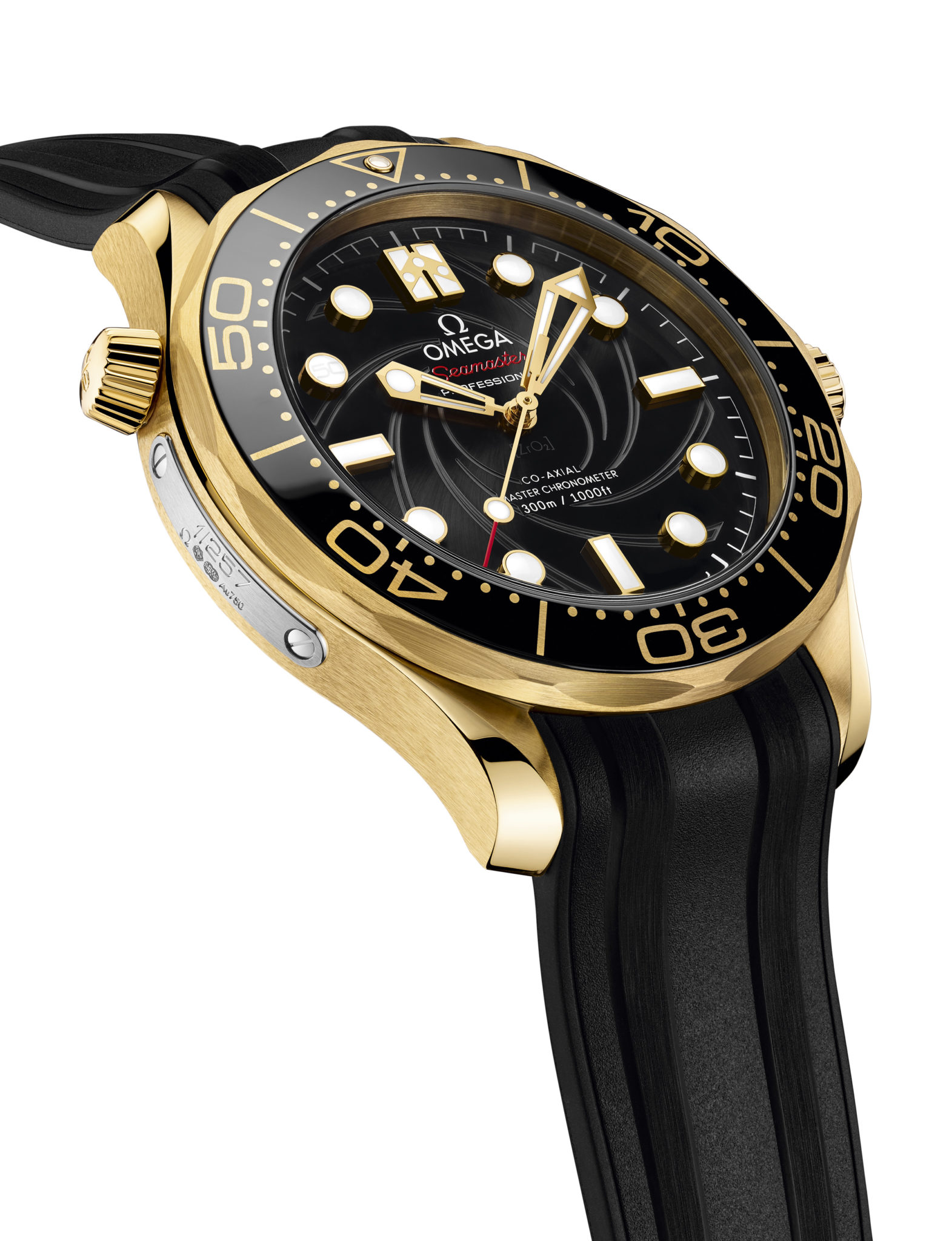 Le deuxième modèle, en or jaune 18K, arbore un bracelet en caoutchouc noir avec une boucle en or jaune 18K. Sur cette montre, la plaque comportant le numéro de série limitée de chaque exemplaire est en or blanc 18K tandis que la lunette en céramique noire arbore une échelle de plongée en Ceragold™ OMEGA.