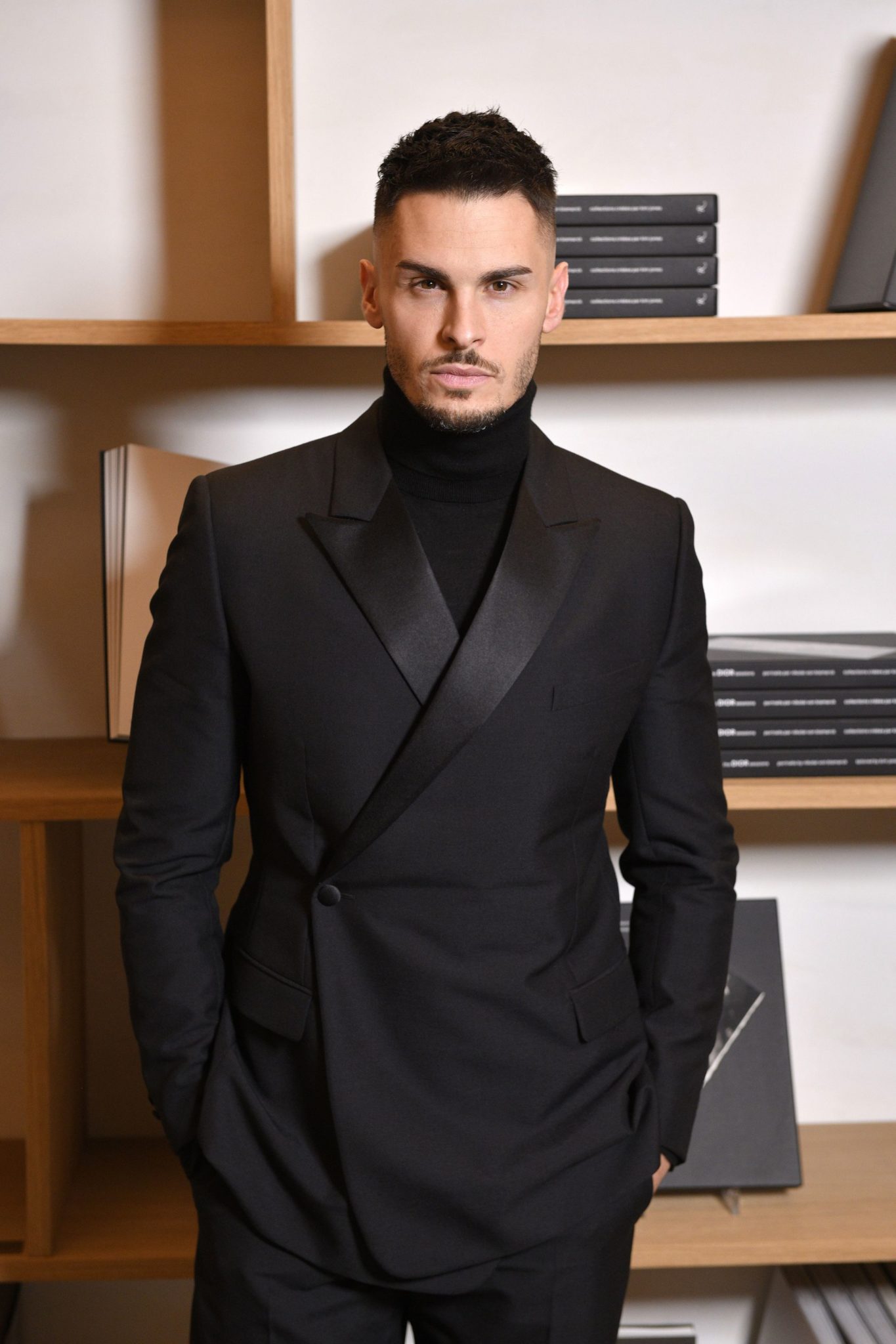 Baptiste Giabiconi wore a Dior Pre-Fall 19 men’s collection black mohair wool oblique tuxedo, a black wool turtle neck and black leather derbies.