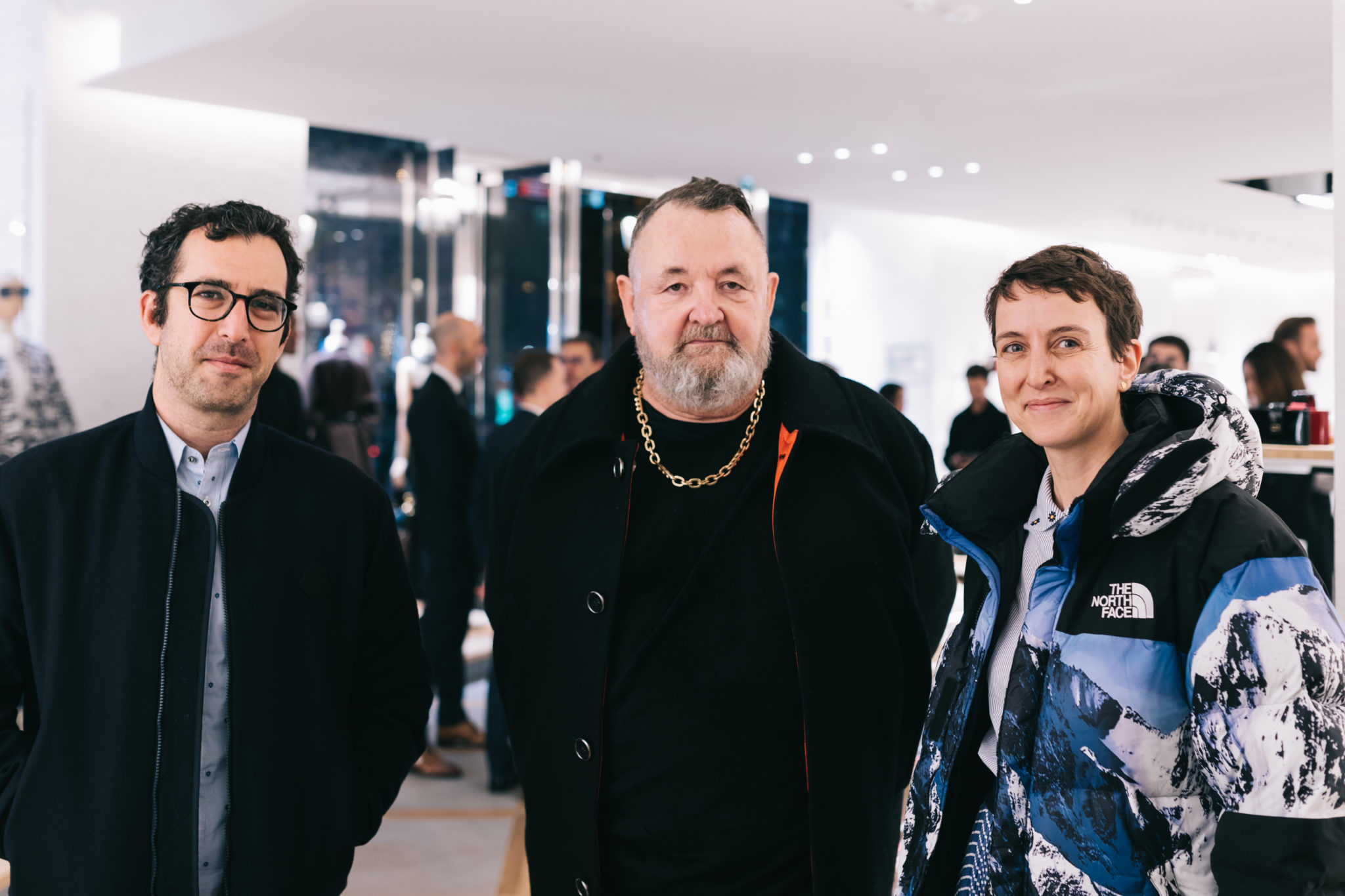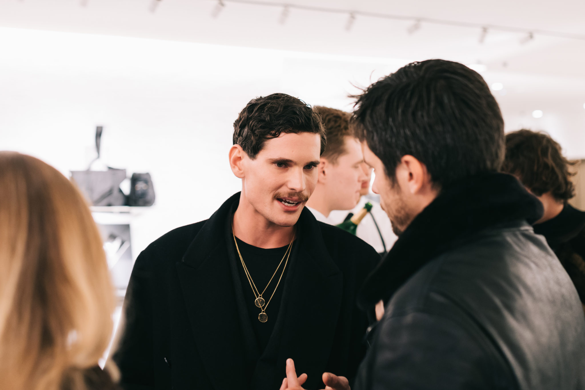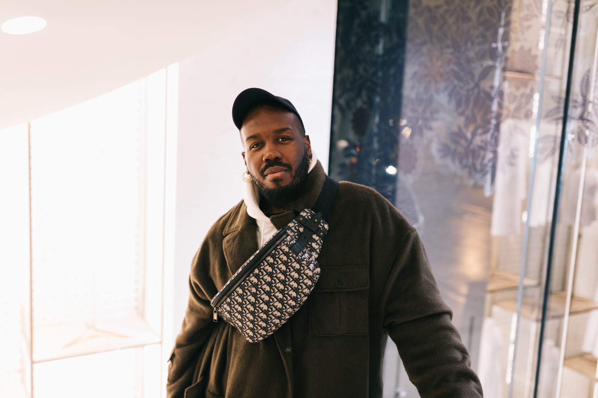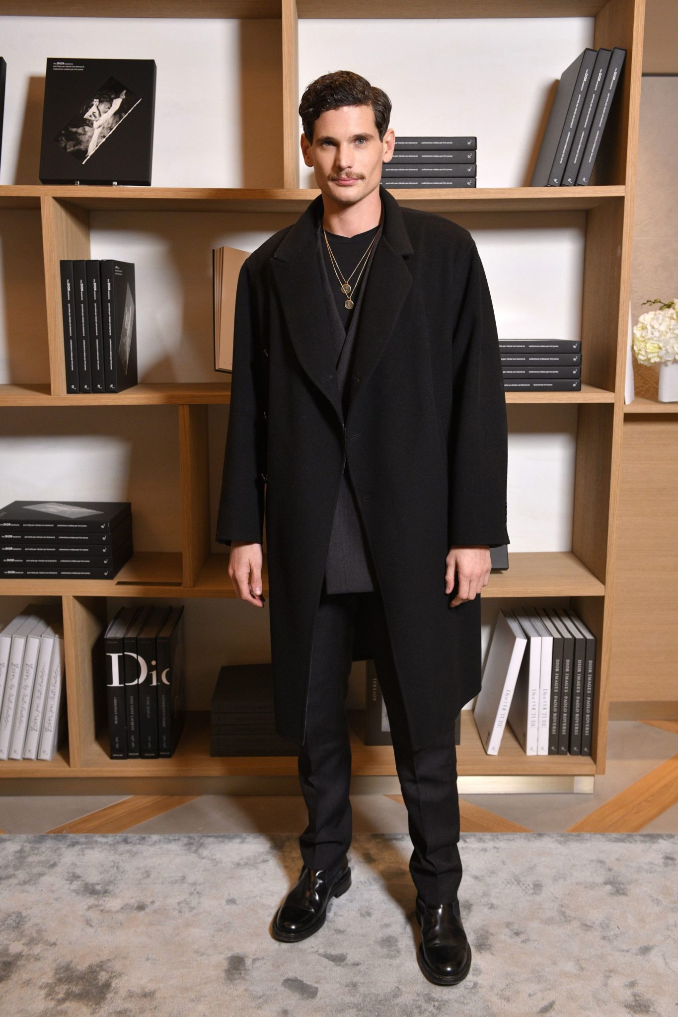 Jérémie Laheurte wore a Dior Winter 2019-20 men’s collection black cashmere peak lapel coat, a grey wool peak lapel double breasted suit and black leather boots.