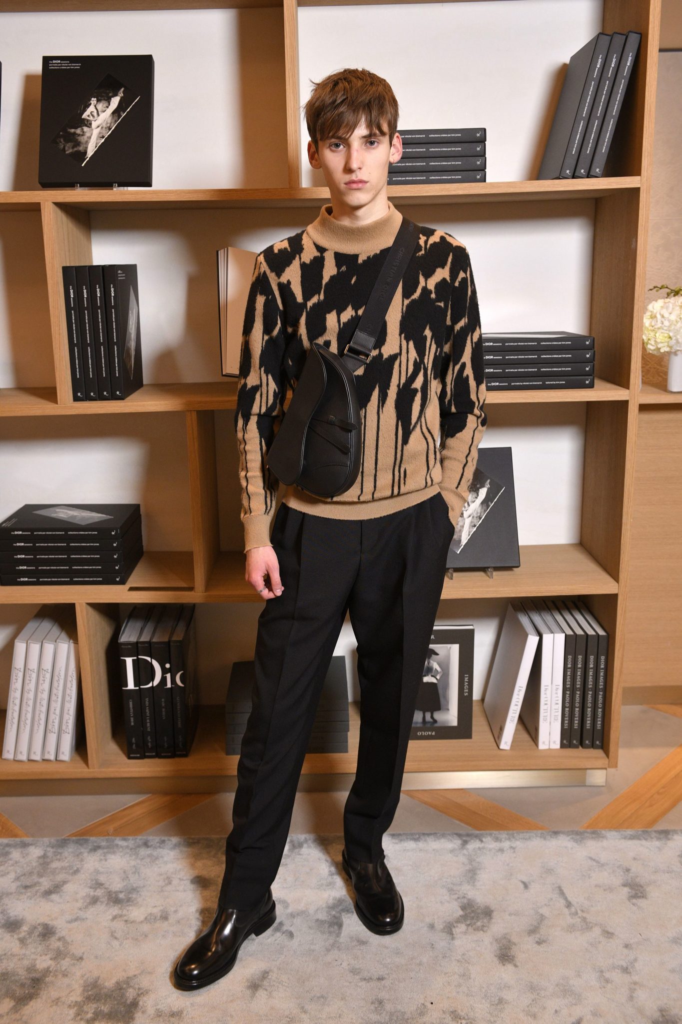 Robin Avignon wore a Dior Winter 2019-20 men’s collection brown cashmere with « Raymond Pettibon » mockneck jumper, black wool pants and a pair of black leather boots.