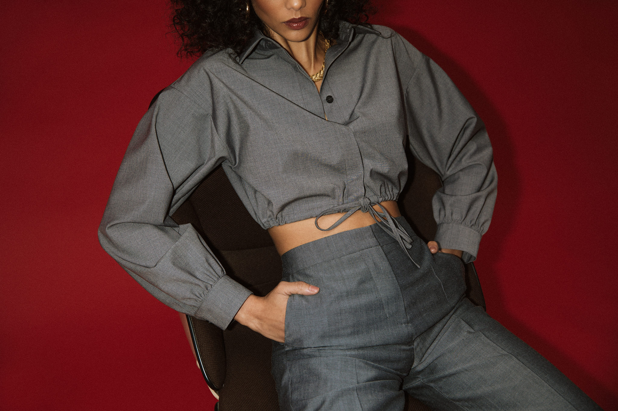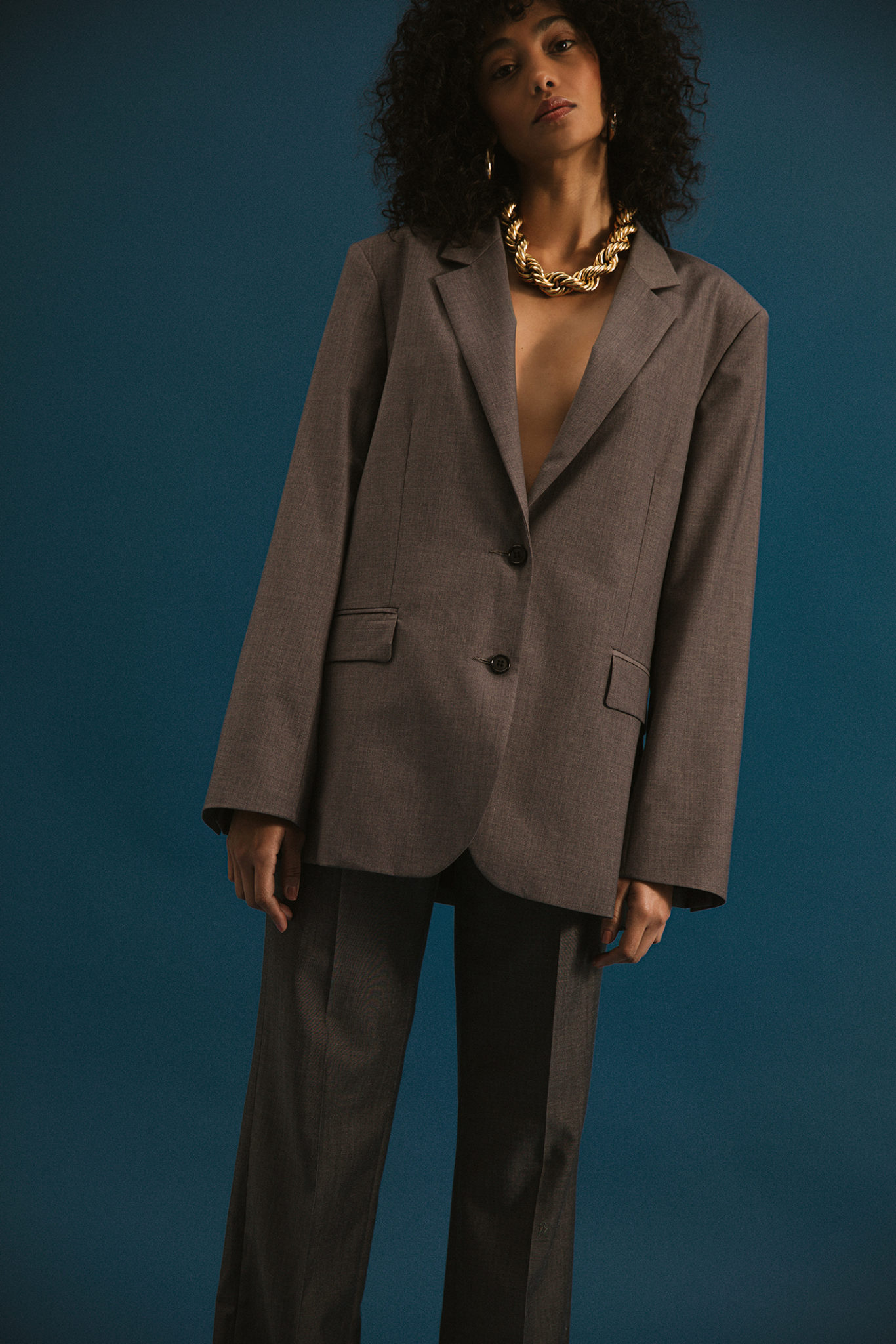 ON CRAQUE POUR LE COSTUME EN FIL À FIL GRIS DONT LE VOLUME DE LA VESTE RÉSOLUMENT BOYFRIEND S’ASSORTIT À UN PANTALON DROIT À LA COUPE IMPECCABLE ET QUI EN FONT UNE PIÈCE PHARE DE CETTE NOUVELLE COLLECTION.