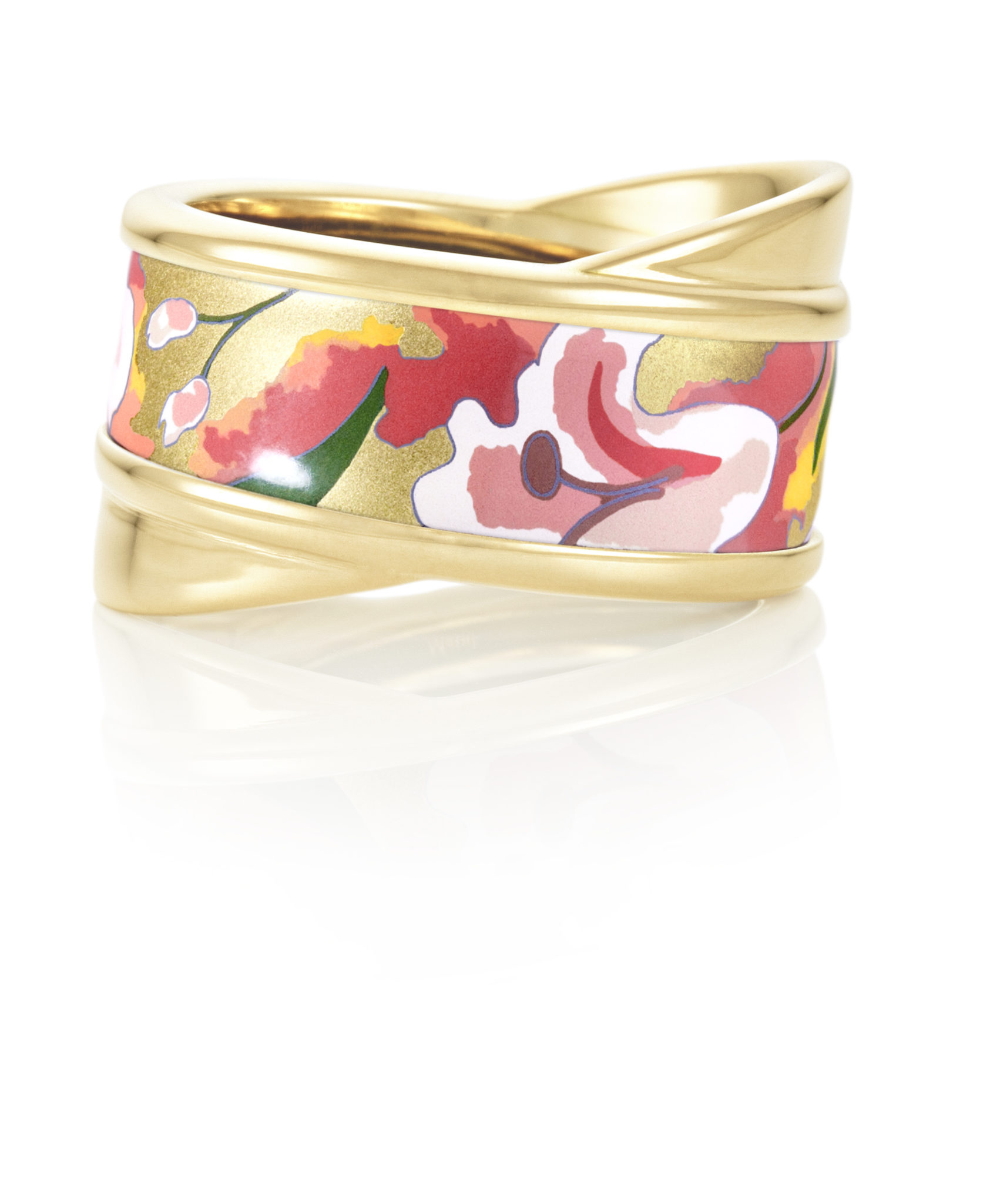 Un monde coloré de fruits tropicaux, de fleurs raffinées et de motifs représentant le folklore polynésien sont capturés dans cette variété tropicale. Irradié par un rouge intense, un jaune et un bleu profond, le motif TAHITI en émail grand feu et décoré à la poudre d’or 24 carats se présente sur une monture en rhodium pour offrir un choix alternatif à la collection Hommage. La manière de peindre de Gauguin est bien représentée à travers cette collection.