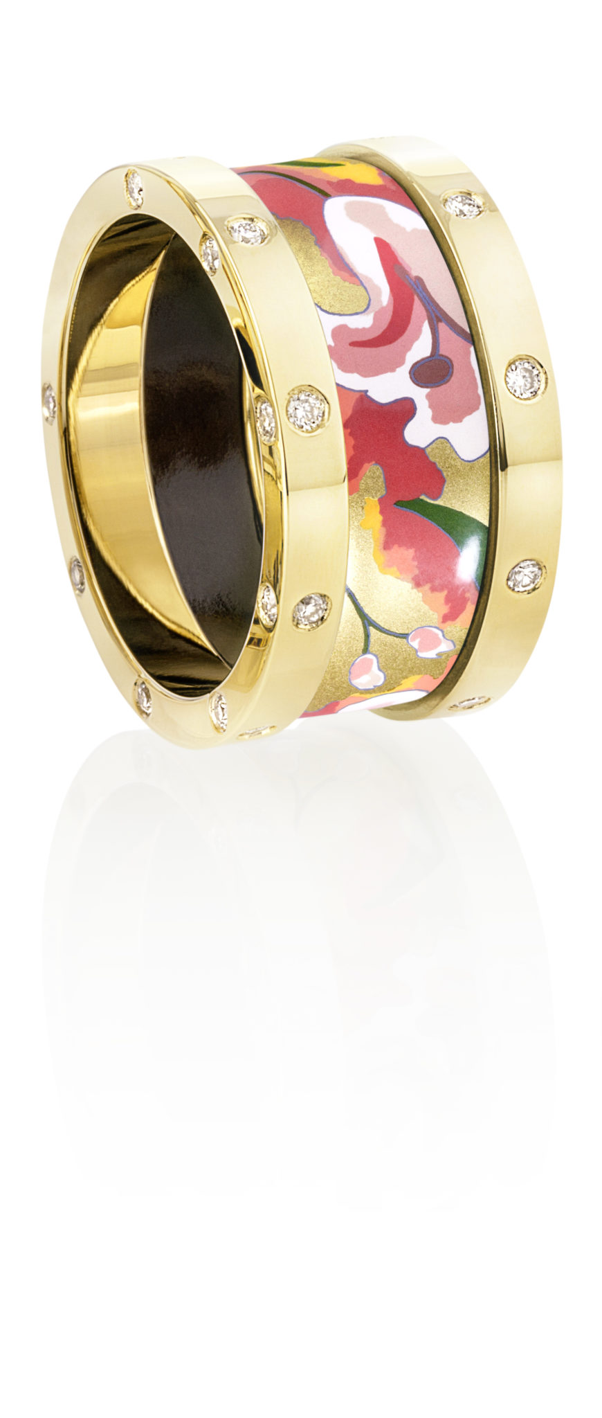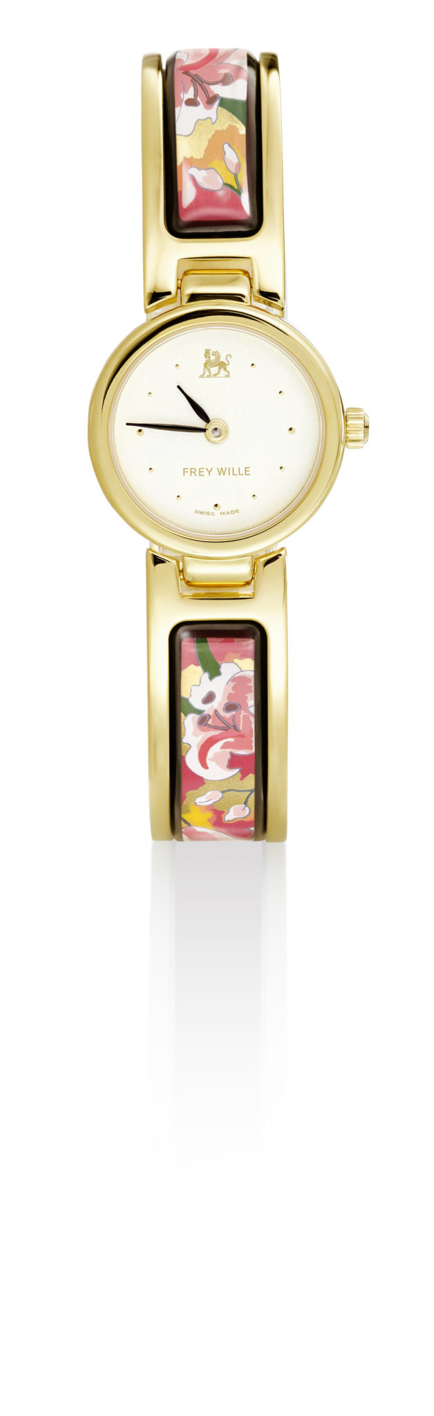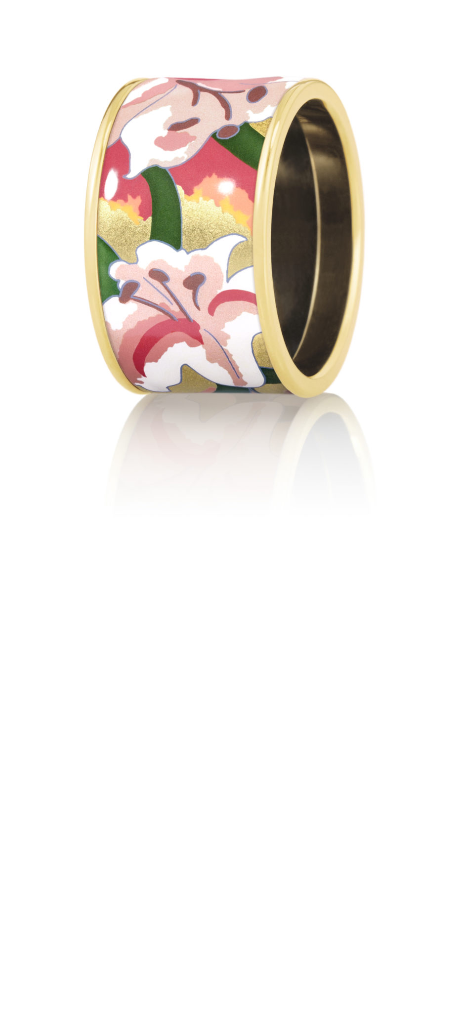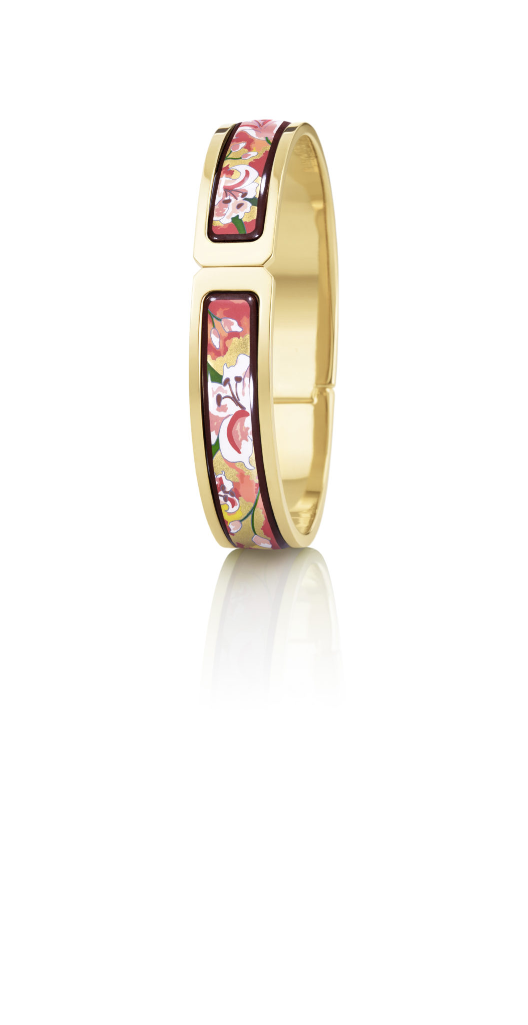 POLYNESIE reflète les magnifiques impressions florales et paysagères de Gauguin. L‘interprétation reprend ces aspects dans un motif expressif et lumineux, combiné à la poudre d‘or jaune 24 carats et l‘émail grand feu. Les principaux éléments de cette collection sont les magnifiques fleurs de lys blanches et roses représentées sur un fond orange, associées à un feuillage vert décoratif. Cette collection est disponible sur une monture dorée à l’or fin.