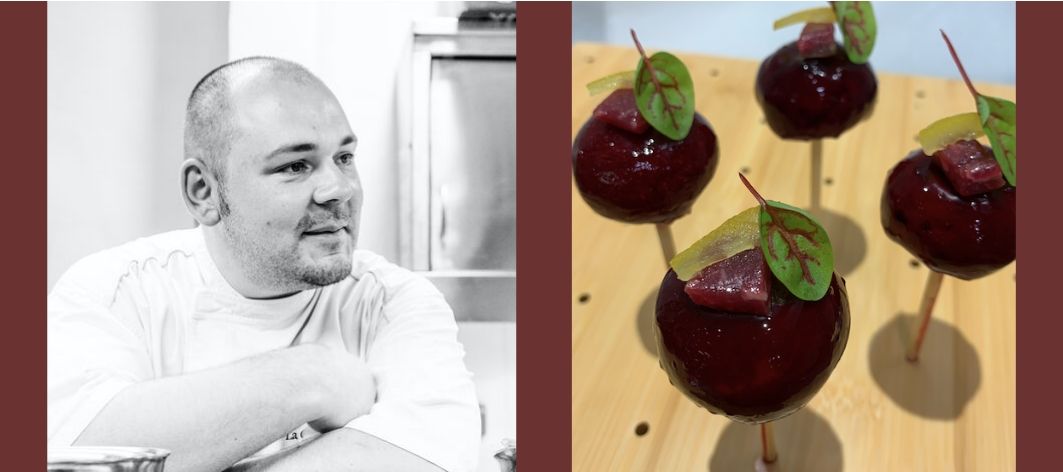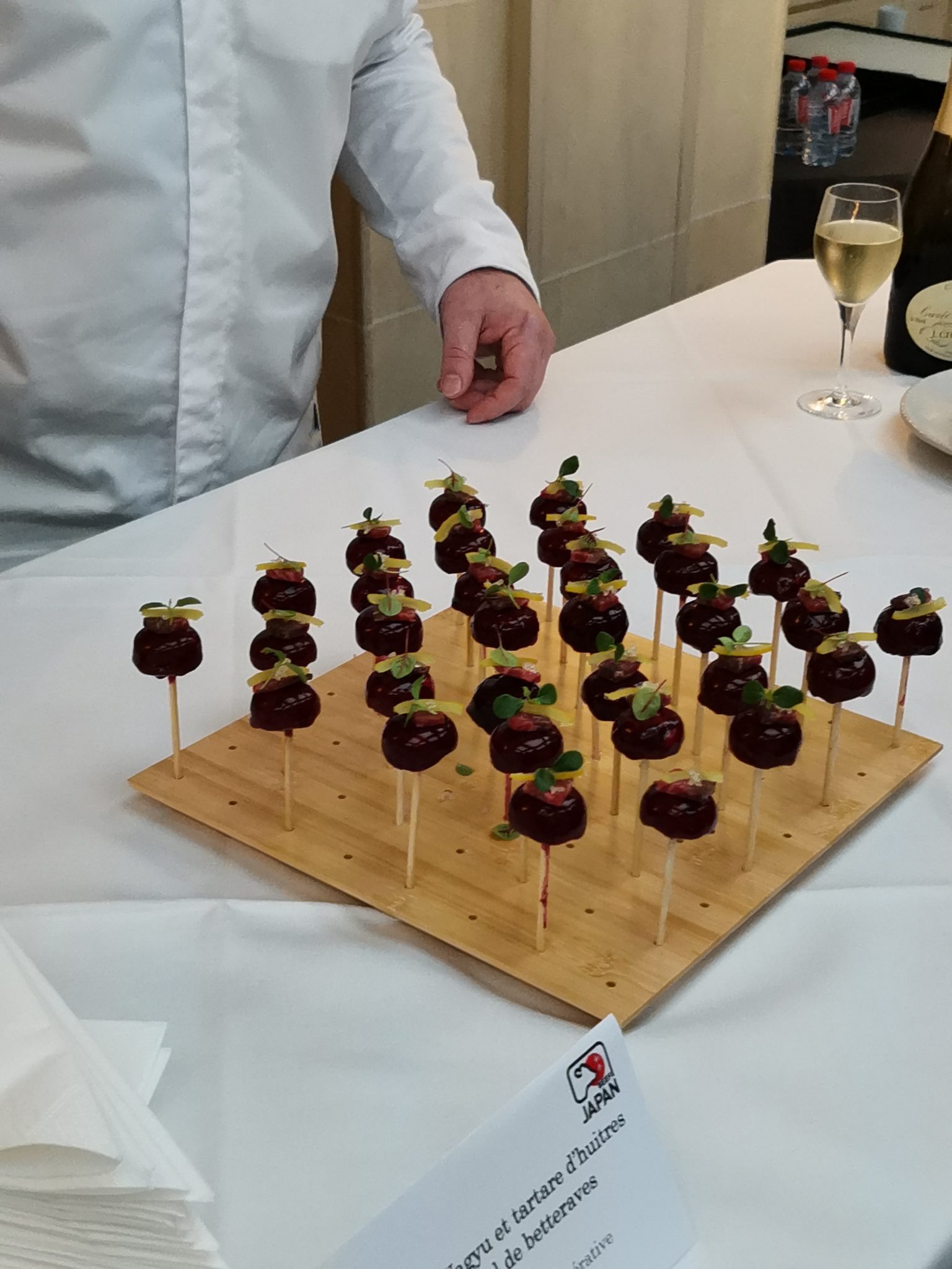 Plat : Sucette de Wagyu japonais et tartare d’huitres en cru et cuit, gel de betteraves