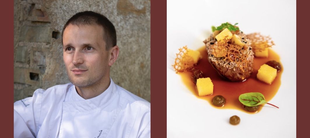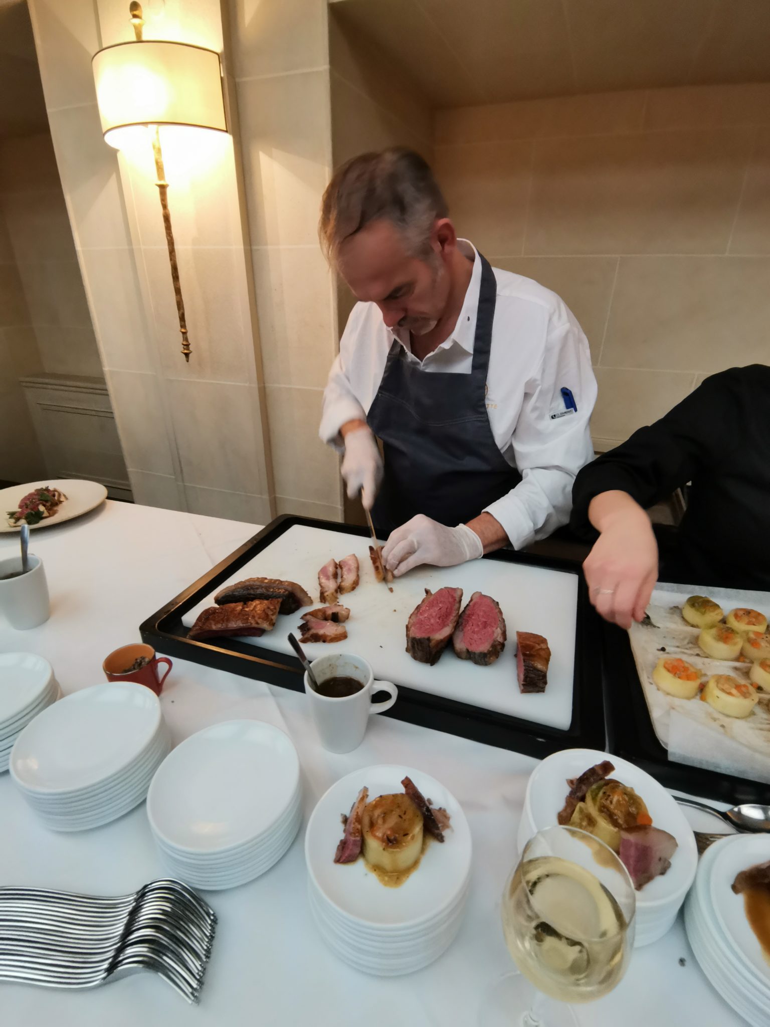 Plat : Cannelloni de basse côte de Wagyu japonais, potimarrons et cèpes rôtis, pomme dauphine, tendre tranche du Wagyu snacké, fumé minute, crumble d’ail noir