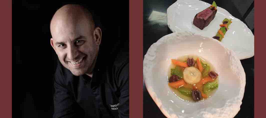 Plat : Pièce de Wagyu japonais rôti a la noix de coco, semoule épicée aux raisins de Corinthe, confiture d’aubergine et dentelle au cumin