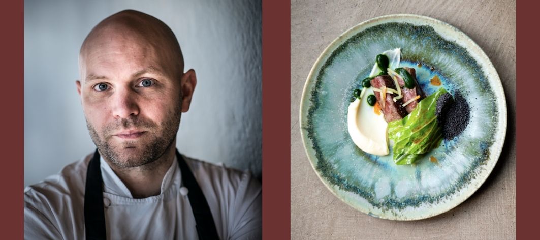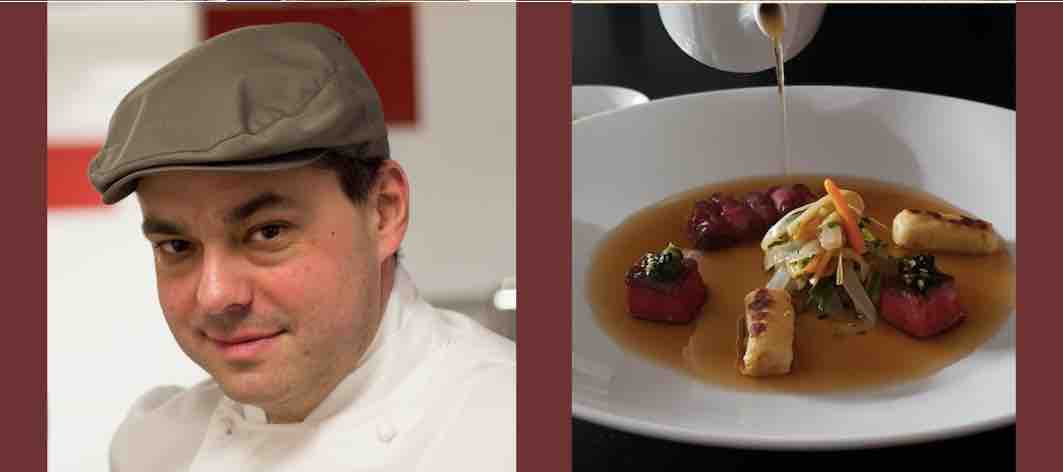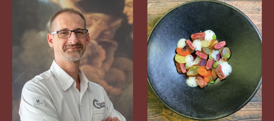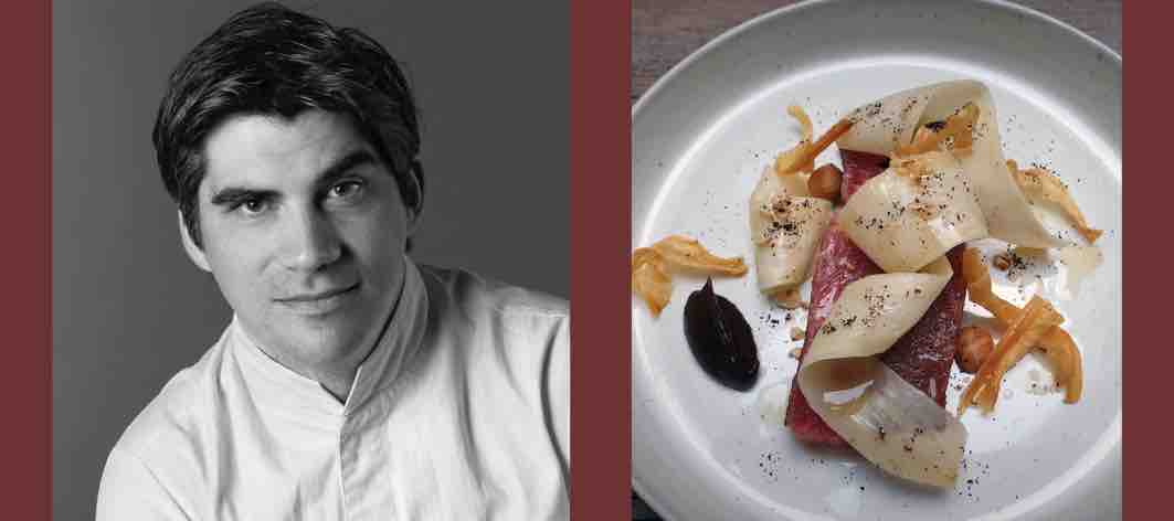 Plat : Wagyu japonais grillé en fines tranches, légumes d’hiver, condiment à l’orange et bouillon de betterave perlé à l’huile de céleri