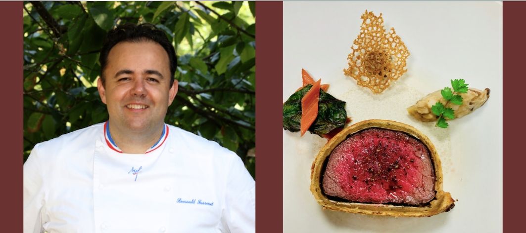 Plat : Rumsteak de Wagyu japonais en croute au Mélilot, gratin de blette au bouillon de bœuf et truffe, Sauce Vin Rouge et Poivre du Viet Nam