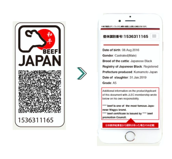 Le Conseil pour la promotion des exportations des produits japonais d’origine animale a mis en place un système de QR code sur chaque morceau du Wagyu japonais. Une fois scanné, le QR code affiche toutes les informations concernant l’animal sur votre smartphone : date de naissance du bœuf, sexe, race, état d’enregistrement du bœuf au Conseil, date d’abattage, niveau d’engraissement.