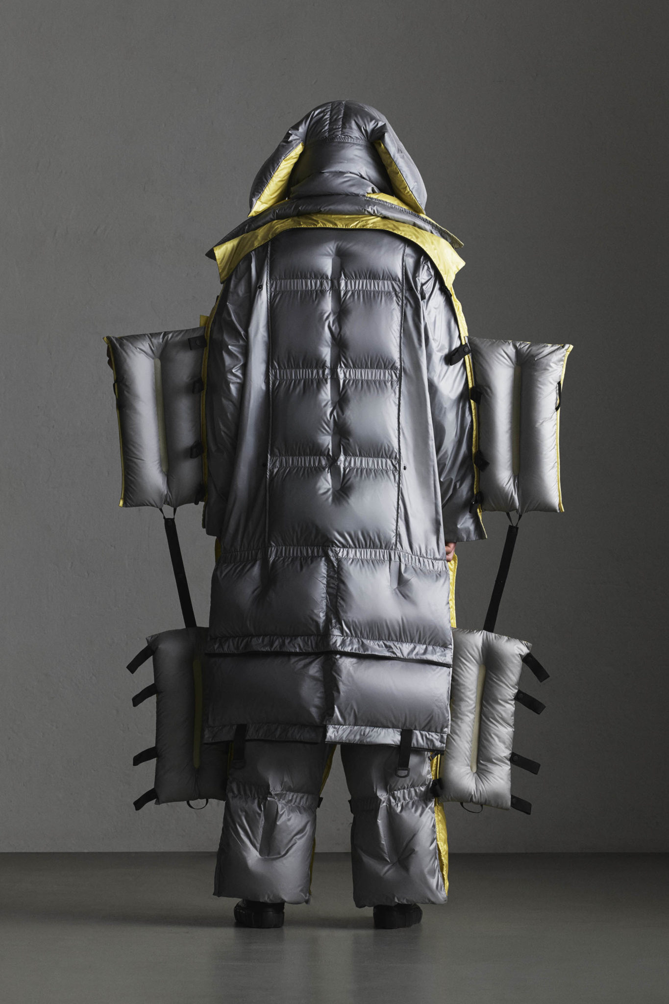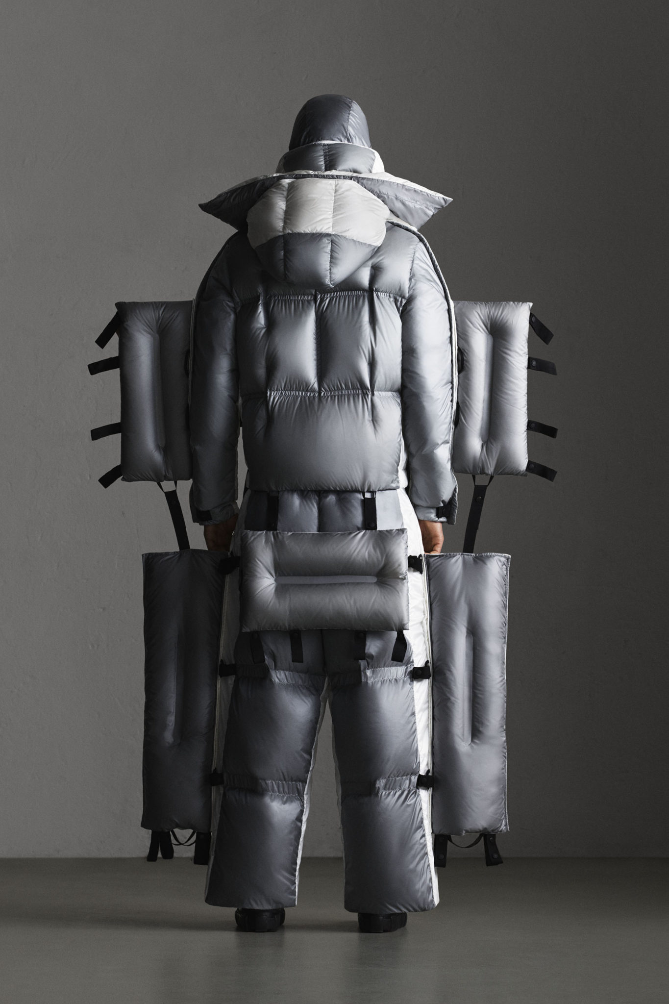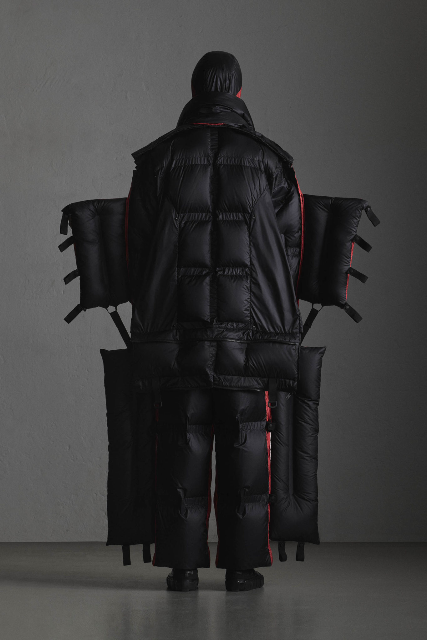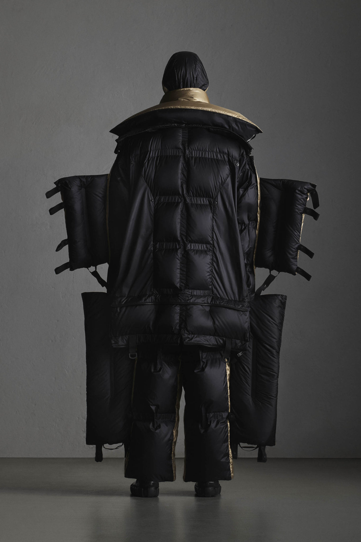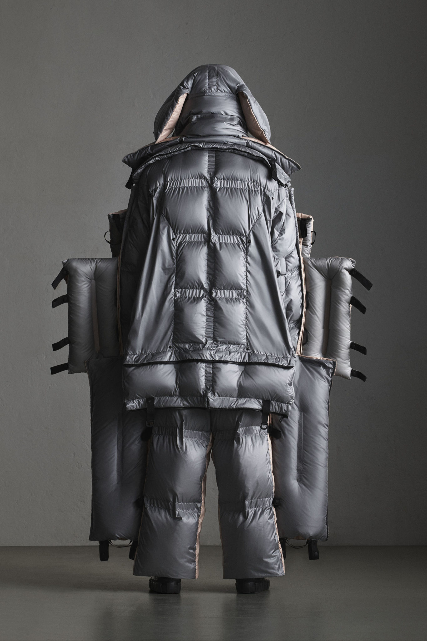 Les détails, comme les fermetures à glissière spéciales qui tirent l’air vers l’extérieur lorsqu’elles sont fermées et les boutons à pression, sont conçus pour optimiser la légèreté. Une nouvelle structure de fabrication de lé en duvet a été mise au point pour relever le défi de paquetage minimal, avec, entre chaque étoffe, un espace de 2,5 cm servant de charnière afin que l’article puisse être plié.
