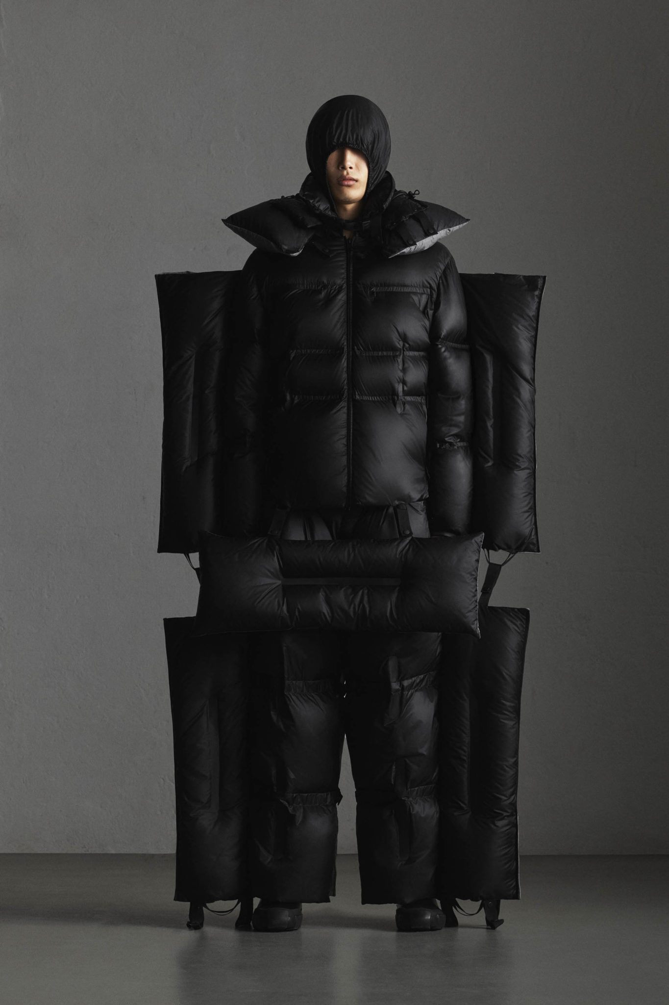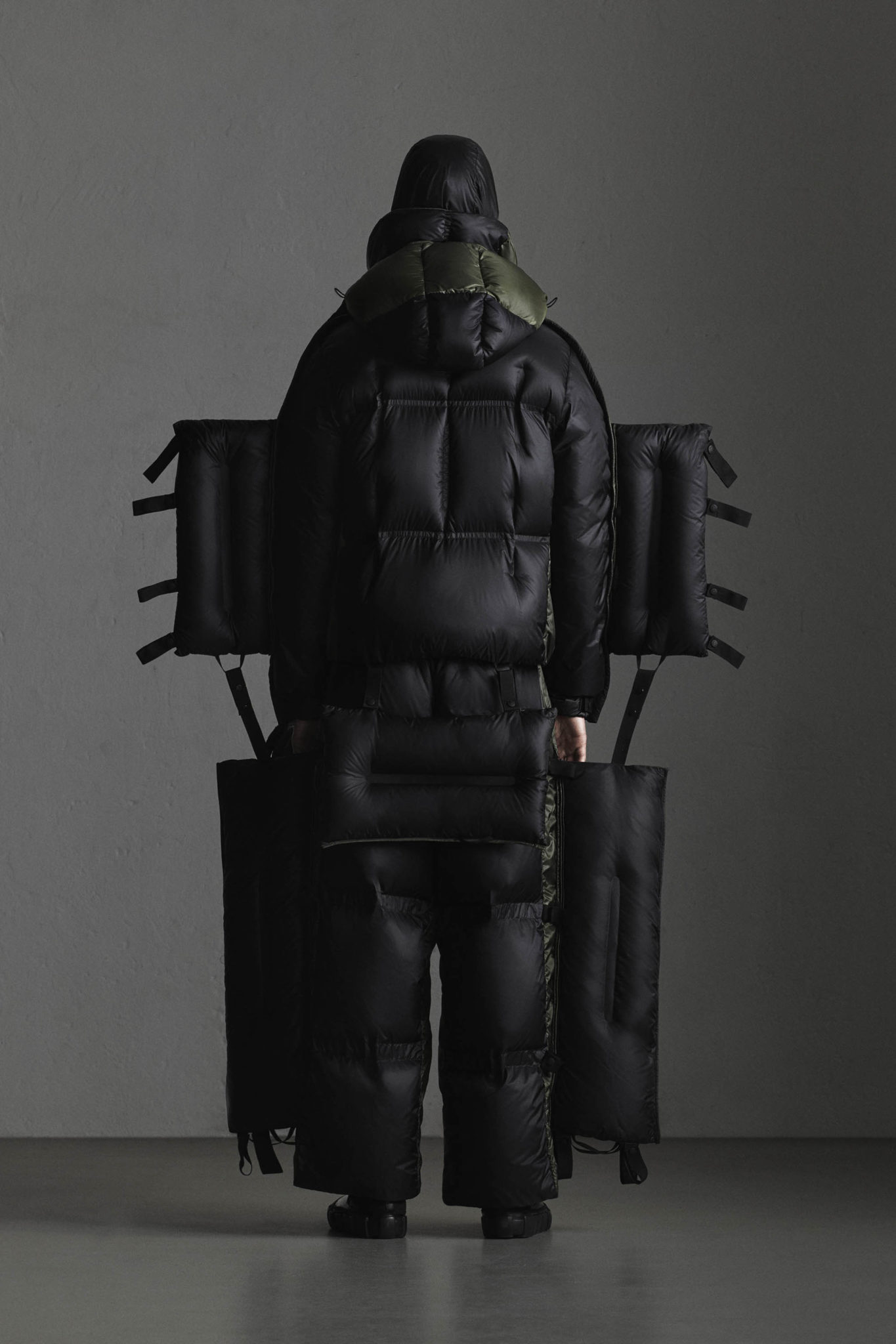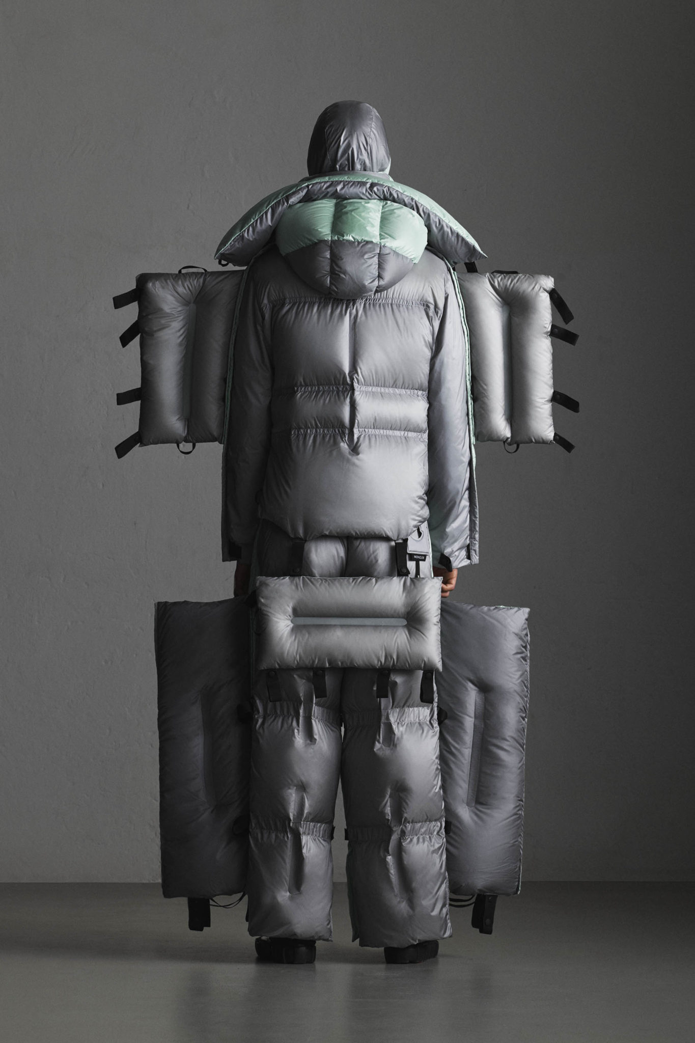 Green a conçu pièces audacieuses, faites d’une série de modules légers qui peuvent se plier, s’aplatir et se ranger, définissant des formes qui rétrécissent et grossissent pour que les gros volumes deviennent tout petits. Puisant son inspiration dans les propriétés de la plume et fasciné par la capacité de cette matière qui, même à faible dose, parvient à remplir un espace beaucoup plus grand, Green signe un outerwear poids plume qui, conserve néanmoins, tout son pouvoir de protection. Tous les vêtements – blousons zippés à capuche matelassée, parkas, vêtements de sport – peuvent être séparés et pliés pour former de très petits cubes.