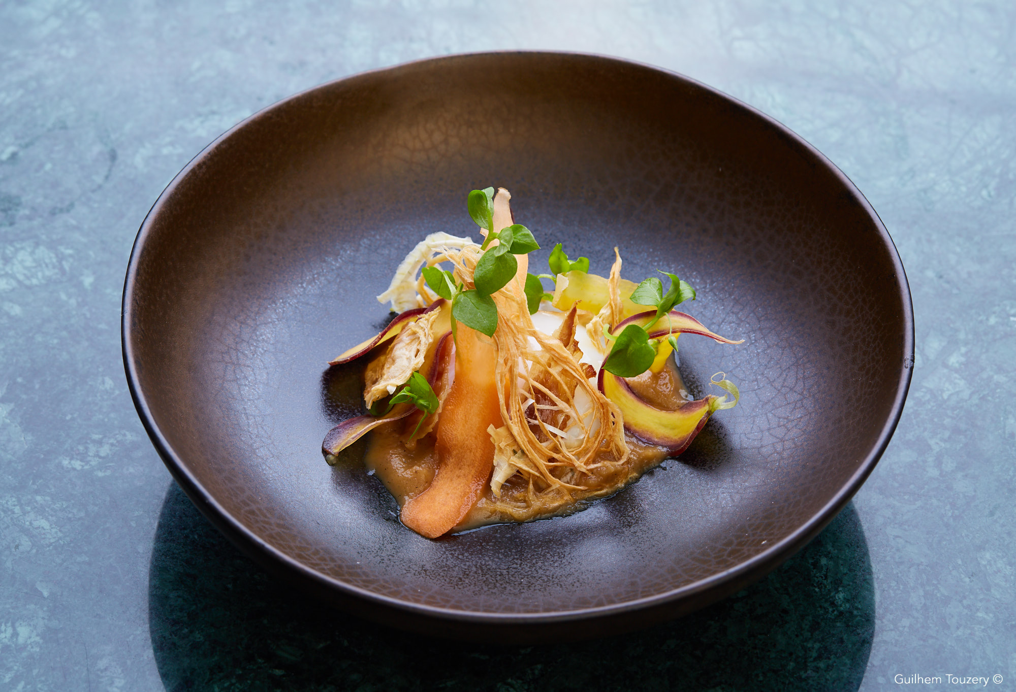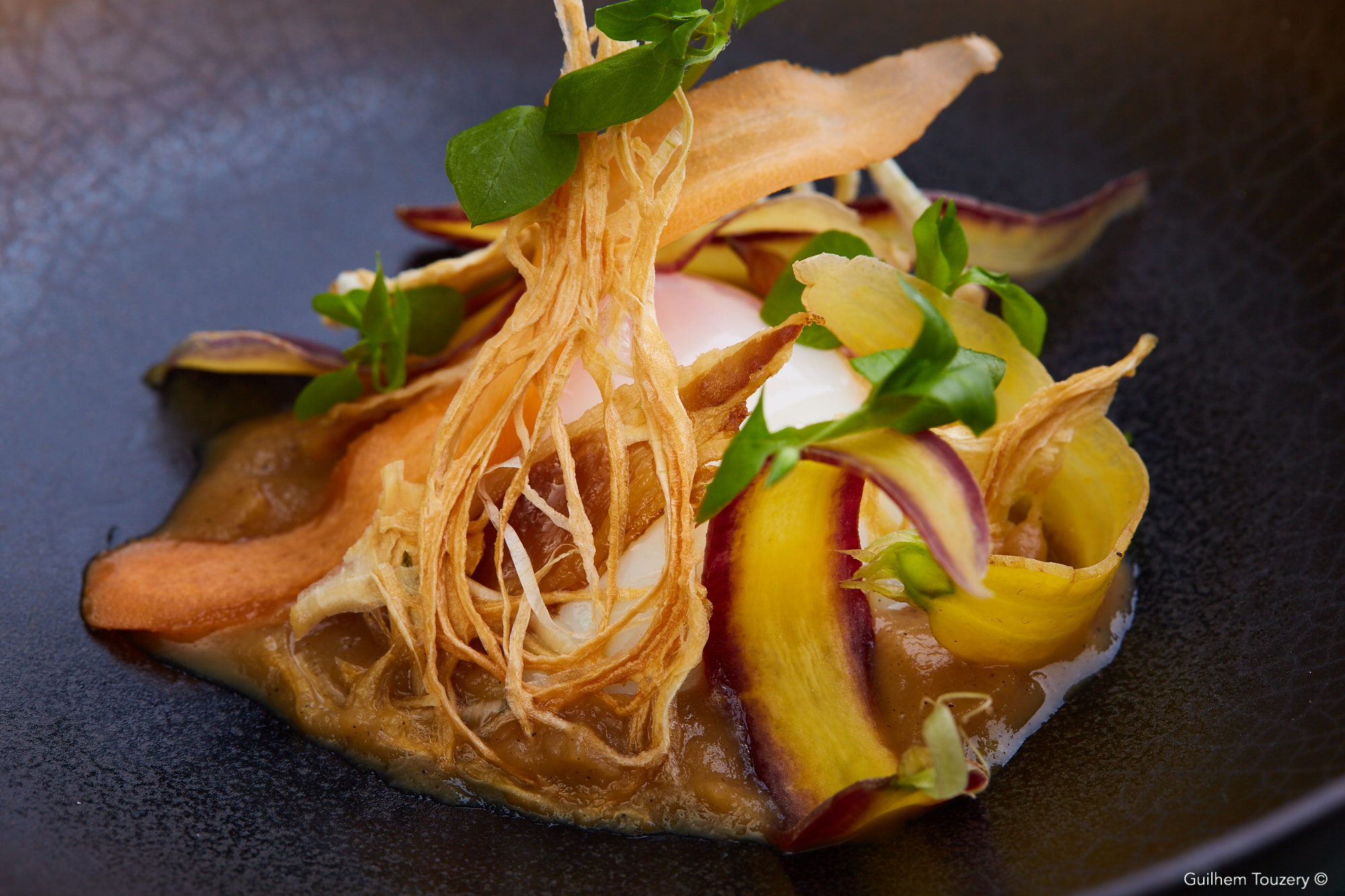 Le bœuf de l’Aubrac maturé et cacao jus terreux au cacao, cerfeuil tubéreux, aligot de ratte à la tome de l’Aubrac, trompette de la mort