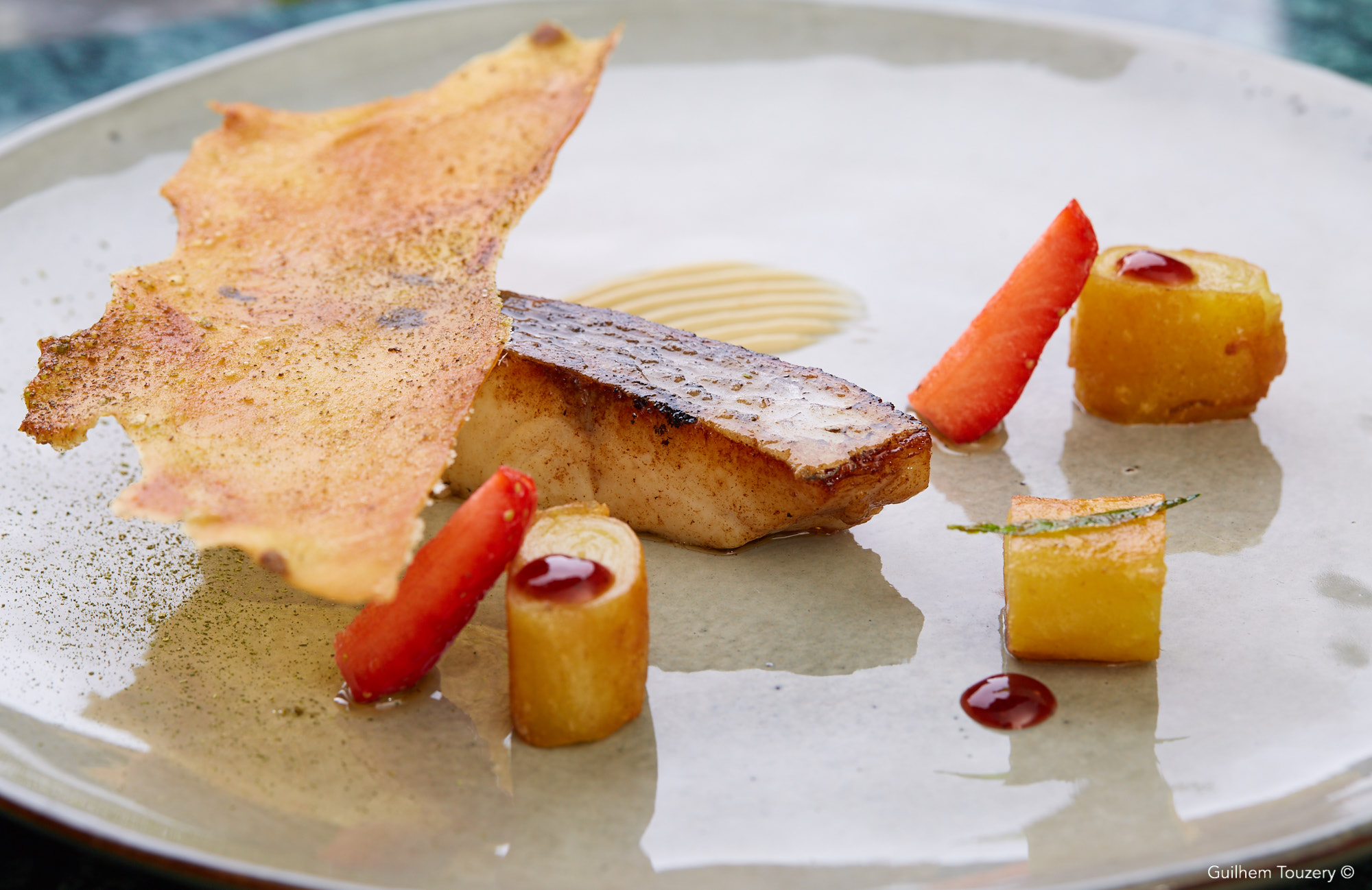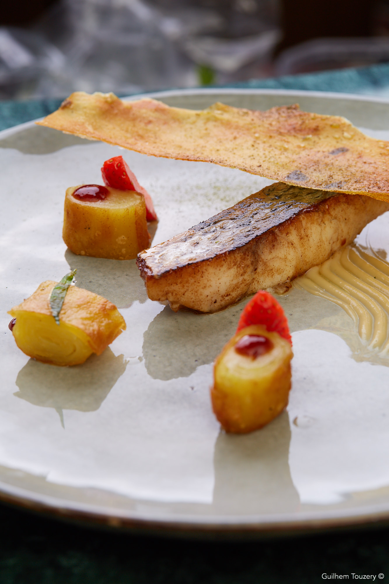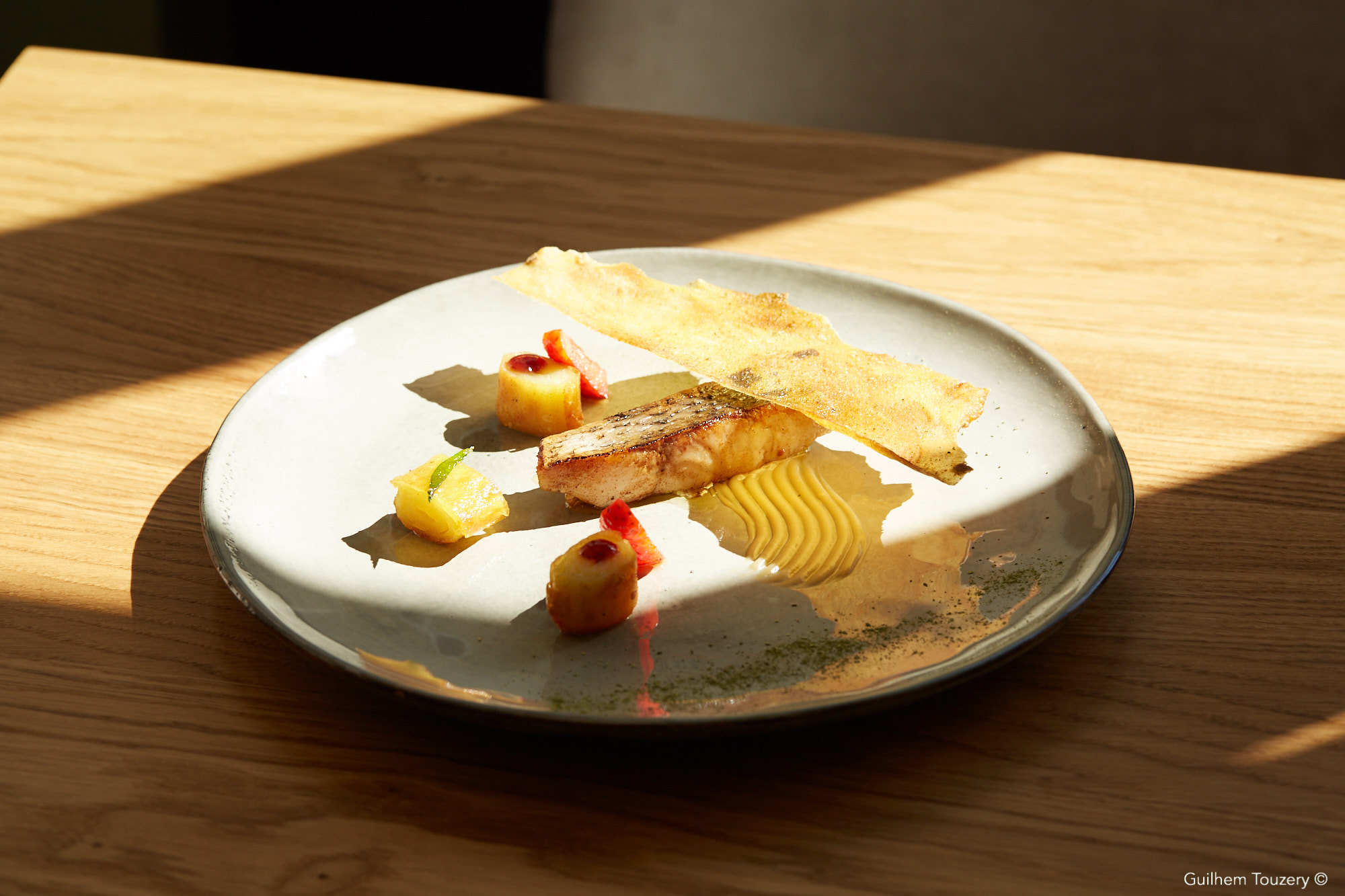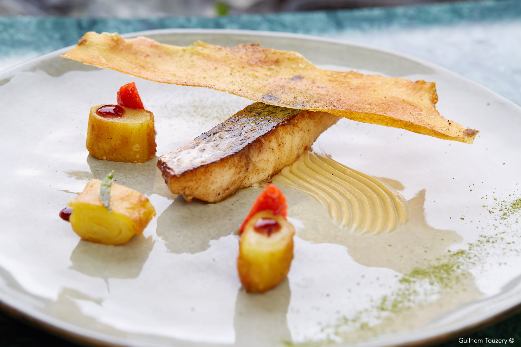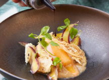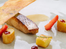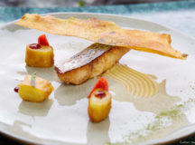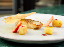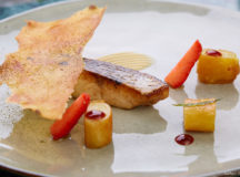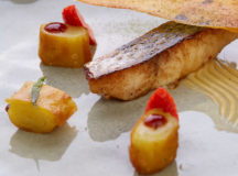 Le bar de ligne d’Atlantique française au Phu Quoc sauce crème au poivre Phu Quoc, salsifis et trévise flamme