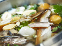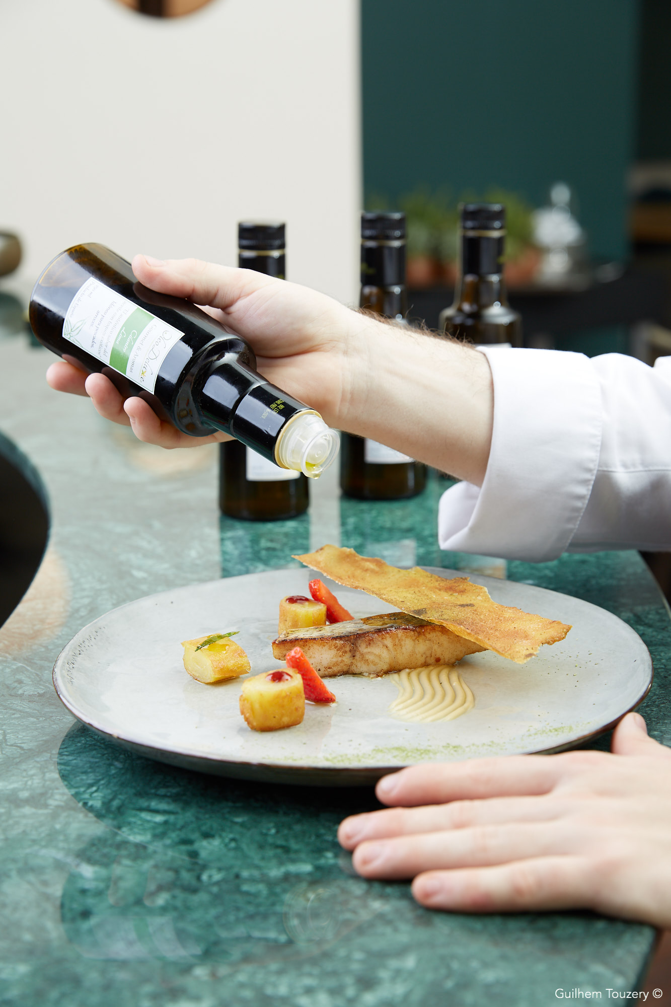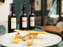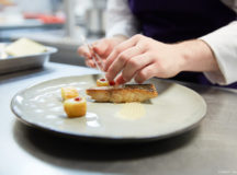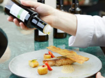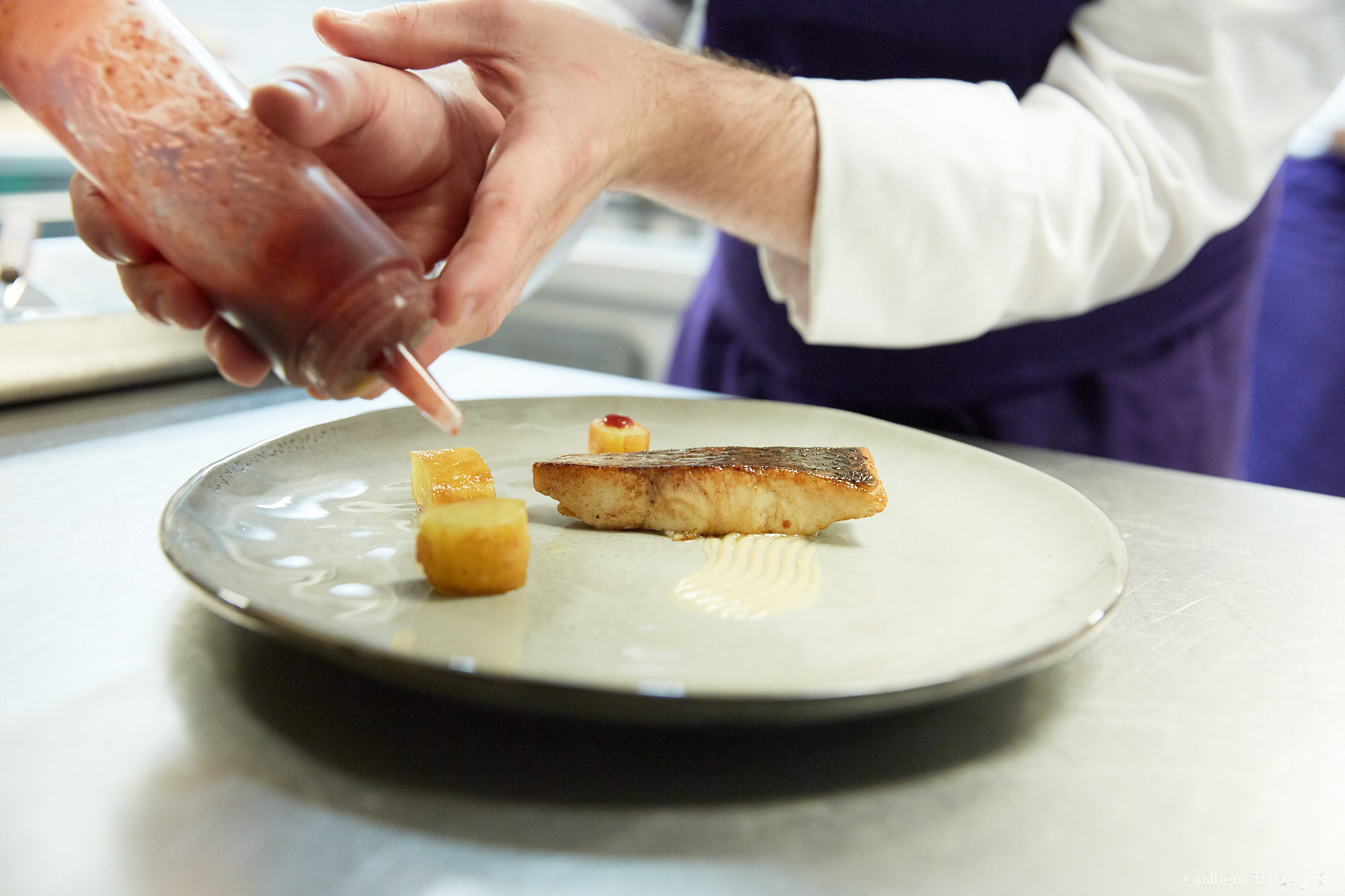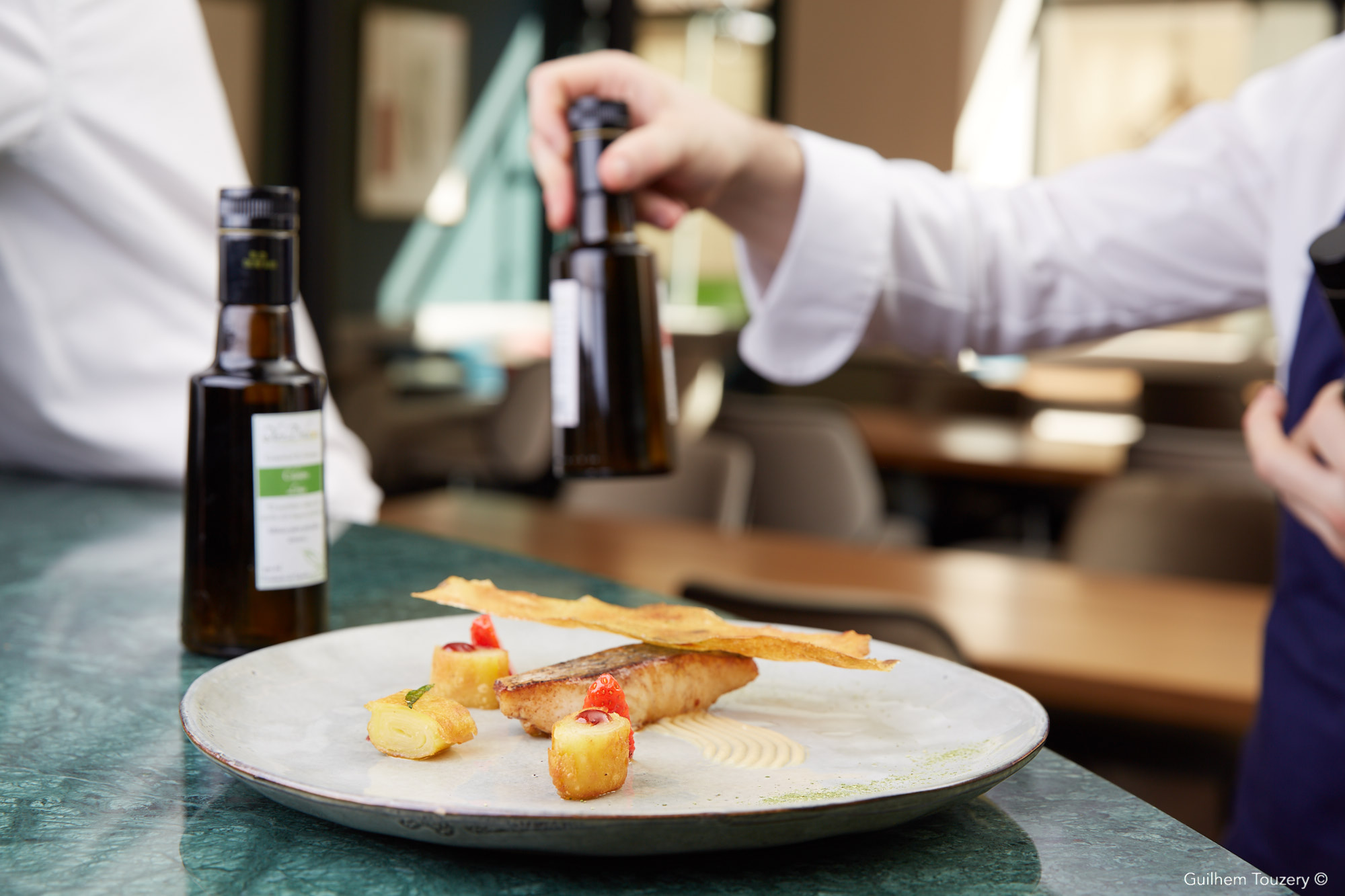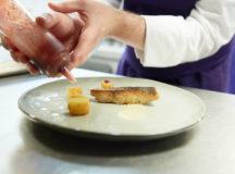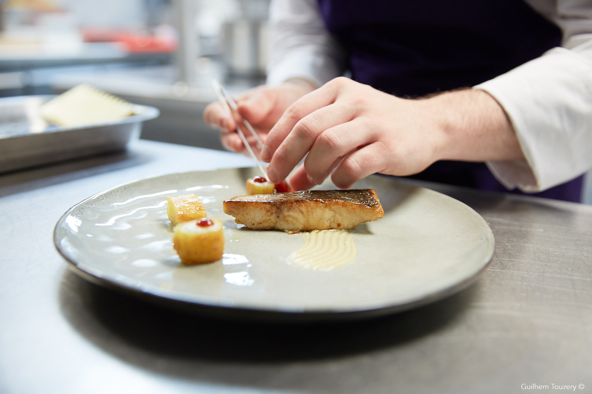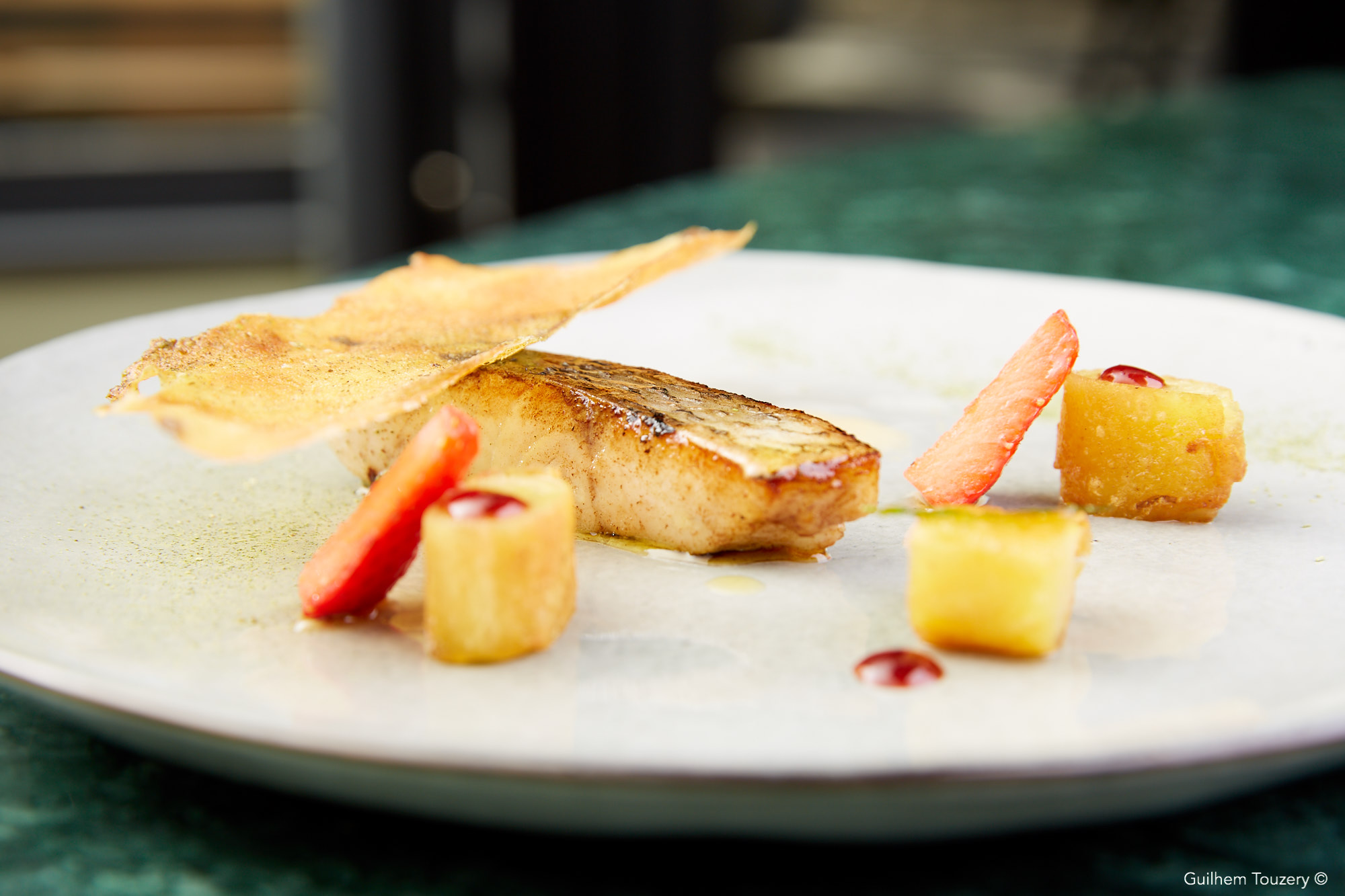 Le bar de ligne d’Atlantique française au Phu Quoc sauce crème au poivre Phu Quoc, salsifis et trévise flamme