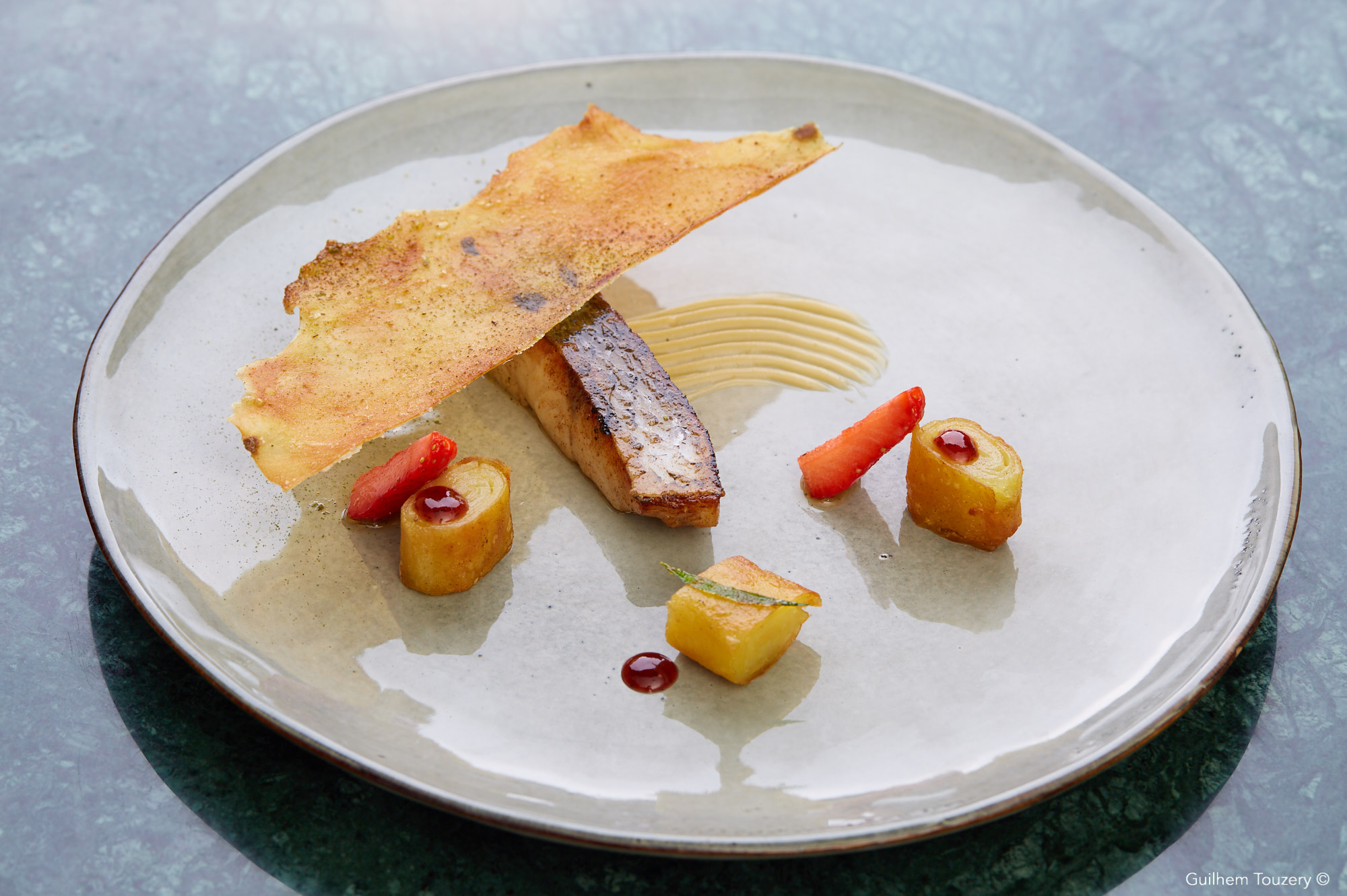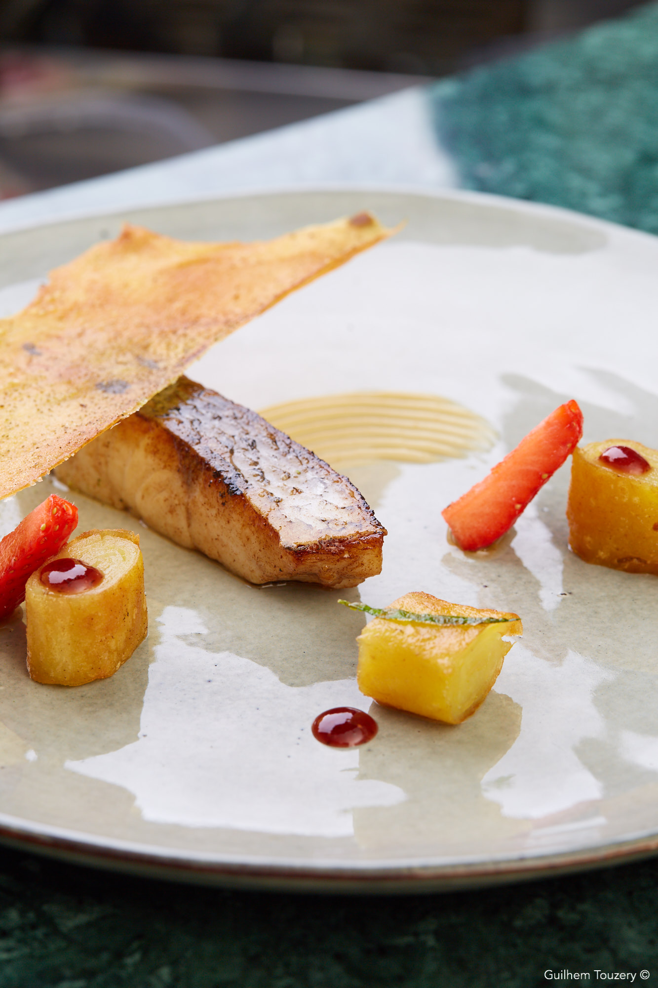 Le foie-gras, bœuf et clémentine Corse pressé de foie-gras et paleron à la clémentine Corse, fine gelée de dashi maison