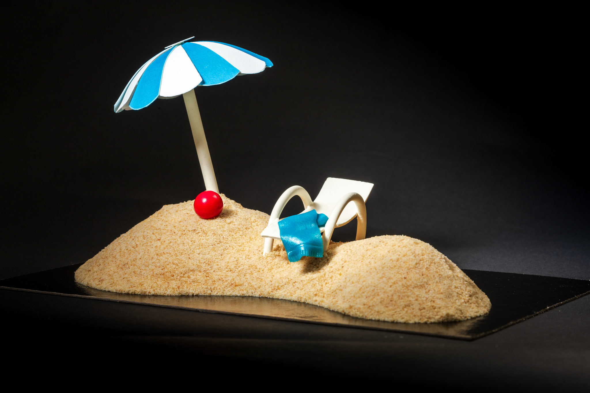 Représentant à la perfection la plage de la Croisette à Cannes, tous les décors se savourent ! Le transat est en chocolat, le sable est un crumble de poudre d’amande, la serviette et le ballon sont confectionnés en pâte d’amande et le parasol en pâte à sucre.