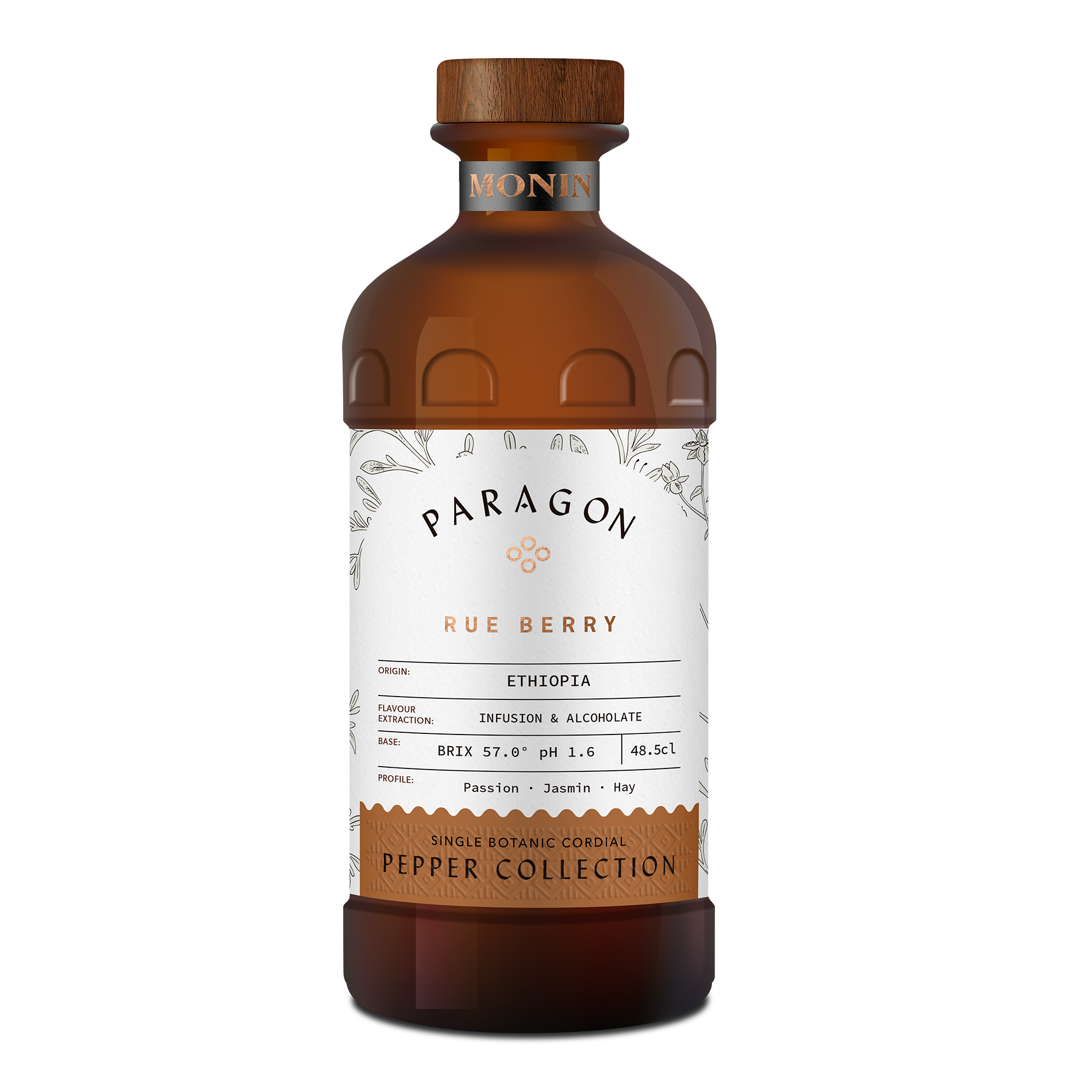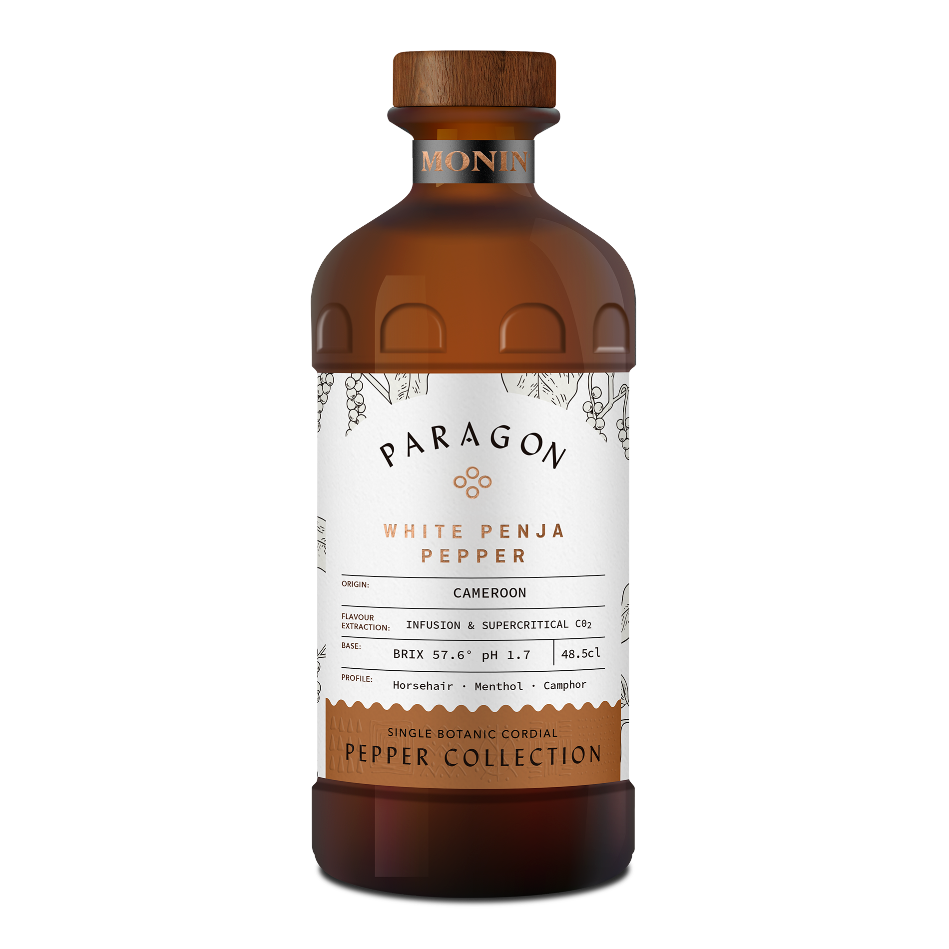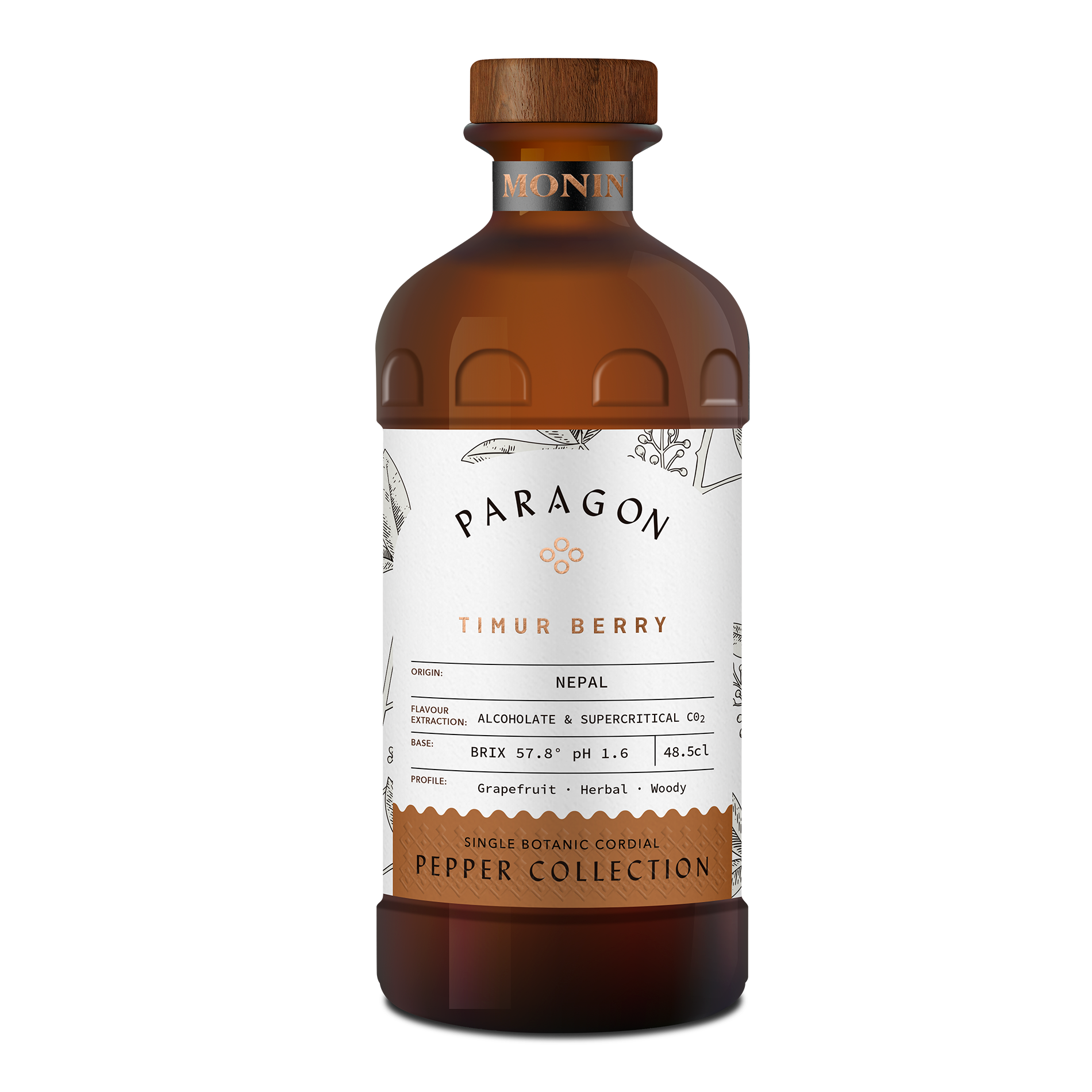 MONIN offre désormais ces saveurs exceptionnelles aux experts du cocktail.Pensée comme une encyclopédie botanique, l’équipe projet a parcouru chaque continent à la rencontre des communautés, de leur culture et de leurs coutumes ancestrales pour dénicher ces ingrédients rares.Trois variétés composent cette première collection consacrée aux poivres et aux baies, présentées dans un flacon de 48,5 cl : le Poivre Blanc de Penja originaire du Cameroun, la baie de Rue d’Ethiopie et la baie de Timur du Népal.Pour retranscrire la complexité des arômes de chaque espèce botanique, nous avons combiné plusieurs technologies d’extraction. Ainsi, le CO2supercritique, unique dans l’industrie des boissons, côtoie des process plus classiques comme l’infusion et l’alcoolat.La subtile combinaison de ces procédés permet de capter chacune des parties du profil aromatique pour restituer le parfum originel des aromates.Nous avons également utilisé de l’acide gluconique, présent naturellement dans le miel d’Okudu Cameroun, pour offrir une longueur en bouche exceptionnelle et sans note additionnelle.Alex KRATENA, investi depuis l’origine du projet, a voyagé au Cameroun avec l’équipe à la recherche de ces ingrédients incroyables : « PARAGON est une nouvelle génération inédite de cordial botanique. Ces saveurs rares et précieuses nous ouvrent une palette incroyable de créations possibles. C’est très excitant d’imaginer les cocktails que les bartenders peuvent réaliser avec. »