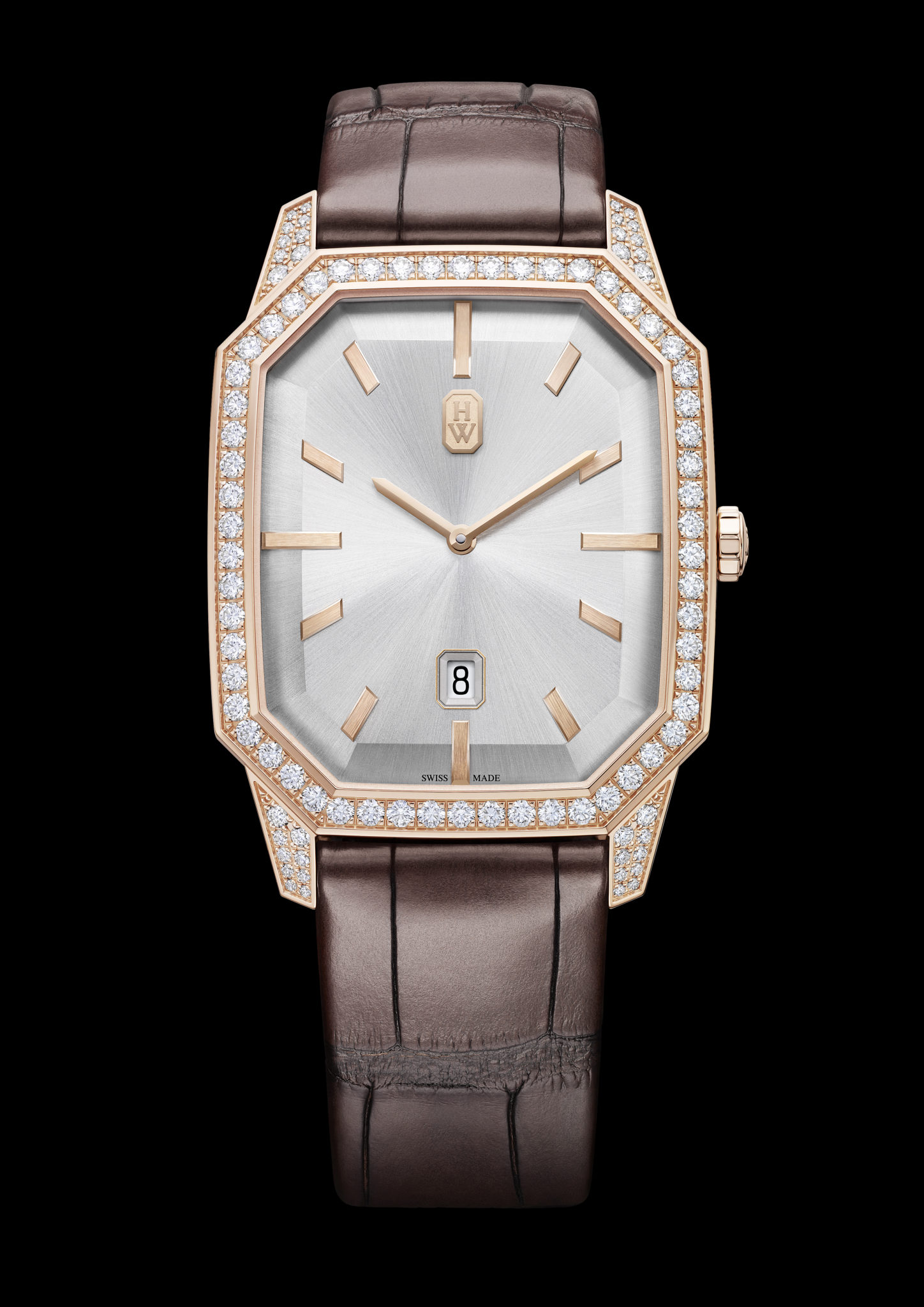 La collection Emerald comptait jusqu’alors des boîtes très fines et très féminines. Avec ces nouveautés, la dernière-née des collections horlogères Harry Winston comprend désormais une boîte plus imposante de 33 mm, disponible en or blanc et or rose 18 carats. Ses bords biseautés ainsi que sa finition soulignent son audacieuse architecture octogonale. Avec ses contours inclinés, le cadran gagne en profondeur et en volume, à l’image des facettes d’une pierre précieuse. La classique applique Emeraude Harry Winston en or, à midi, fait face à un guichet de date à 6 heures, biseauté, et reprenant la forme octogonale chère à M. Winston.