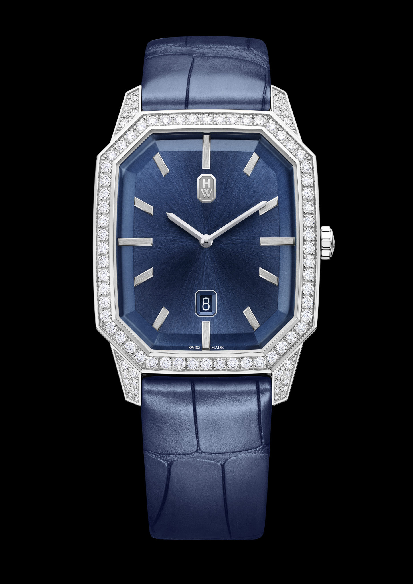 Toutes les créations Emerald 33mm sont assorties d’un bracelet en cuir d’alligator élégant, bleu pour les montres en or blanc et brun pour celles en or rose. Les bracelets se fixent au poignet à l’aide d’une boucle ardillon en or 18 carats. Cette boucle revisitée porte la gravure « Harry Winston » et reprend les bords biseautés de la boîte et du cadran.