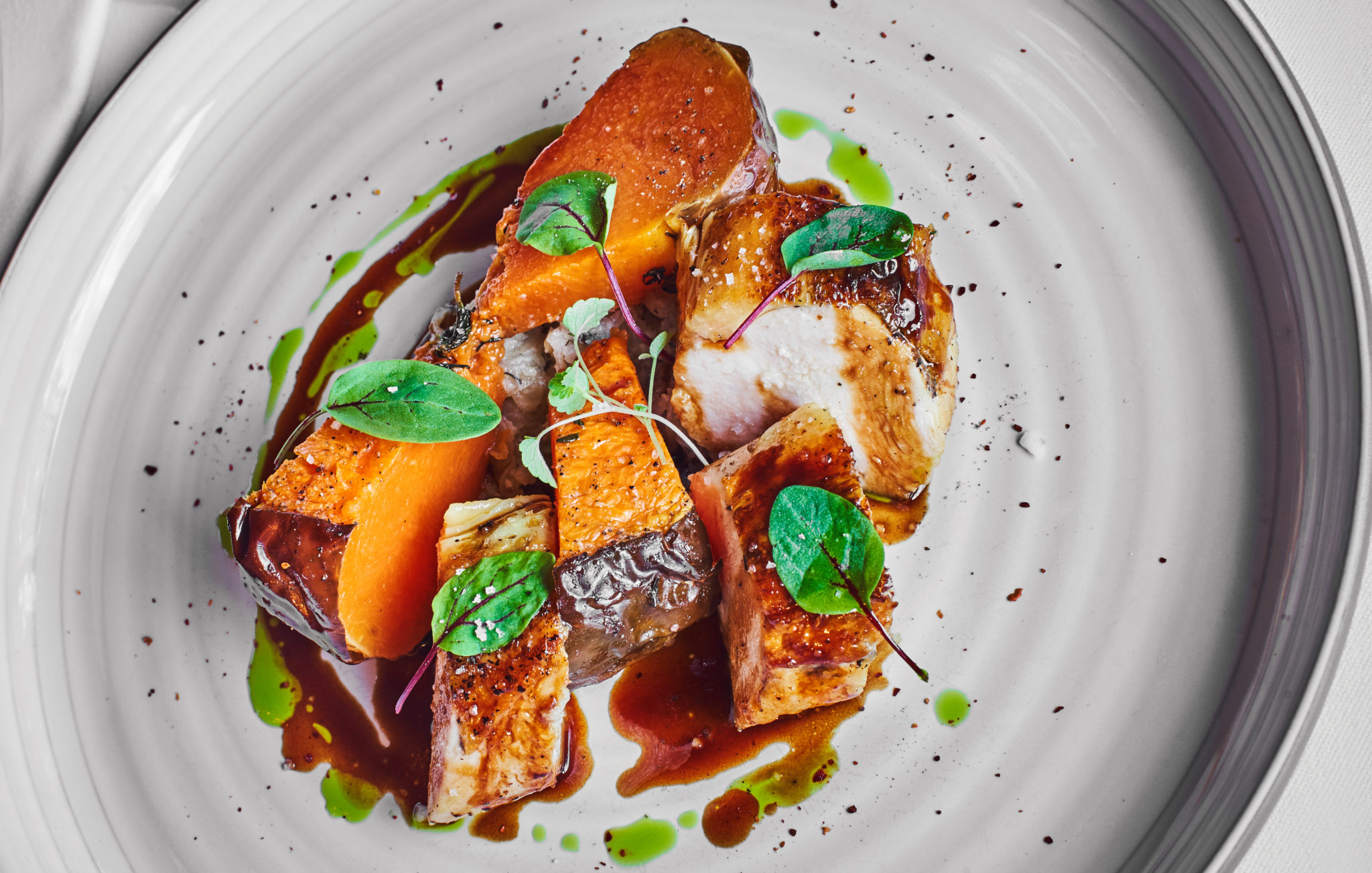 Volaille jaune contisée à la truffe noire, confit d’oignons et potiron, jus de volaille truffée