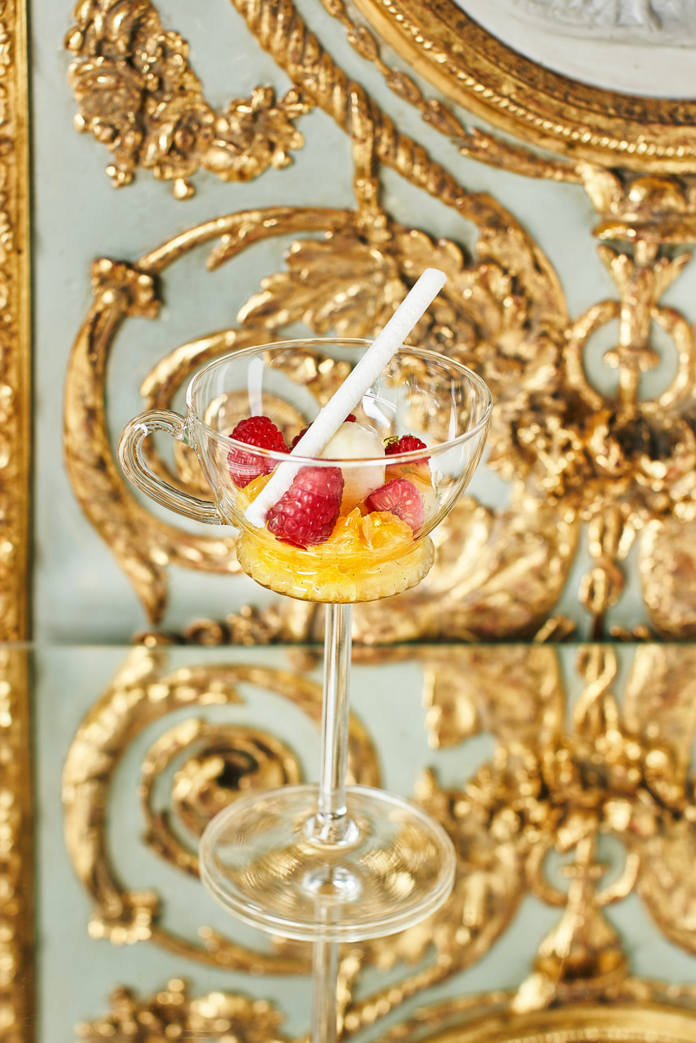 Suprêmes d’oranges et citron vert, sorbet citron, meringue croustillante coco, framboise fraîche