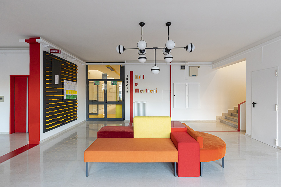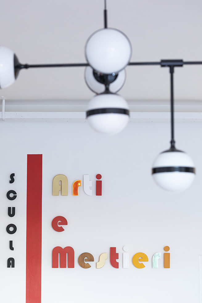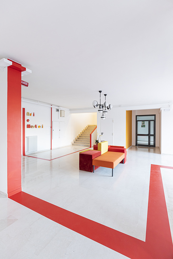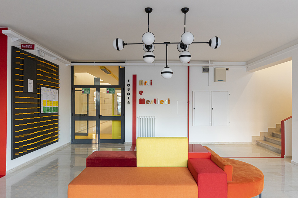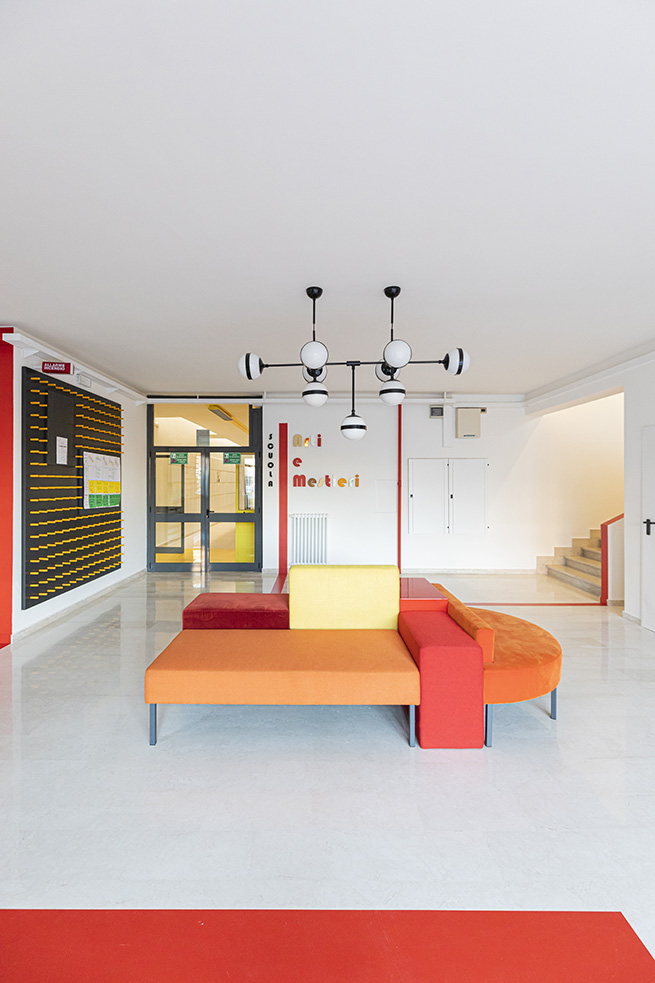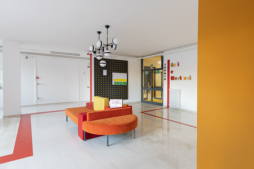 Une porte rouge s’ouvre sur un spacieux hall, accueillant les visiteurs, avec l’inscription « Scuola di Arti e Mestieri » (Ecole des Arts et Métiers) réalisée avec plusieurs matériaux différents pour évoquer la variété des sujets d’apprentissage et d’opportunités de développement qui sont offerts par le centre.