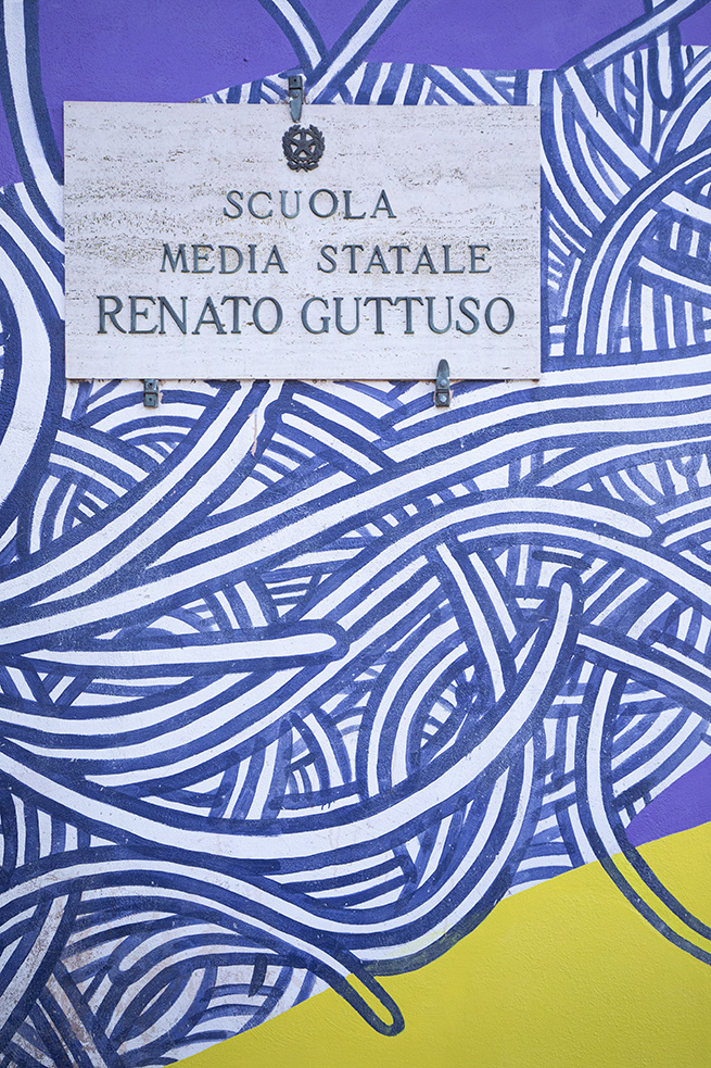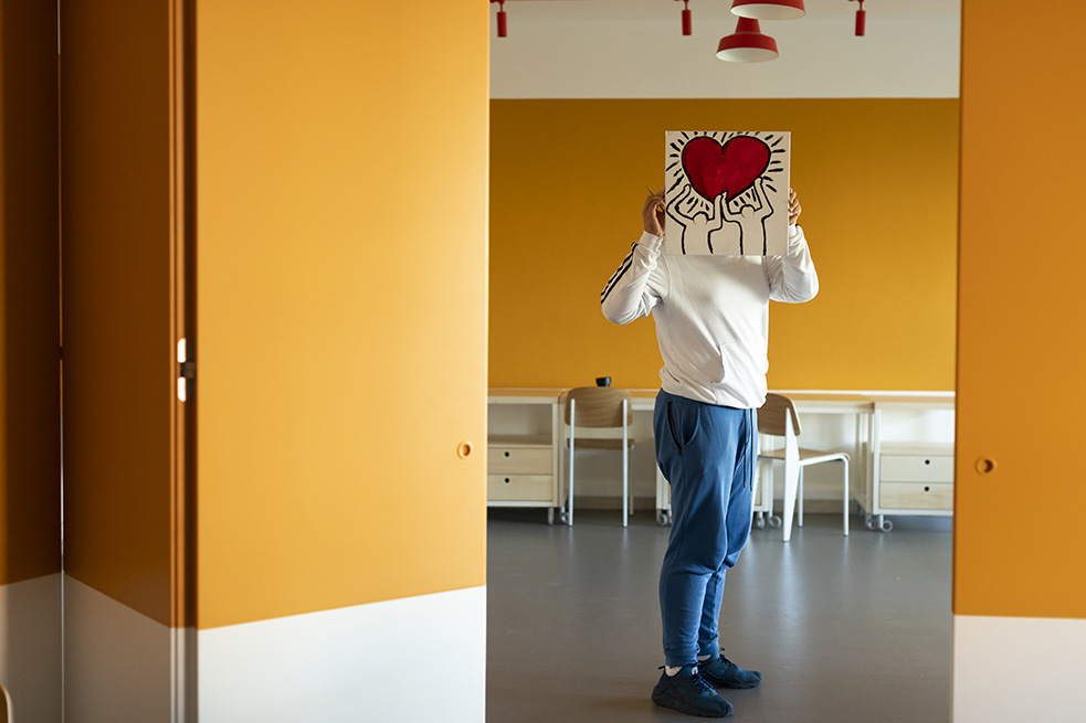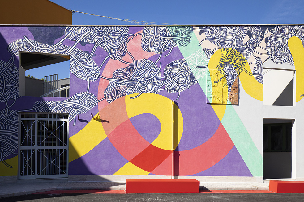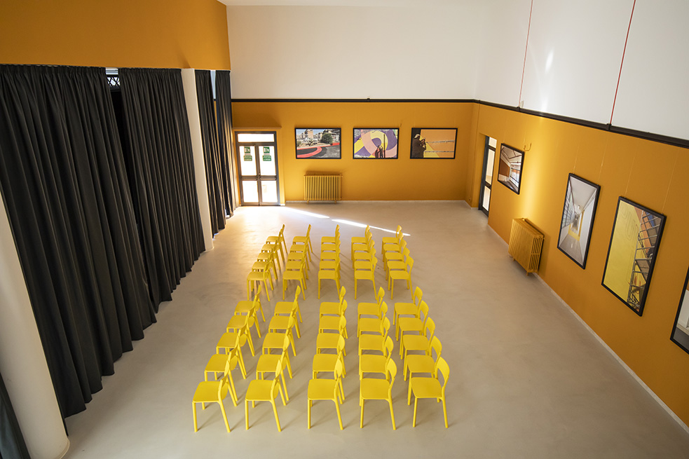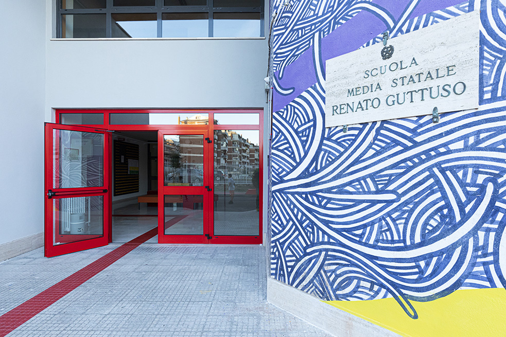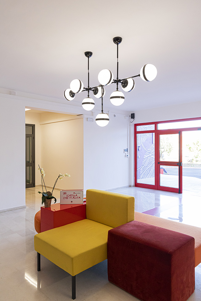 Une porte rouge s’ouvre sur un spacieux hall, accueillant les visiteurs, avec l’inscription « Scuola di Arti e Mestieri » (Ecole des Arts et Métiers) réalisée avec plusieurs matériaux différents pour évoquer la variété des sujets d’apprentissage et d’opportunités de développement qui sont offerts par le centre.