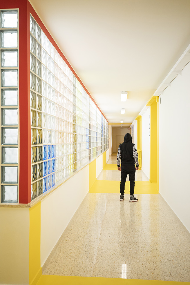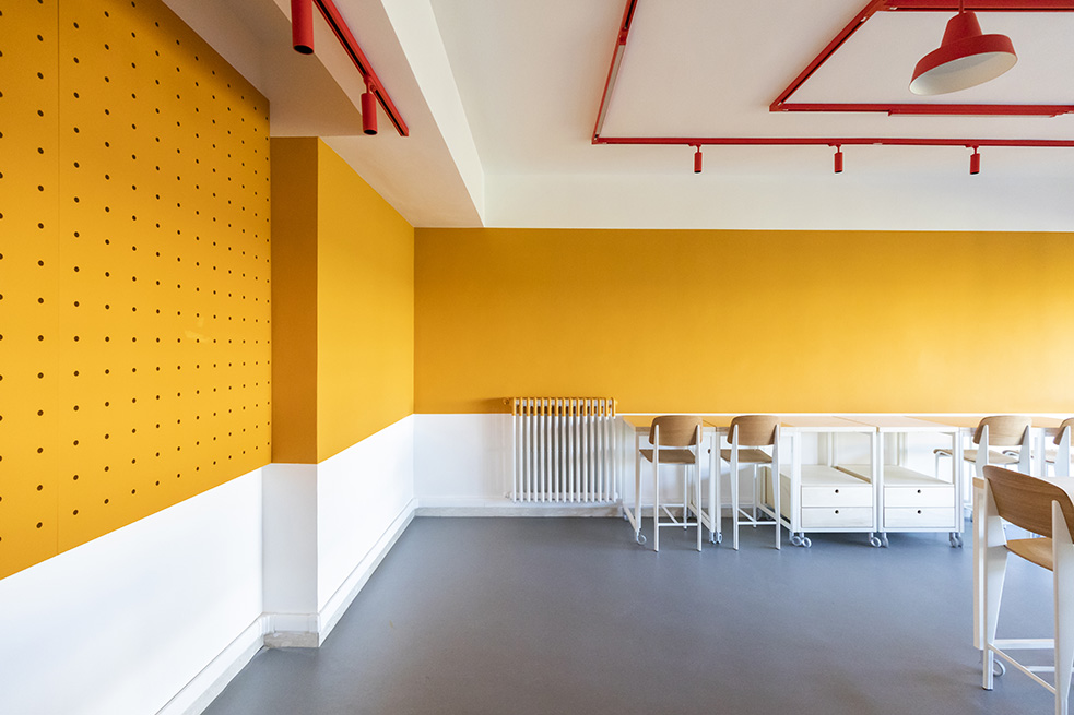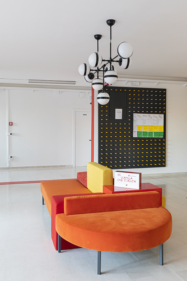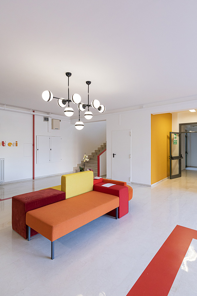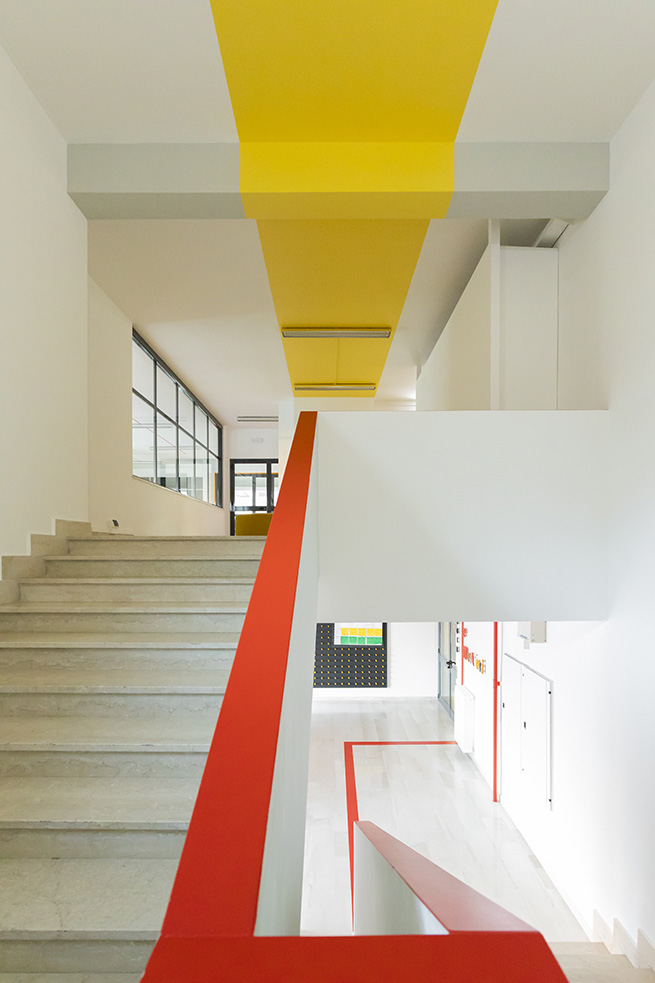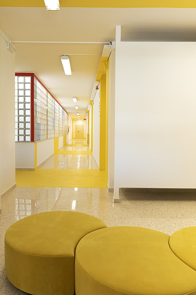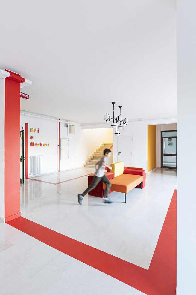 Le rouge est un des leitmotivs de ce lieu : des lignes rouges sur le sol servent de guides et expriment de manières métaphoriques la découverte du talent de élèves et de manière concrète, pour indiquer le chemin vers les 4 laboratoires multifonctionnels, le laboratoire de musique et la salle informatique, tous peints dans une teinte jaune soleil intense.