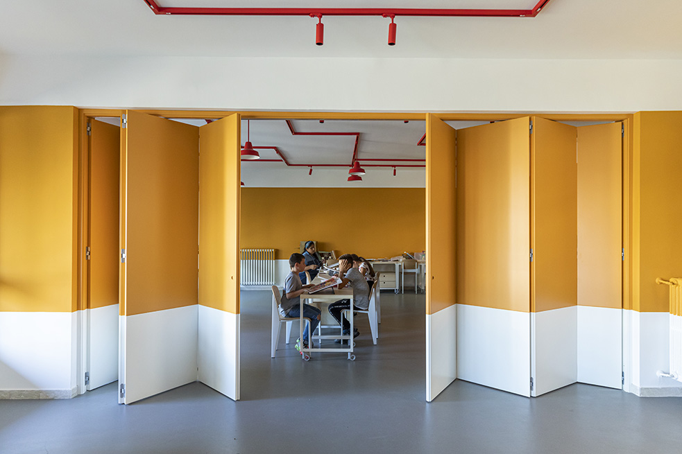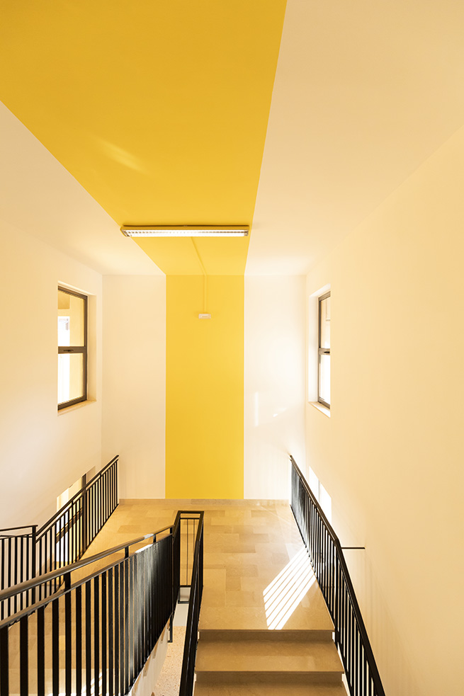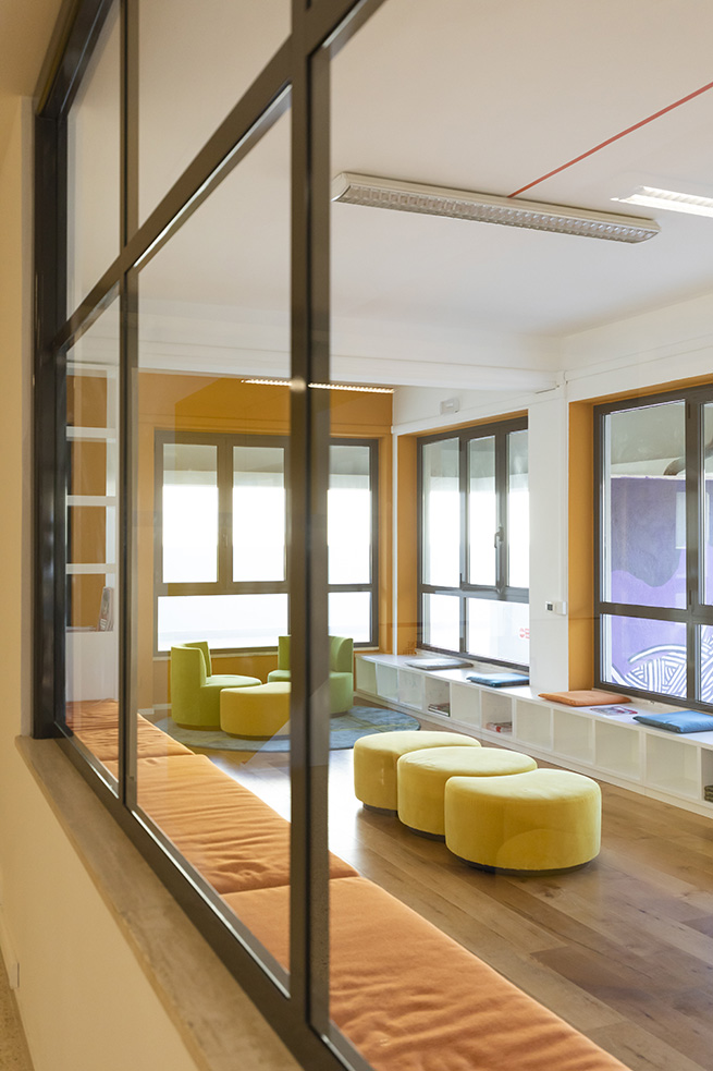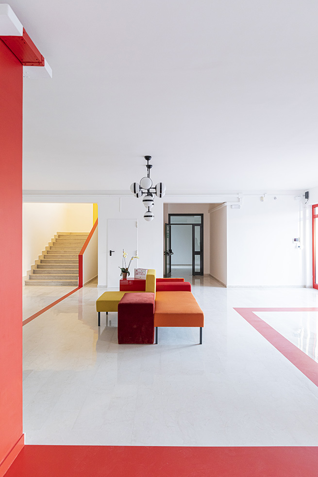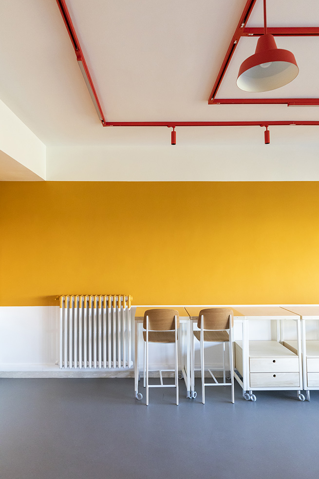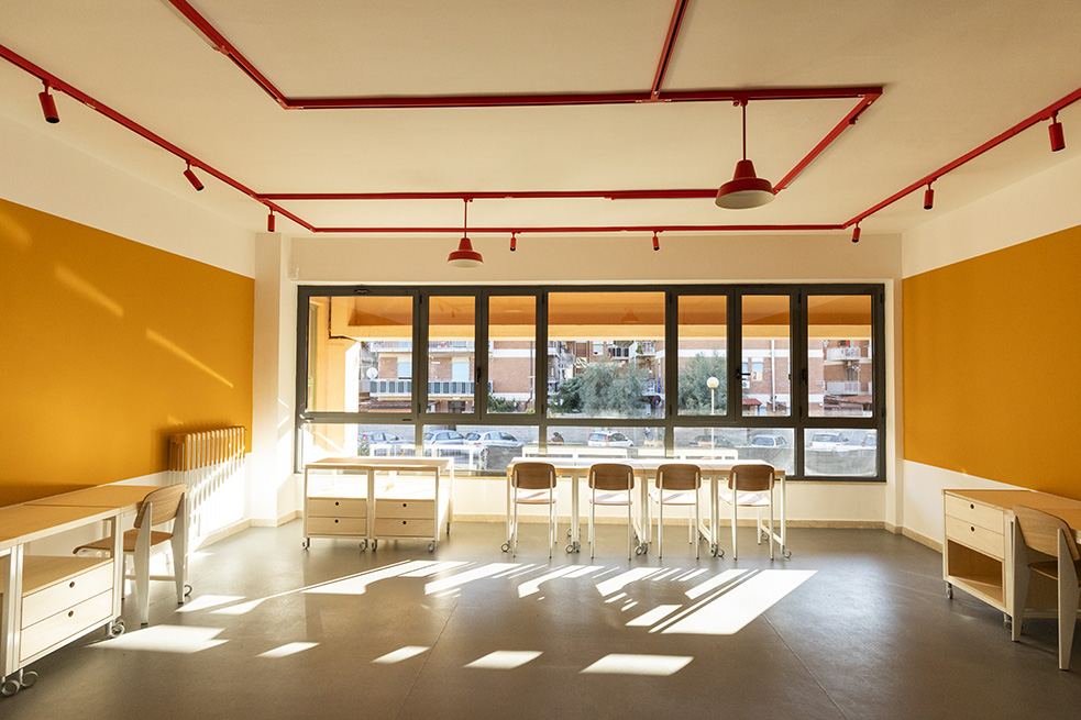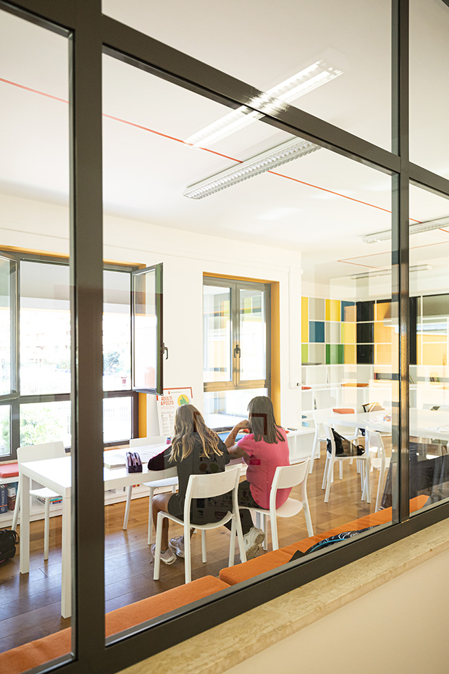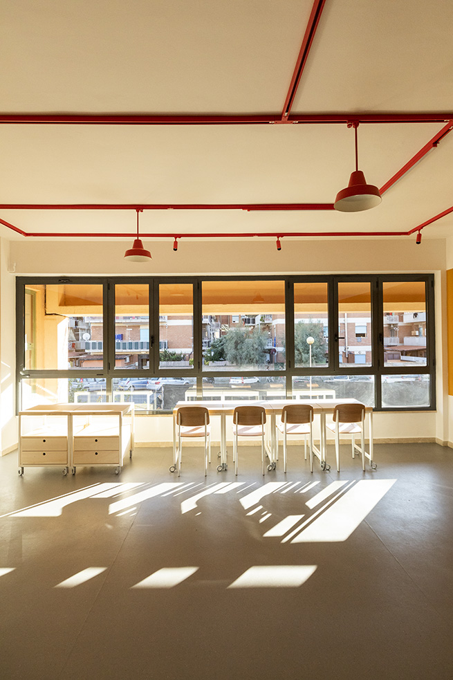 Le rouge est un des leitmotivs de ce lieu : des lignes rouges sur le sol servent de guides et expriment de manières métaphoriques la découverte du talent de élèves et de manière concrète, pour indiquer le chemin vers les 4 laboratoires multifonctionnels, le laboratoire de musique et la salle informatique, tous peints dans une teinte jaune soleil intense.