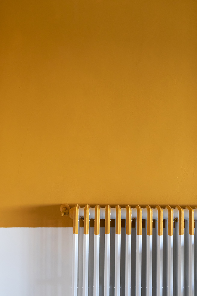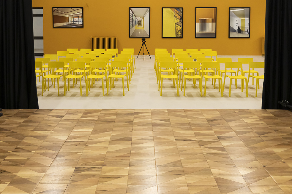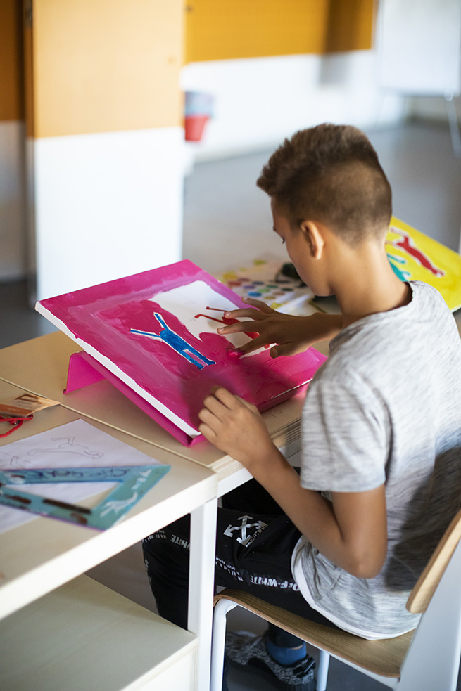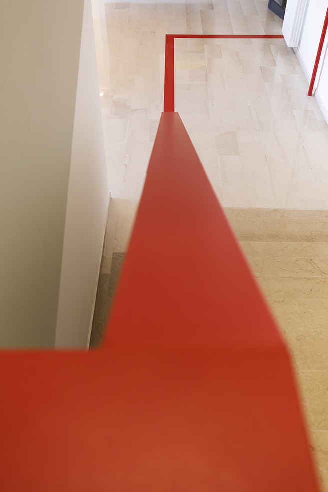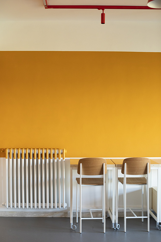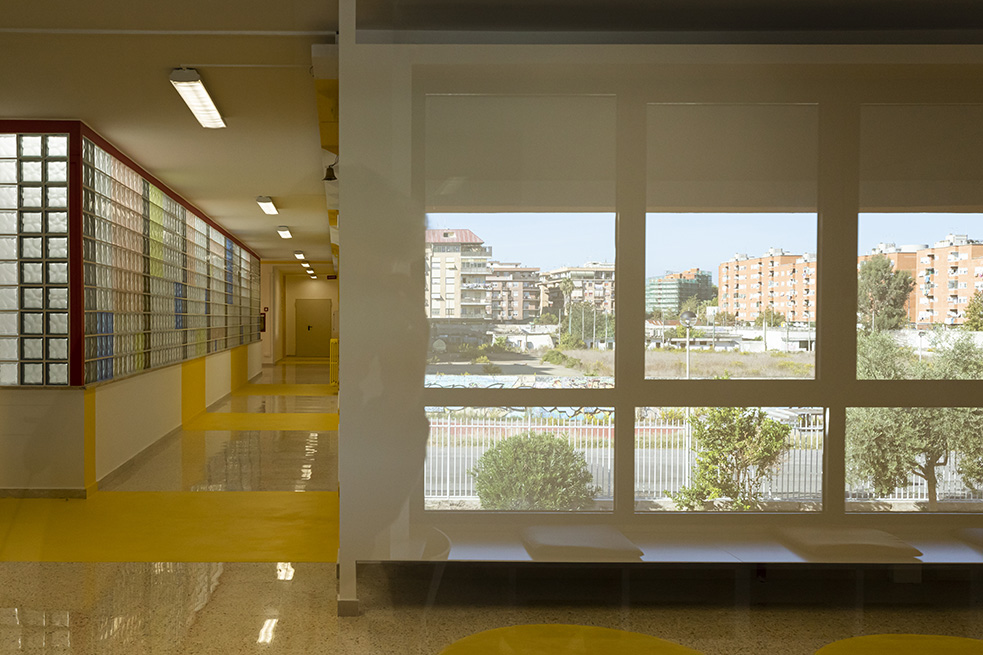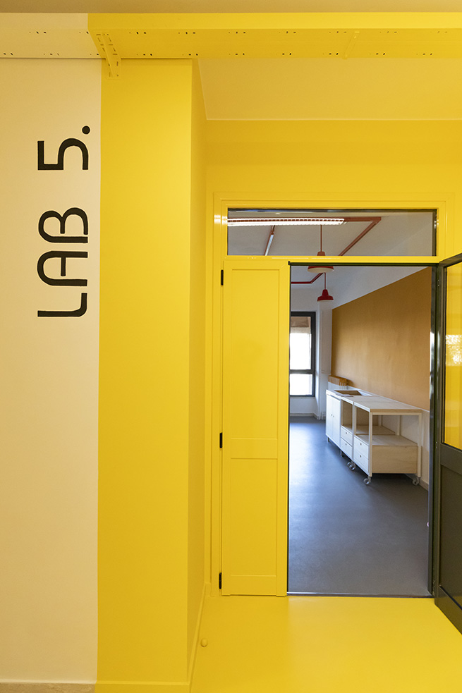Le rouge est un des leitmotivs de ce lieu : des lignes rouges sur le sol servent de guides et expriment de manières métaphoriques la découverte du talent de élèves et de manière concrète, pour indiquer le chemin vers les 4 laboratoires multifonctionnels, le laboratoire de musique et la salle informatique, tous peints dans une teinte jaune soleil intense.