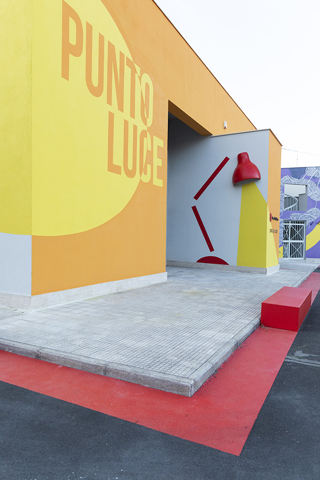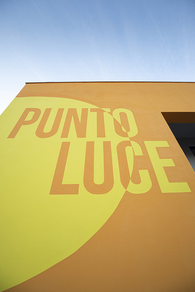 Lorsque l’on entre au « Punto Luce delle Arti » de Ostia, on embarque pour un voyage ; en commençant avec le logo lumineux de « Punto Luce de Bvlgari & Save the Children », situé au-dessus de l’entrée principale du bâtiment, il se transforme en phare grâce à un effet 3D, symbole d’une lumière vive qui éclaire le chemin pour arriver à bon port.