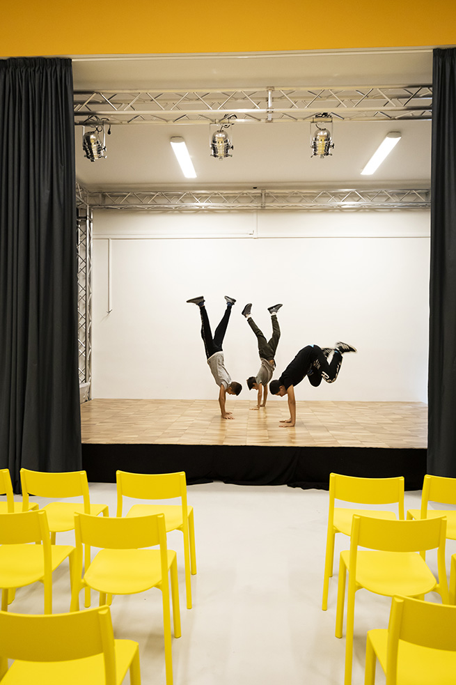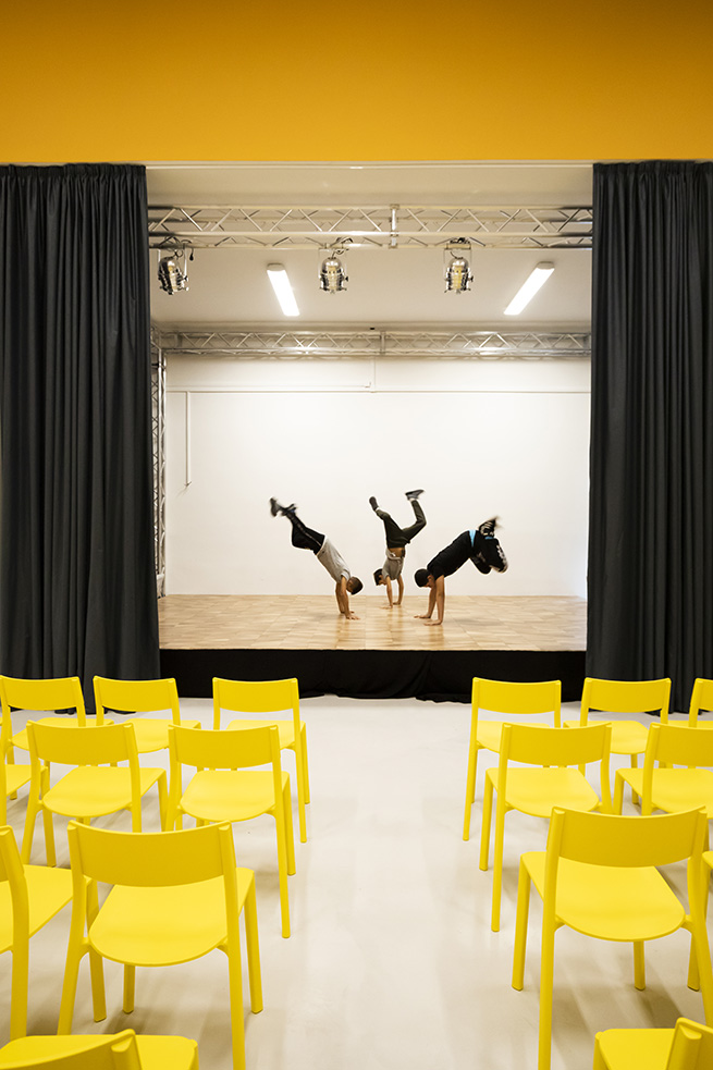 Ensuite, le couloir du centre « Punto Luce delle Arti » mène à une Galerie d’art – où 97 toiles blanches attendent d’être peintes par les Mani Intelligenti des élèves, se poursuit jusqu’à la Salle de Lecture, lieu calme et relaxant où les élèves sont encouragés à partager et à réfléchir sur leurs découvertes, et enfin aboutit à la Grande Salle, un espace polyvalent disposant d’un théâtre pour exprimer le talent des participants. Le plancher de la scène a été construit avec du bois recyclé de boutiques Bvlgari.