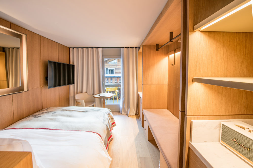 95 chambres et suites entièrement repensées par le cabinet de design & d’architecture Kristian Gavoille & Valérie Garcia, spécialiste des nouveaux nomadismes. Le style est délibérément alpin, chaleureux, audacieux : les codes « montagne » – feu + tapis moelleux + rouge + bois – sont bel et bien là, twistés pour atteindre l’harmonie entre air du temps et tradition. Au Schweizerhof Zermatt, le luxe assume la simplicité et le cool s’associe au raffinement. Les espaces sont ouverts pour favoriser le partage, partout, tout le temps. Les échanges et la fluidité. Mini-salons informels pour se retrouver à tout moment, vaste « show kitchen » avec vue sur le chef et sa brigade au travail autour d’une carte exclusive, livres reliés de cuir dans tous les espaces de l’hôtel, spa et piscine intérieure, etc.