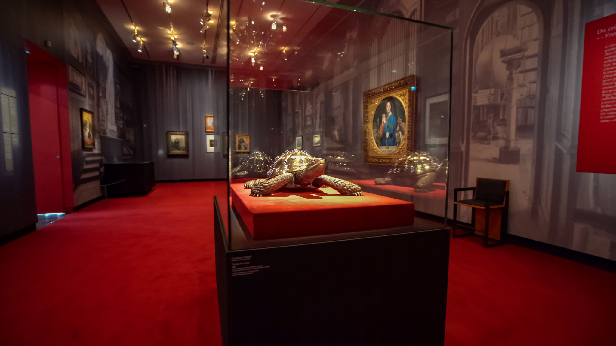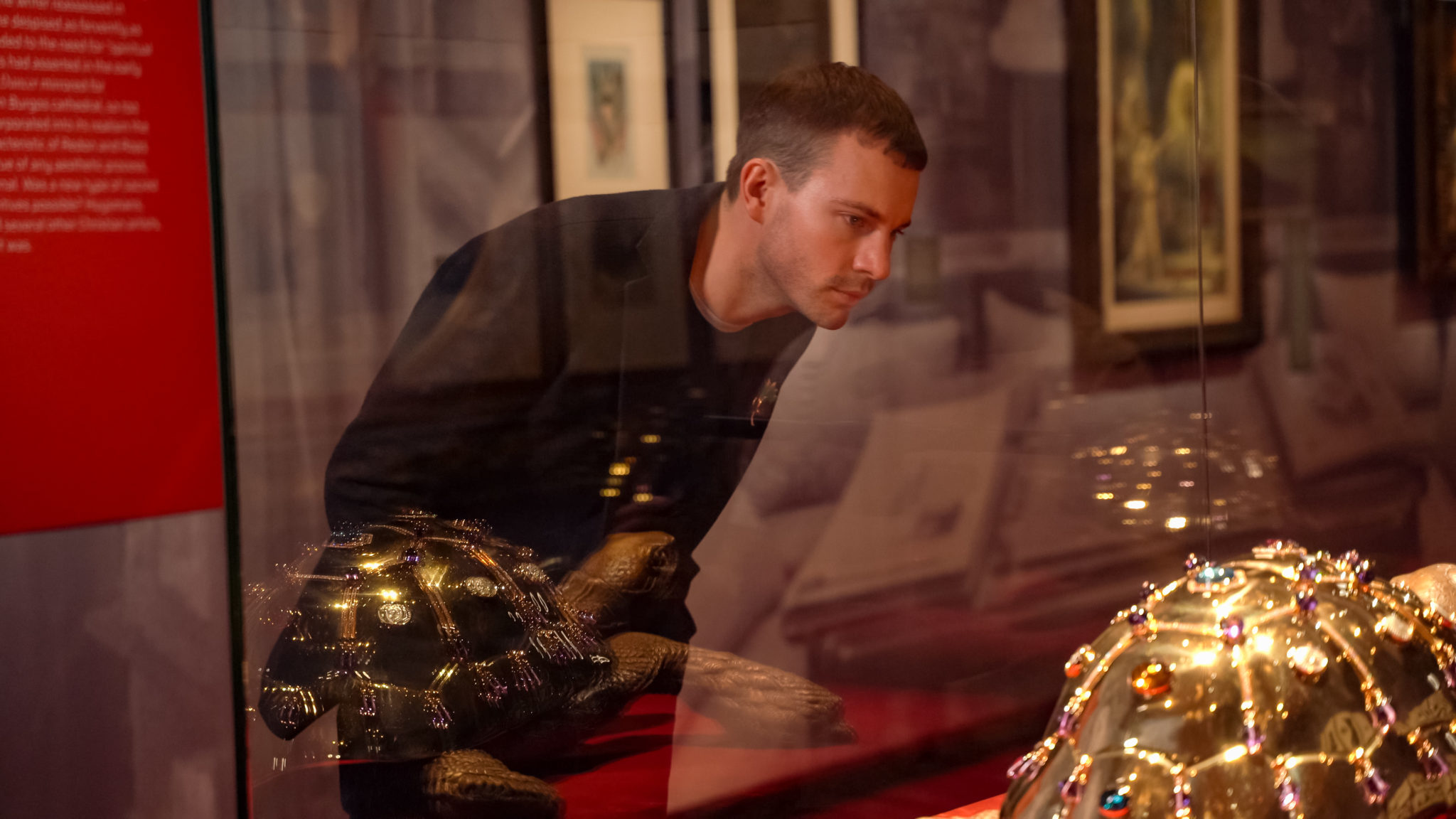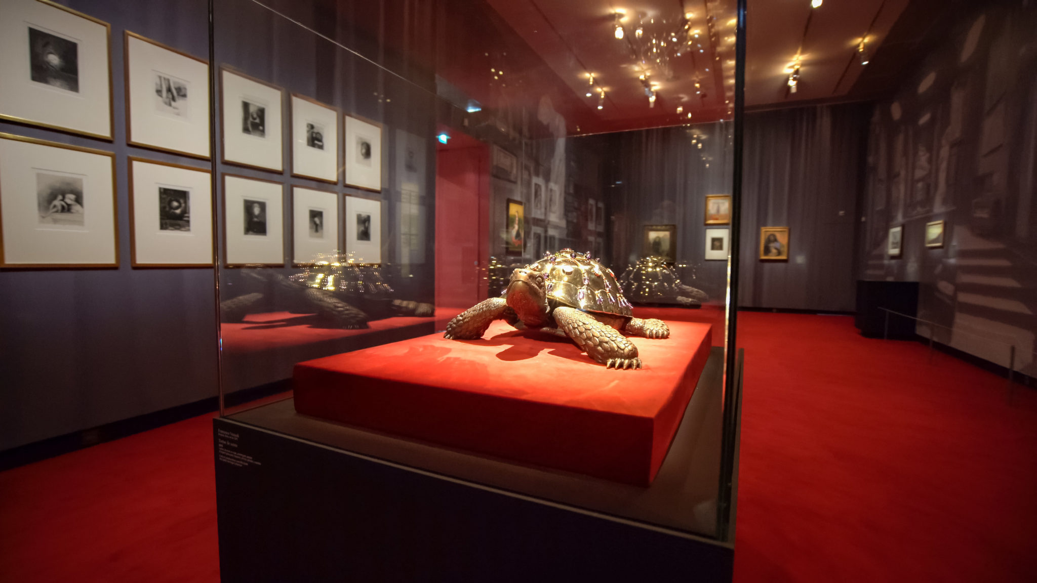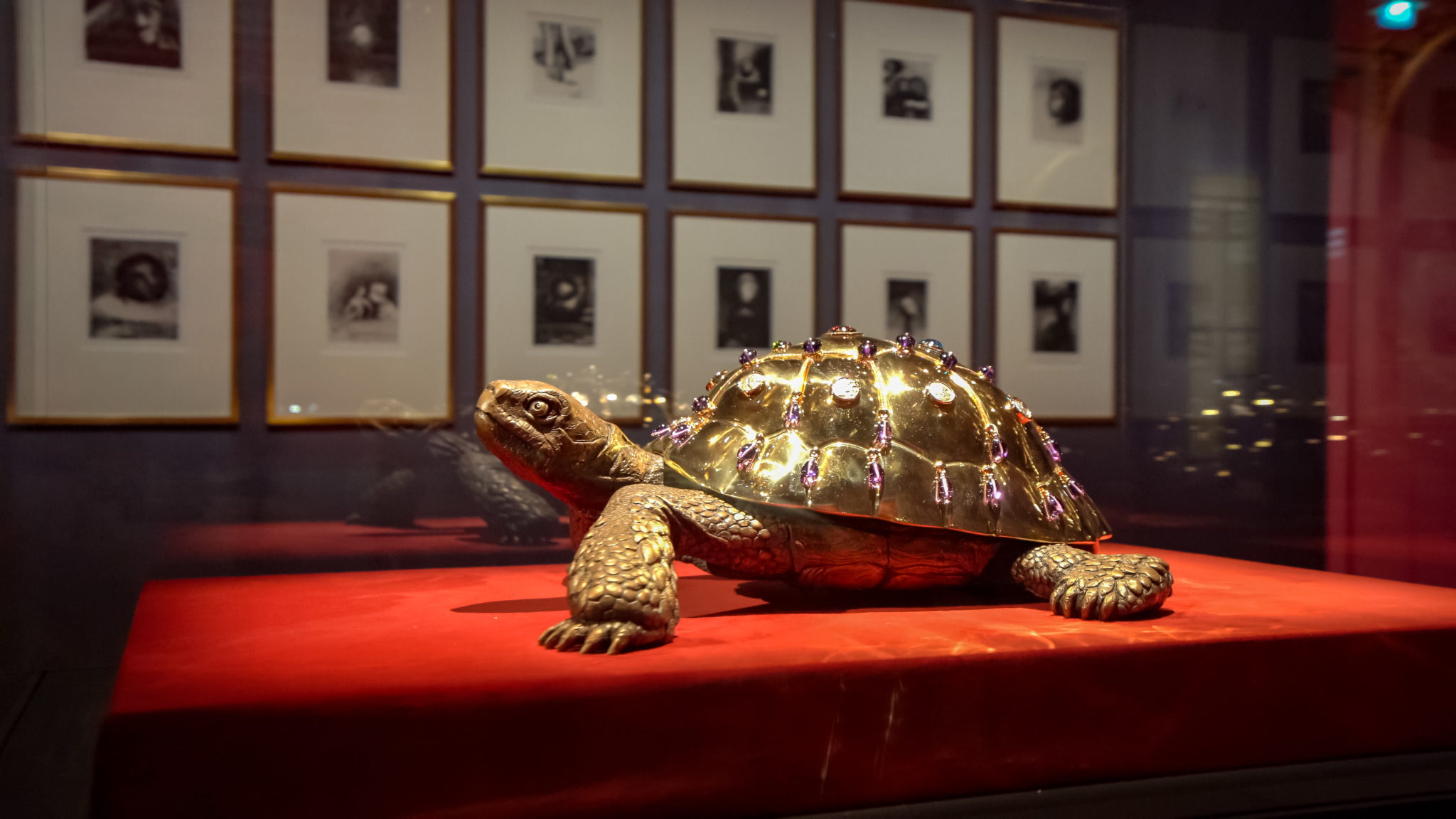 La sculpture, intitulée « Tortue de soirée » représente une tortue dont la carapace en laiton est sertie de pierres précieuses, et prend son inspiration dans le roman du Joris-Karl Huysmans « A rebours » dans lequel le protagoniste Jean Des Esseintes fuit les hypocrisies et les conventions de la société pour se réfugier dans une résidence à l’écart du monde où il se consacre à une vie d’auto-indulgence, d’hédonisme et de quête d’esthétique absolue. Il s’entoure d’objets, de livres et de mobilier reflétant ses goûts, ainsi que d’une tortue de compagnie, qu’il décore de gemmes scintillantes afin qu’elle soit conforme à sens aiguisé du style.