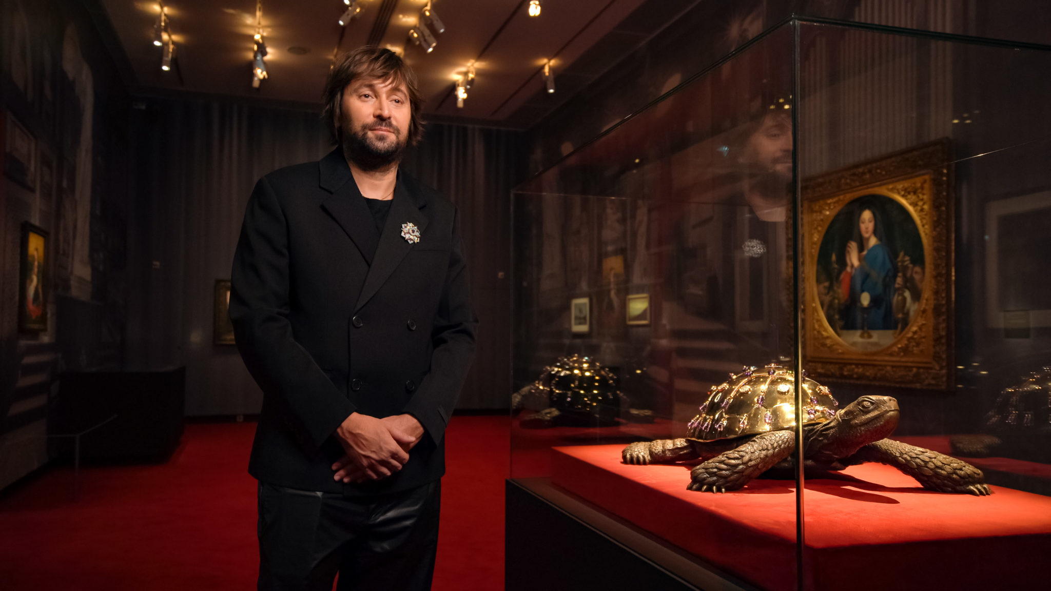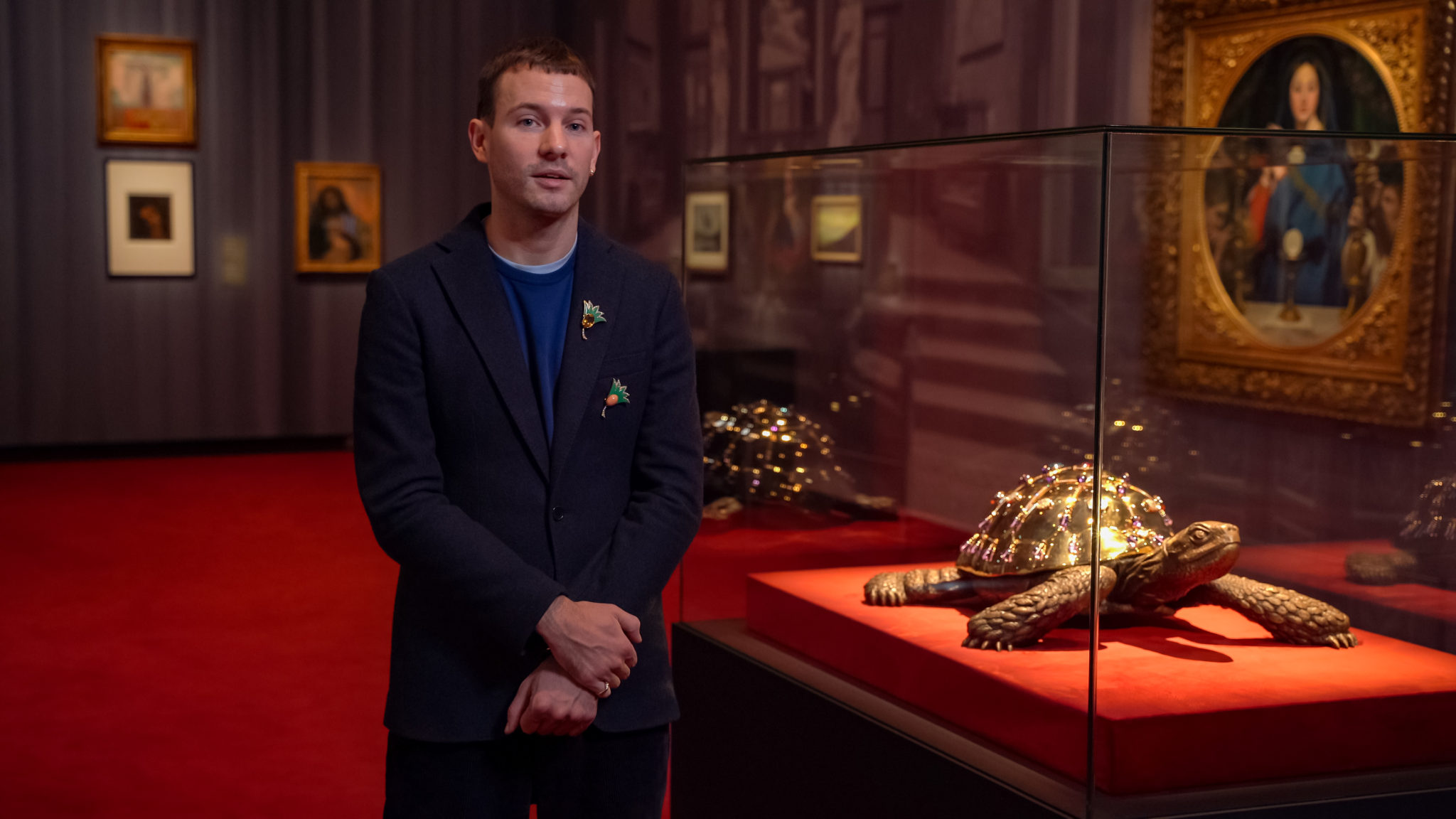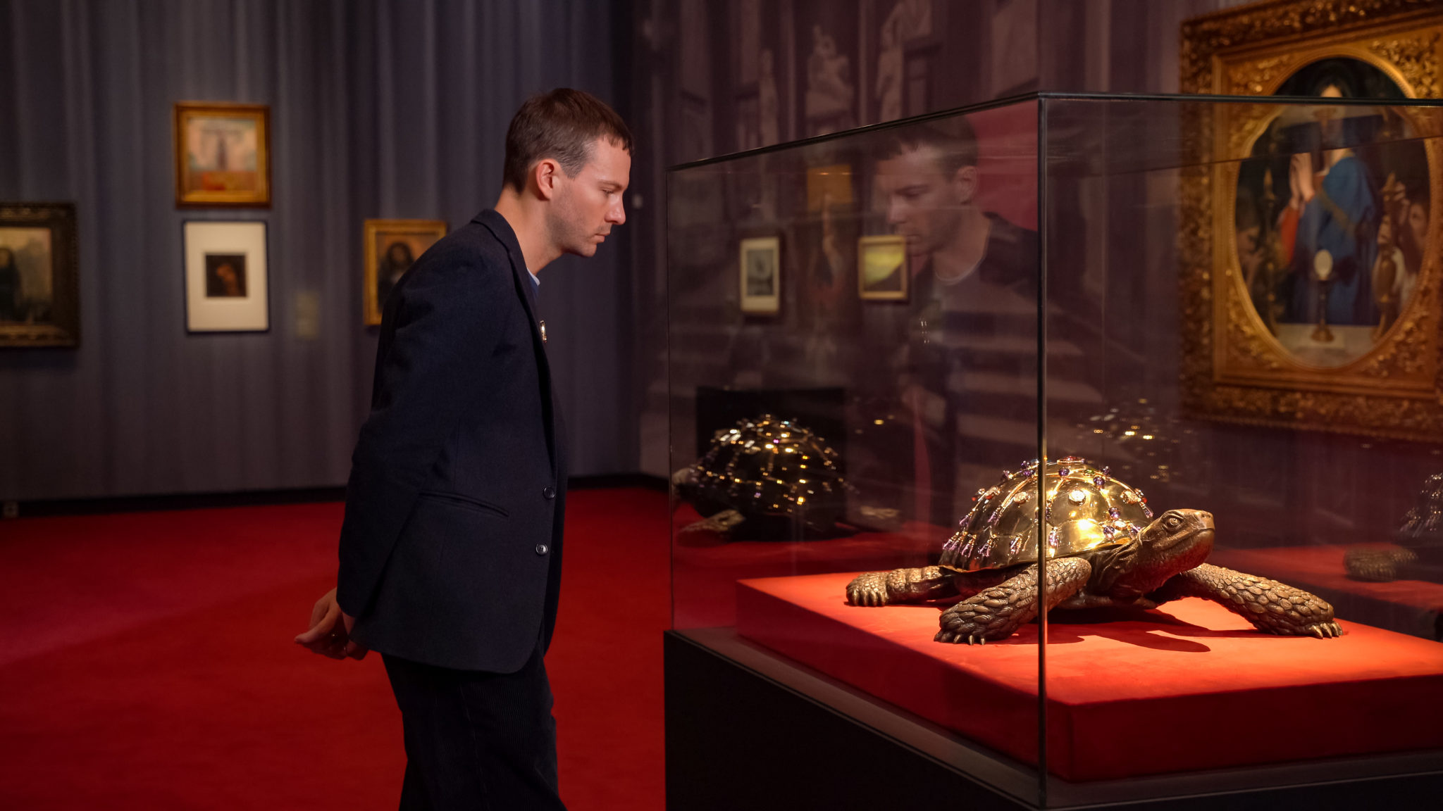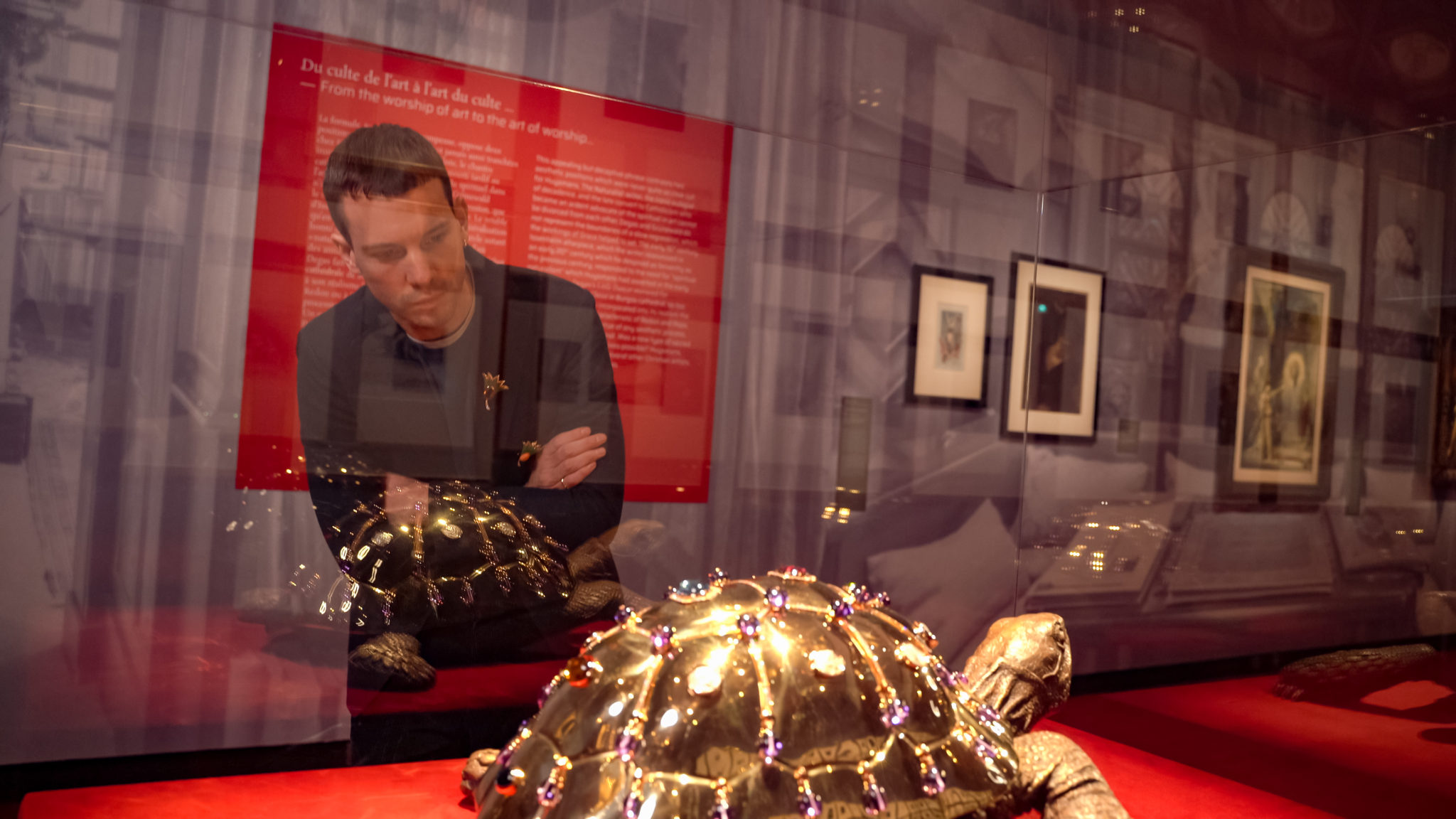 La sculpture, intitulée « Tortue de soirée » représente une tortue dont la carapace en laiton est sertie de pierres précieuses, et prend son inspiration dans le roman du Joris-Karl Huysmans « A rebours » dans lequel le protagoniste Jean Des Esseintes fuit les hypocrisies et les conventions de la société pour se réfugier dans une résidence à l’écart du monde où il se consacre à une vie d’auto-indulgence, d’hédonisme et de quête d’esthétique absolue. Il s’entoure d’objets, de livres et de mobilier reflétant ses goûts, ainsi que d’une tortue de compagnie, qu’il décore de gemmes scintillantes afin qu’elle soit conforme à sens aiguisé du style.