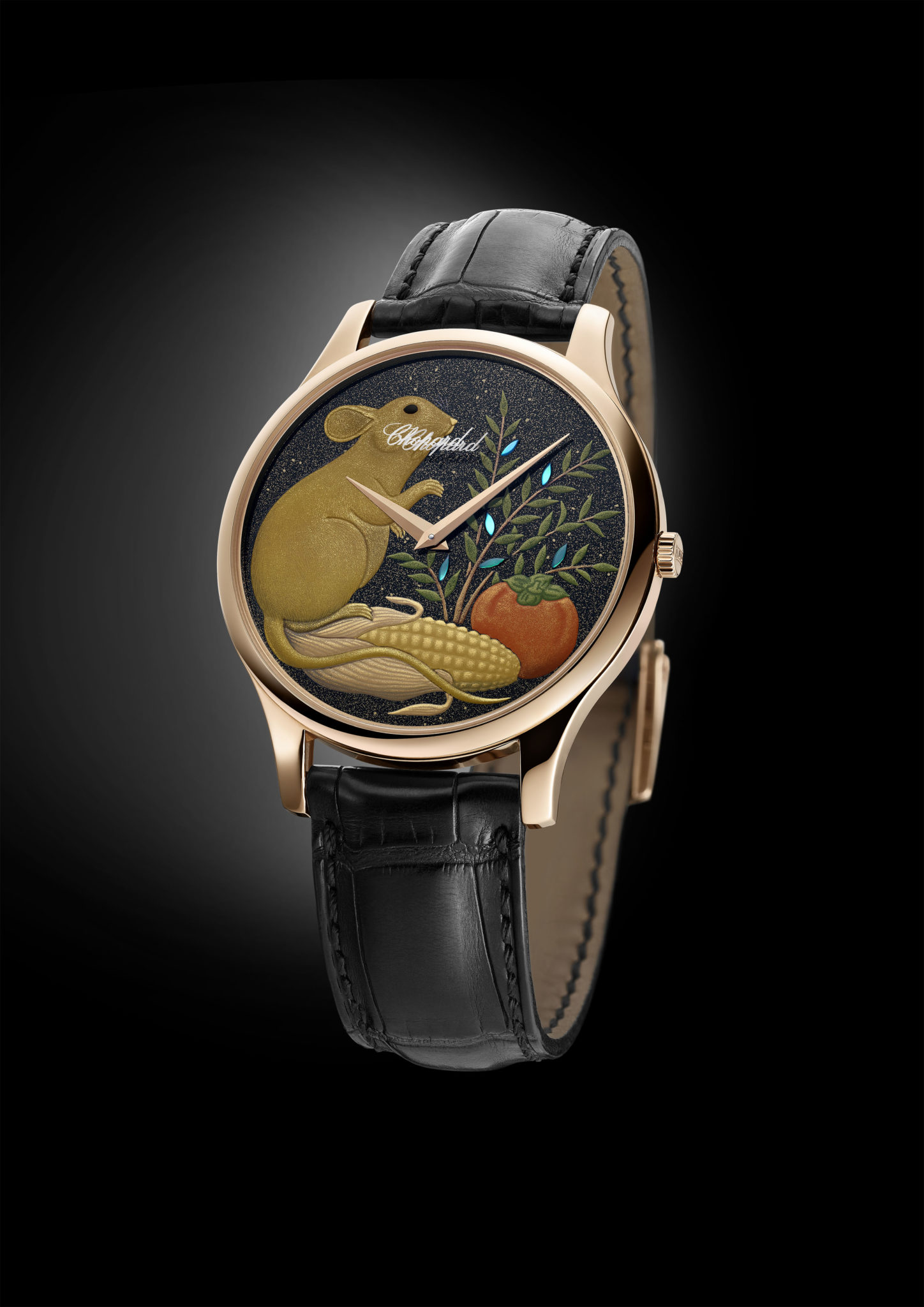 Chopard honore une nouvelle fois les traditions asiatiques en faisant appel à l’art ancestral du laquage japonais d’Urushi pour créer le cadran du garde-temps L.U.C XP Urushi Year of the Rat. Cette œuvre d’art met en évidence le thème du prochain signe du zodiaque dans le calendrier chinois traditionnel : le rat de métal, réputé pour son intelligence et sa perspicacité. Les 88 exemplaires de cette montre en or rose 18 carats, raffinée et puissamment symbolique, sont animés par un calibre extrafin réalisé par les ateliers de Chopard Manufacture : le L.U.C 96.17-L.